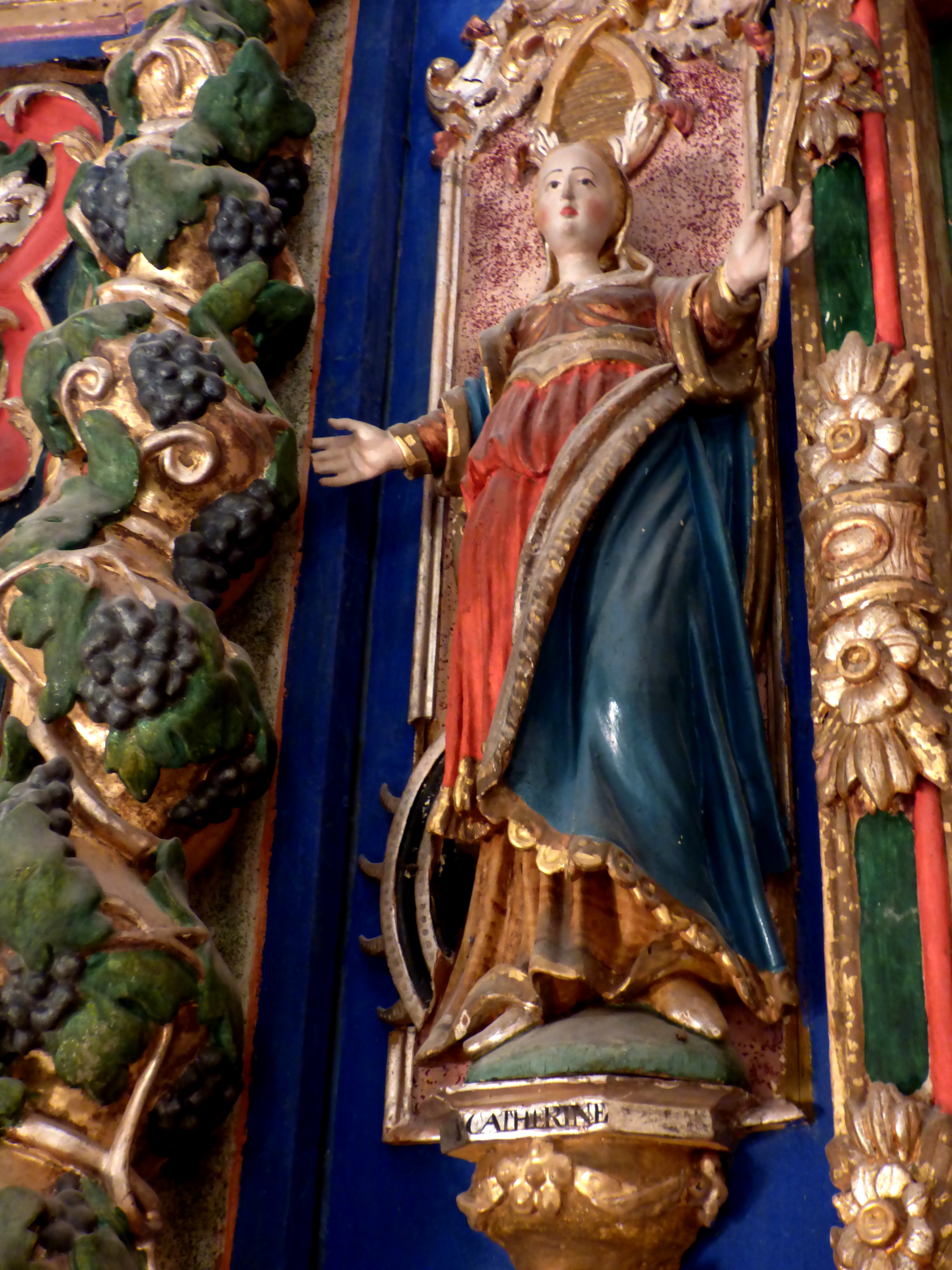 Sainte Catherine se trouve au sommet du retable principal de l’église de Peisey. une autre statue est accrochée à un pilier de la nef.