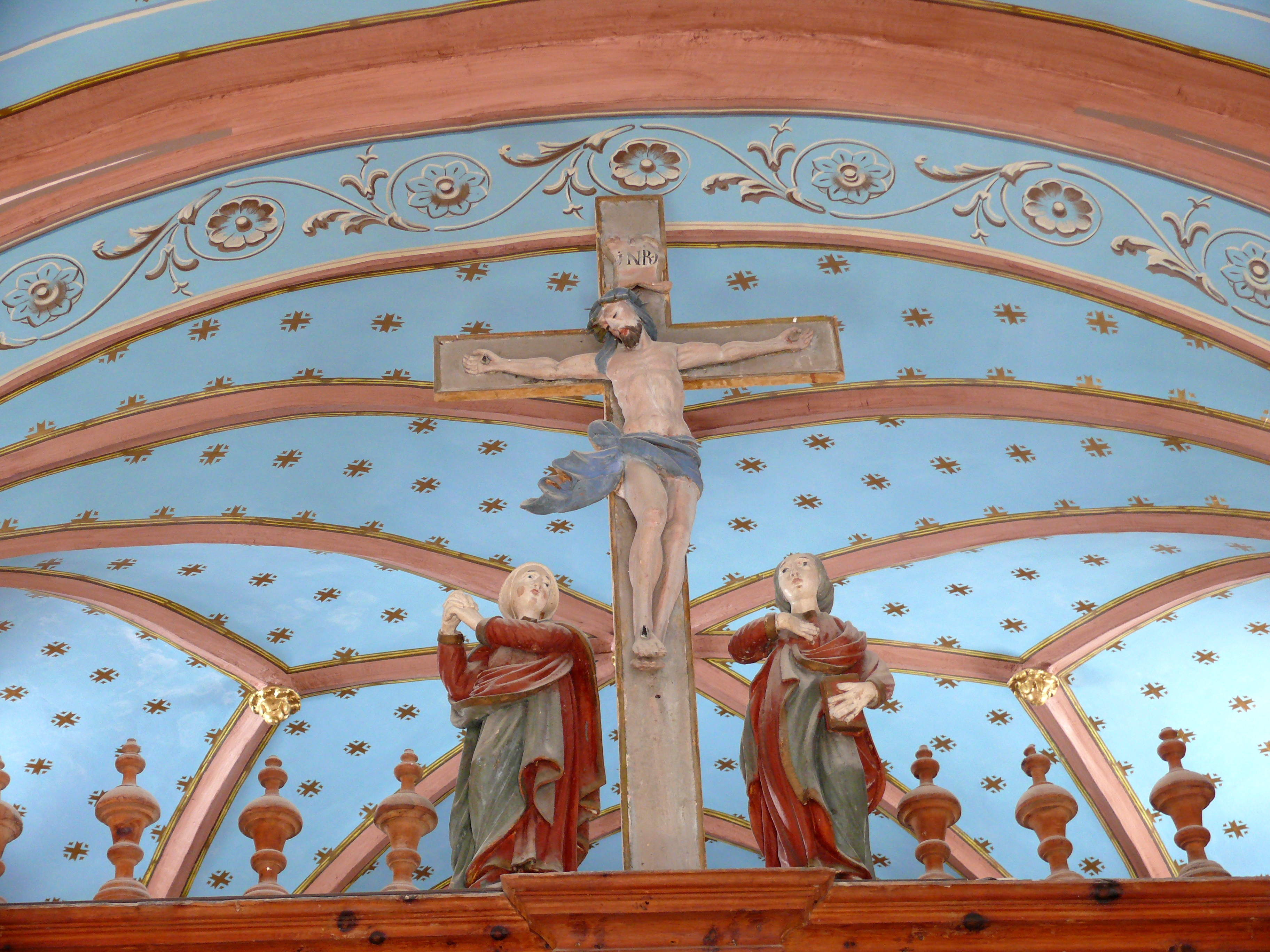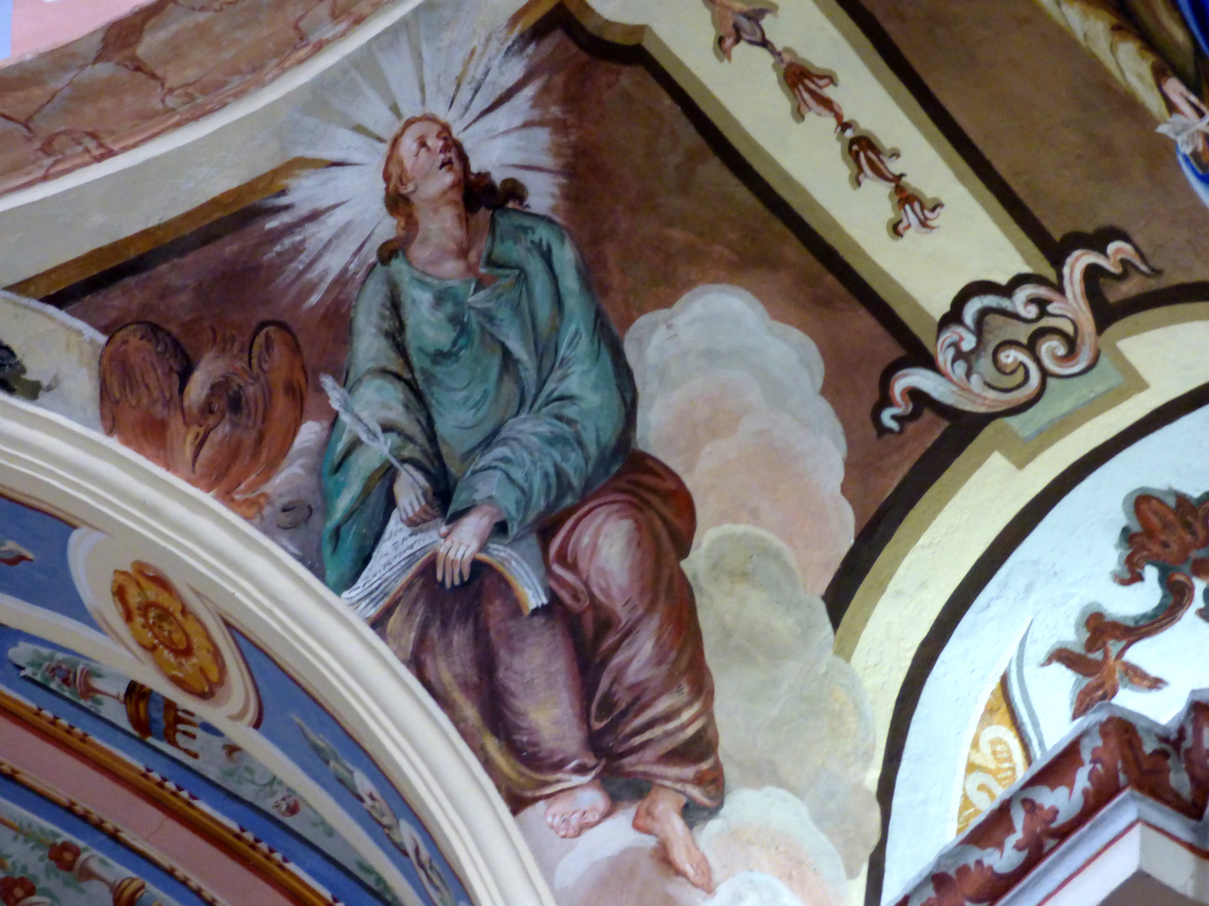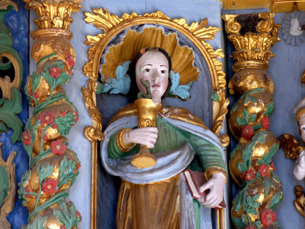 Saint Jean, le disciple préféré de Jésus, est présent dans toutes les églises, au pied du crucifié, sur les poutres de gloires. ( ci après : poutre de gloire du Villaret de Peisey)