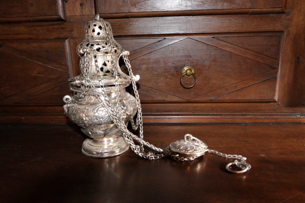 La navette à encens, haute de 9 cm et longue de 15 cm , en argent repoussé et ciselé, date de la seconde moitié du 18ième siècle.