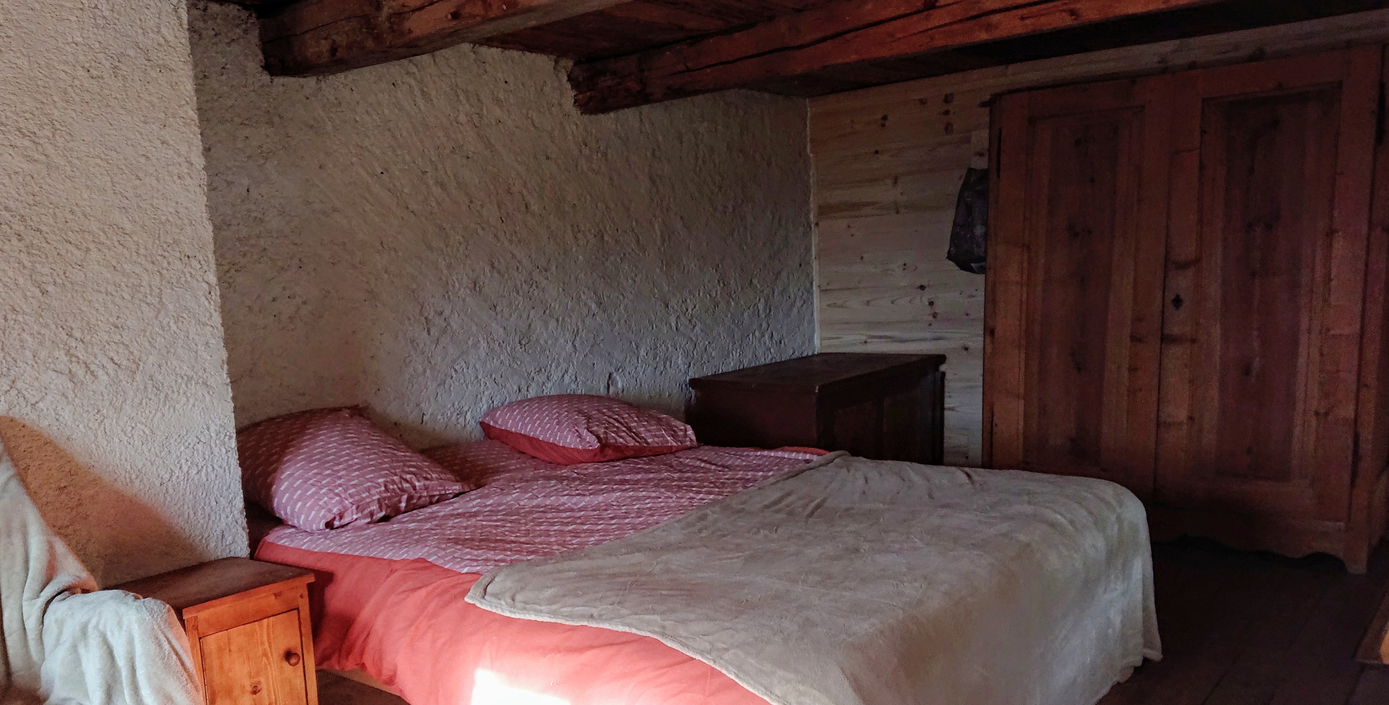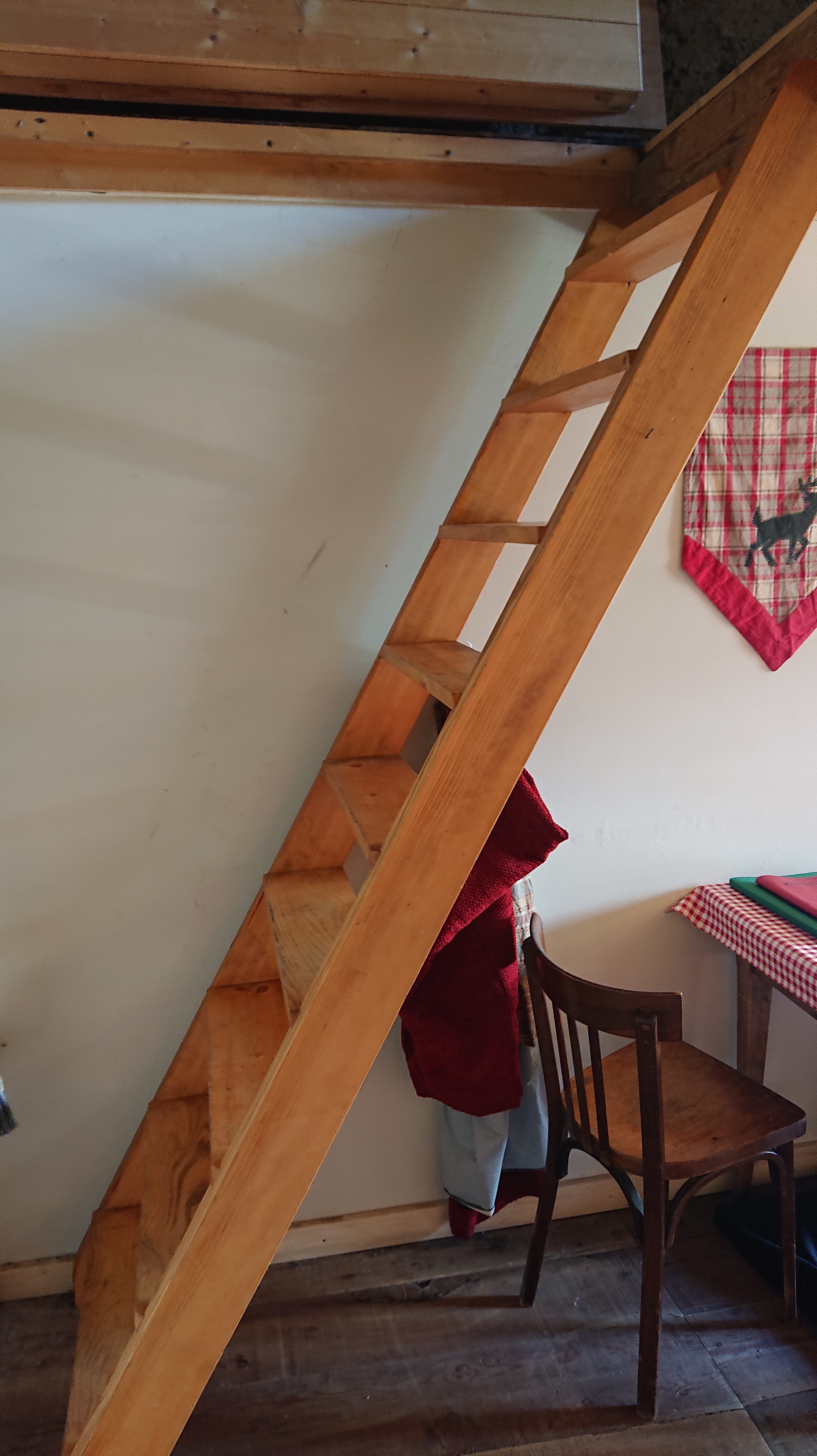 – au second ( escalier de meunier en intérieur) la chambre. Trappe d’accès et 2 fenêtres.