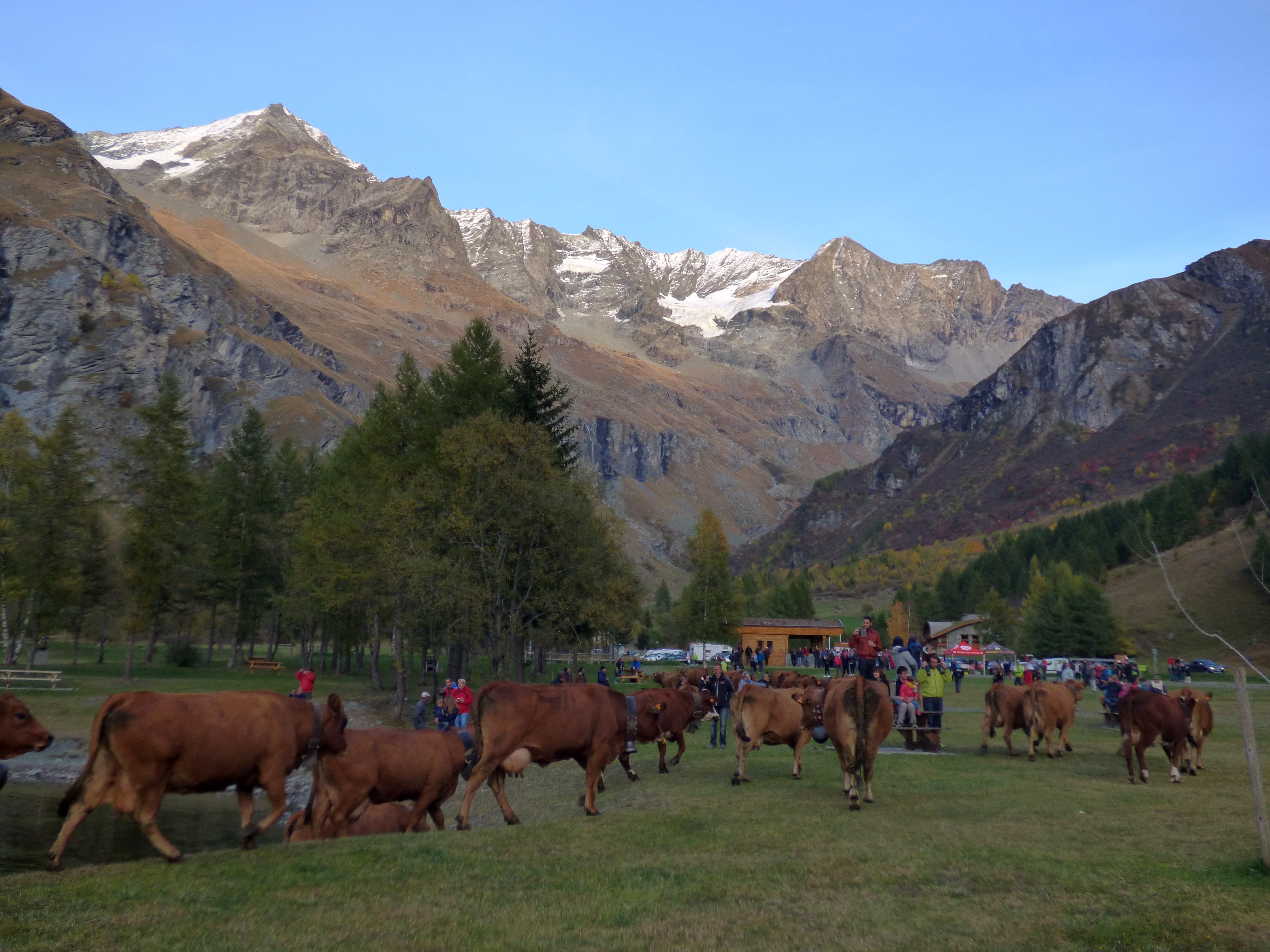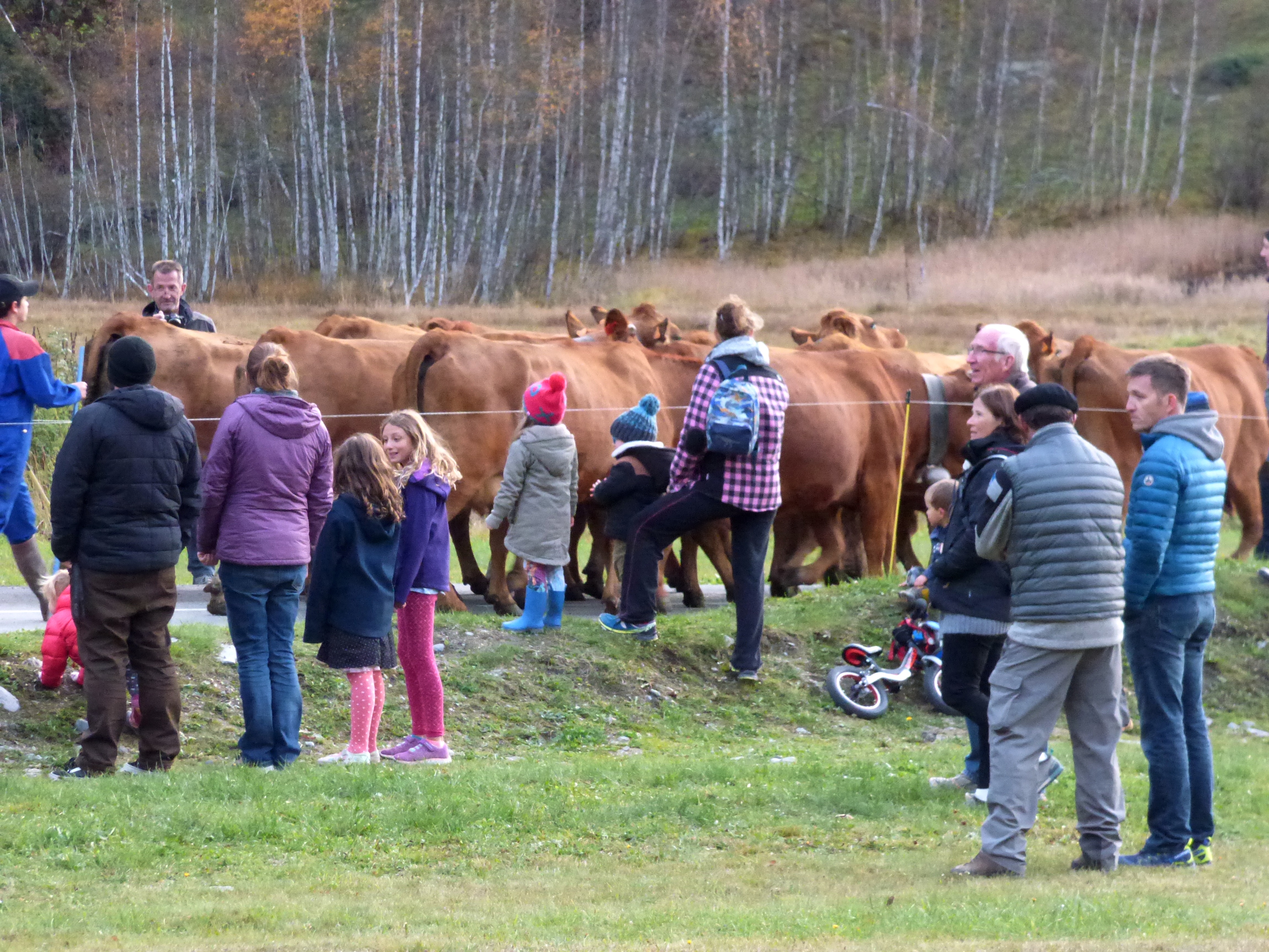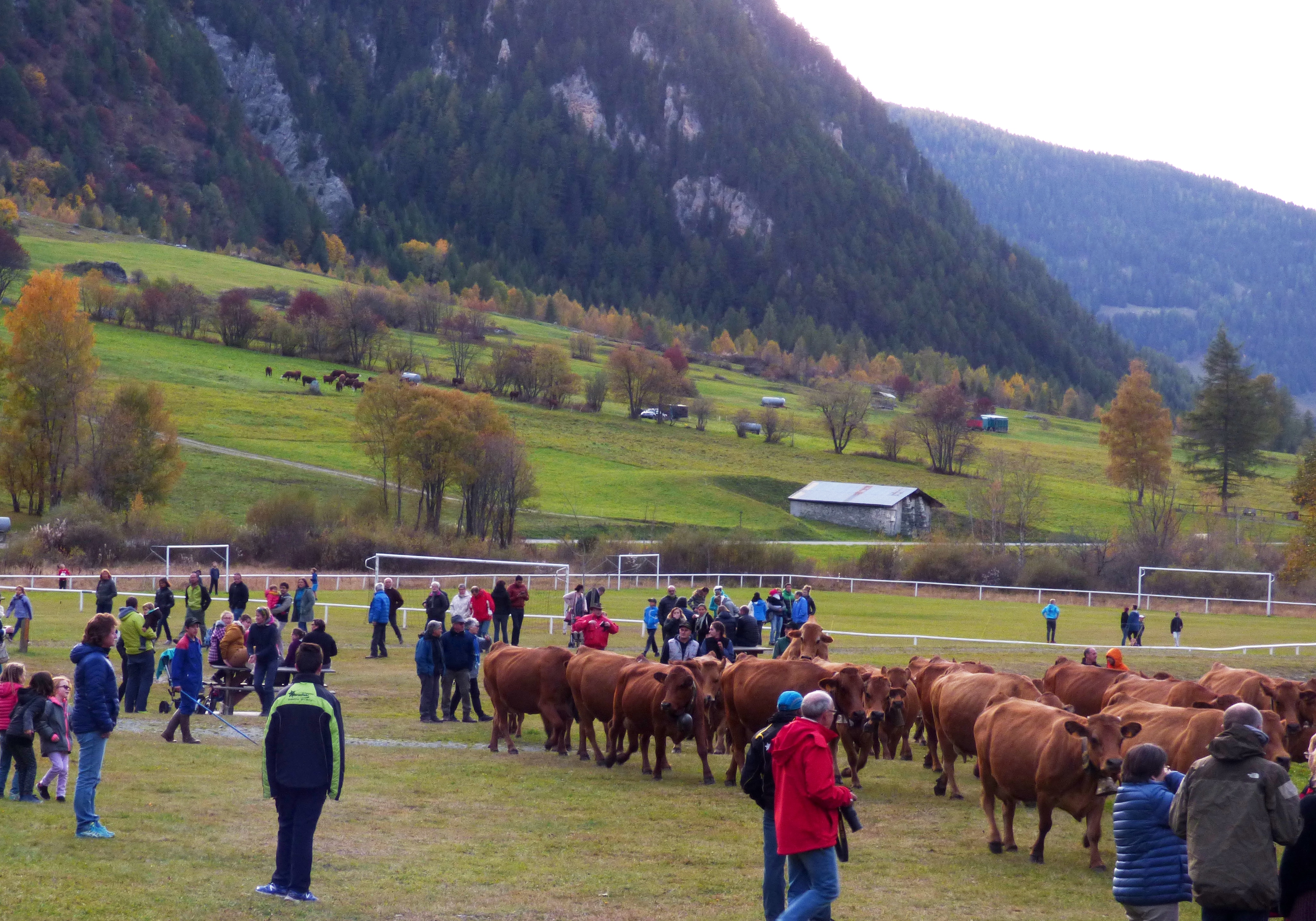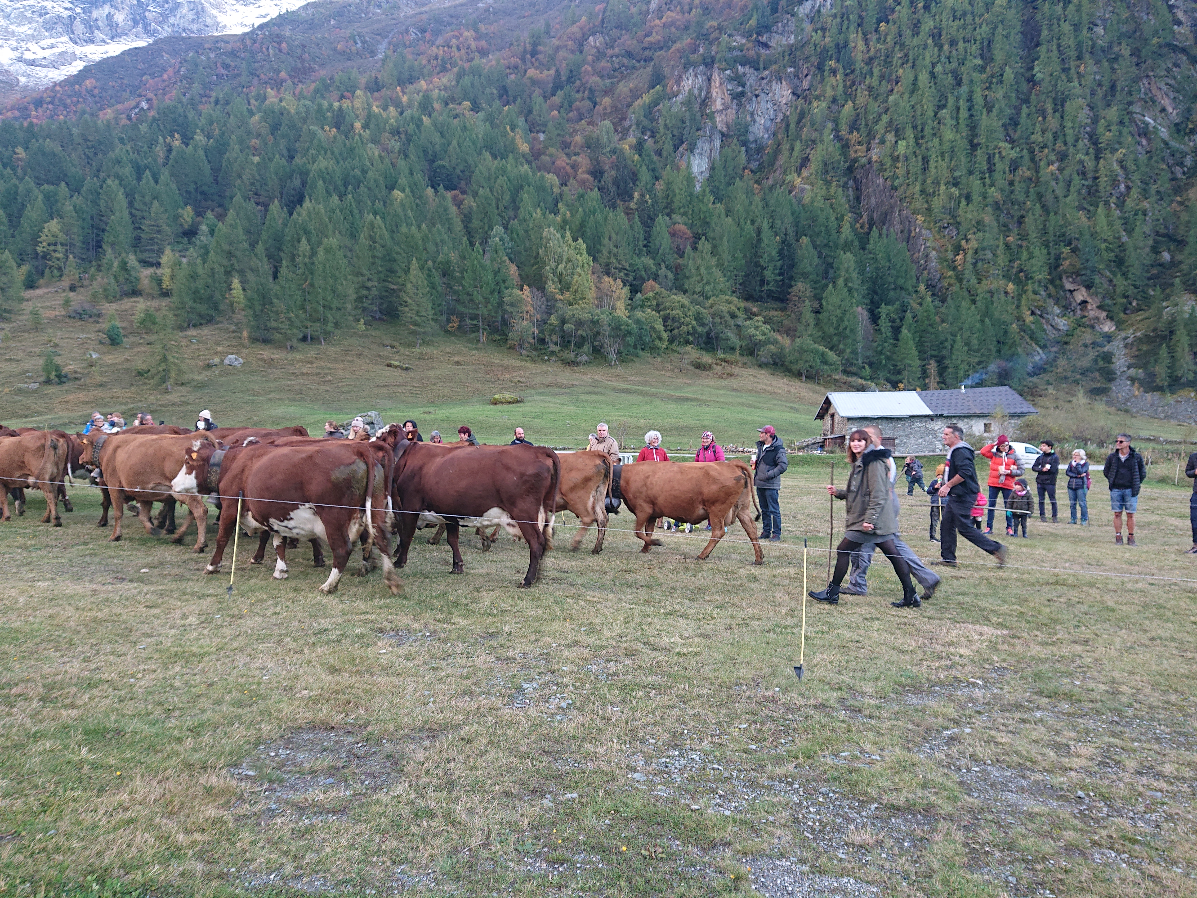 traditionnellement, cette descente se faisait autour de la date de la grande foire de St Michel, le 29 septembre. Elle se fait un peu plus tard maintenant que le climat se montre plus clément. Certaines vaches reviennent d’estives lointaines en camion.