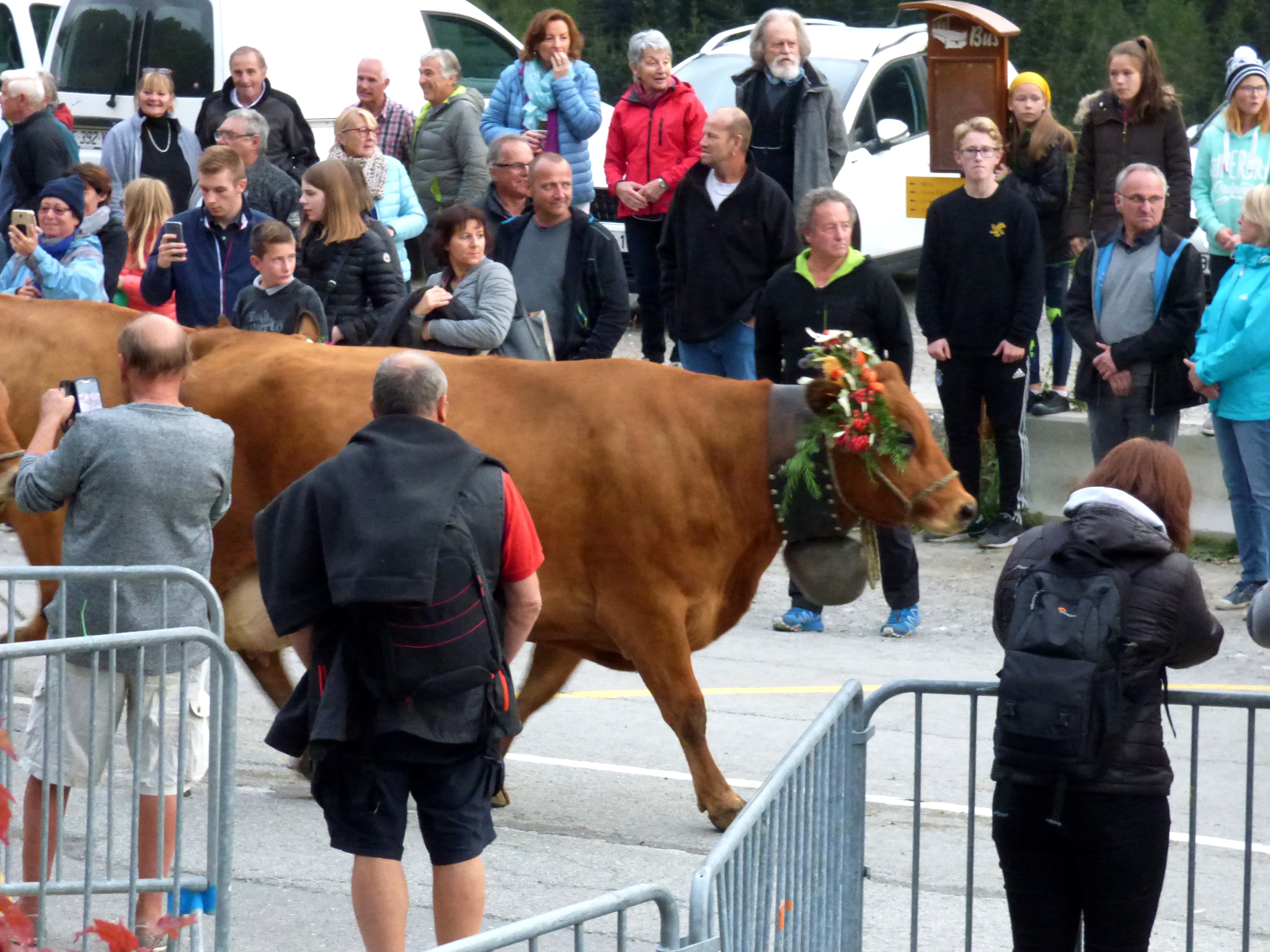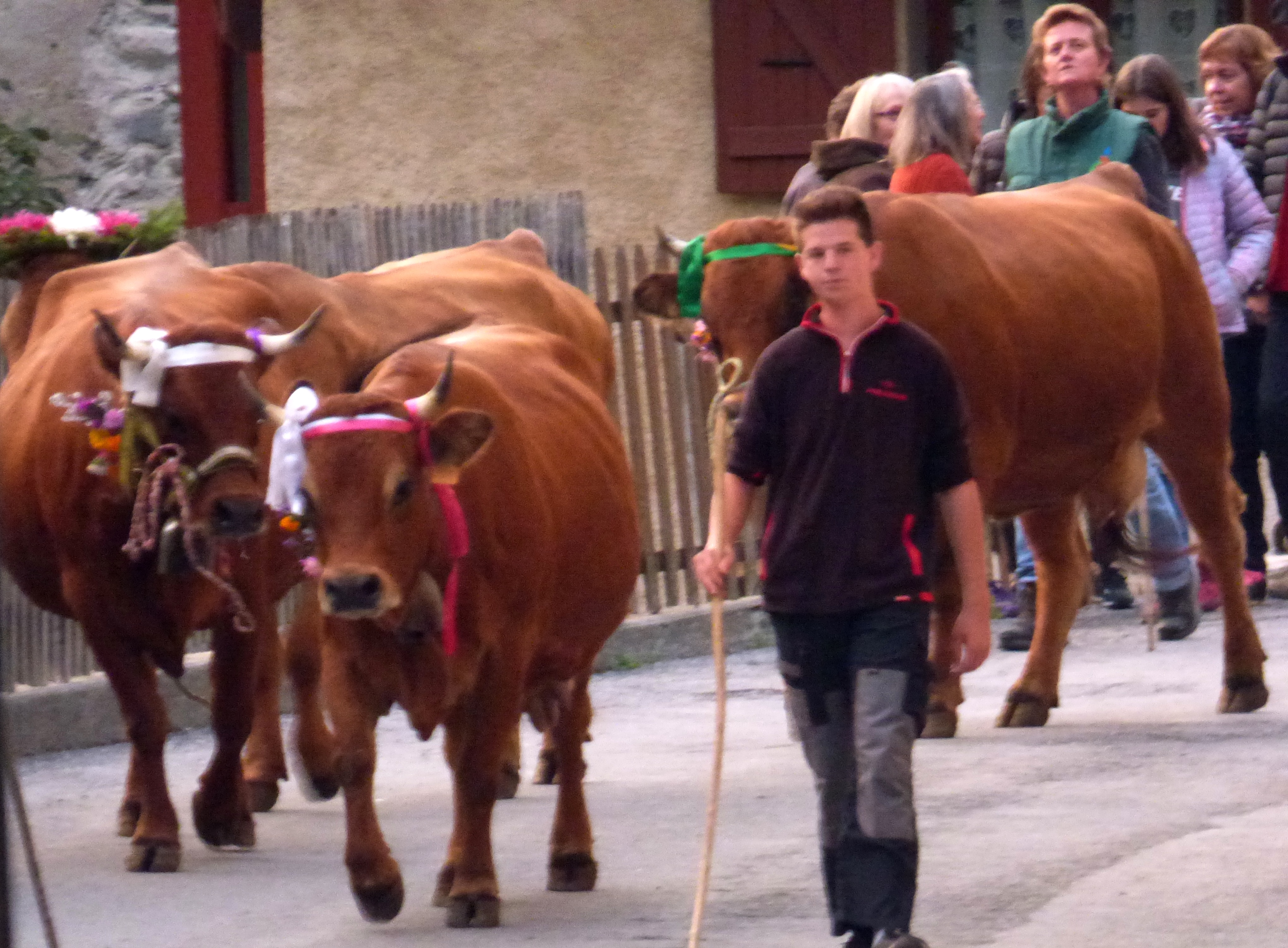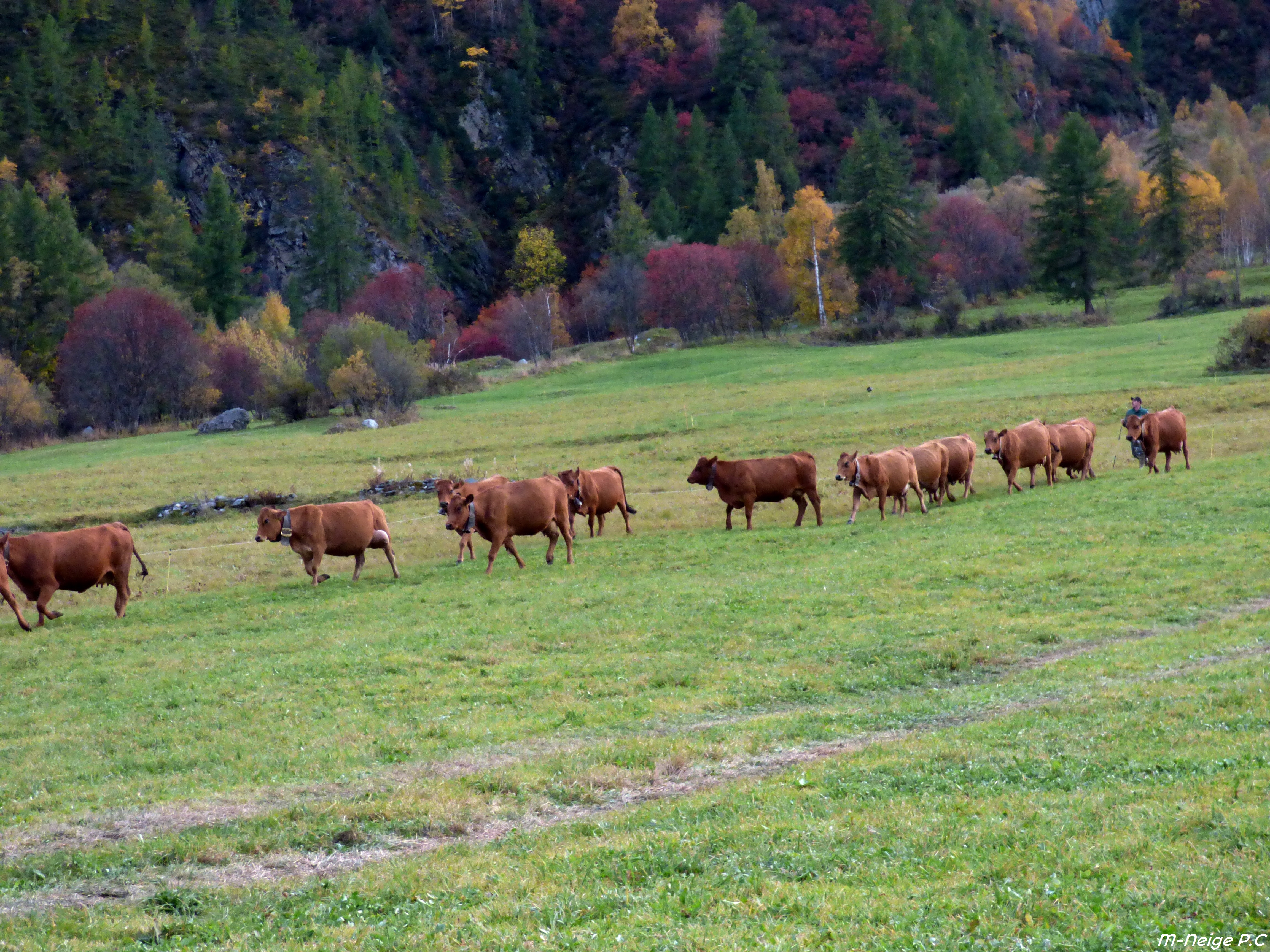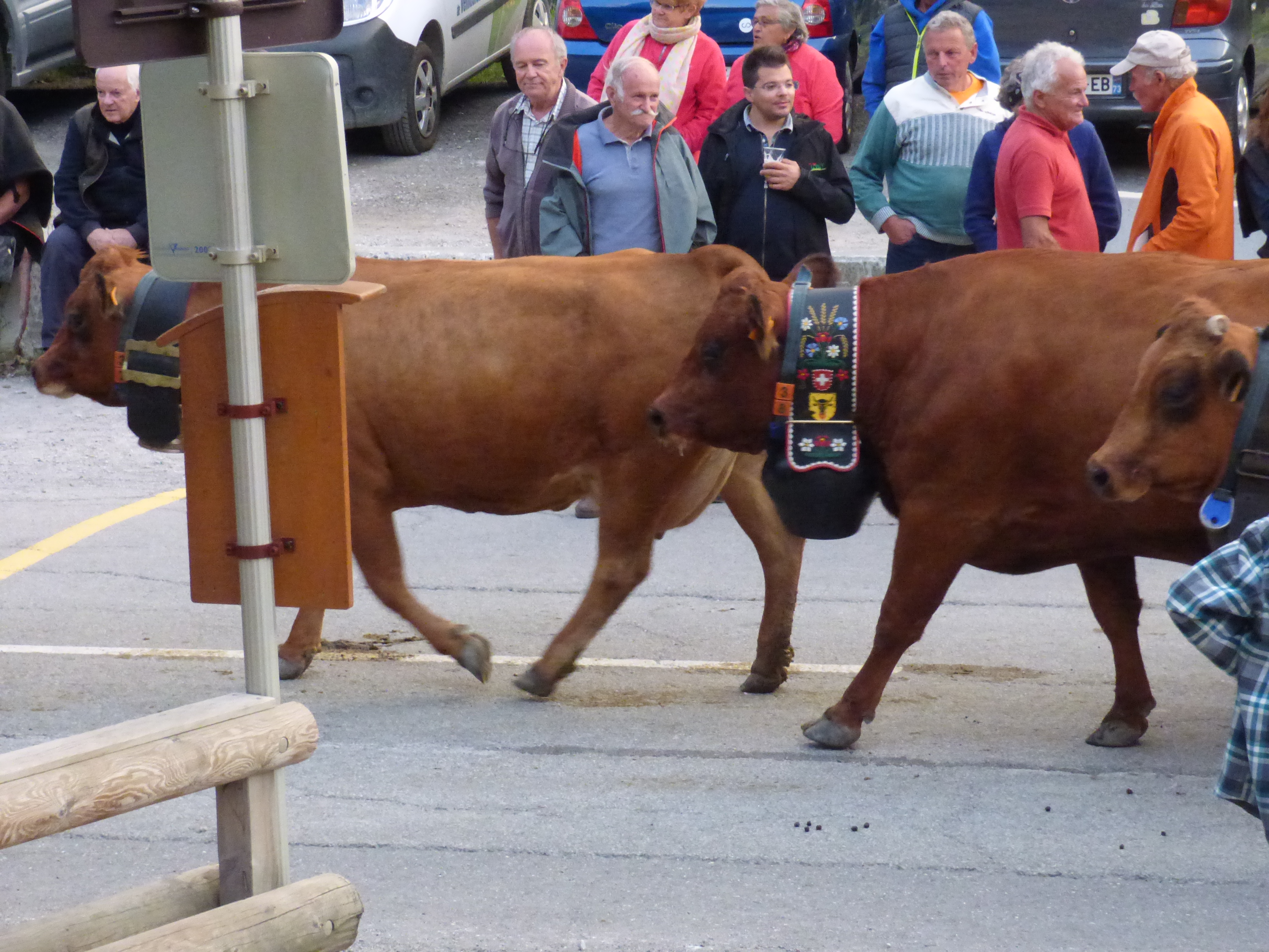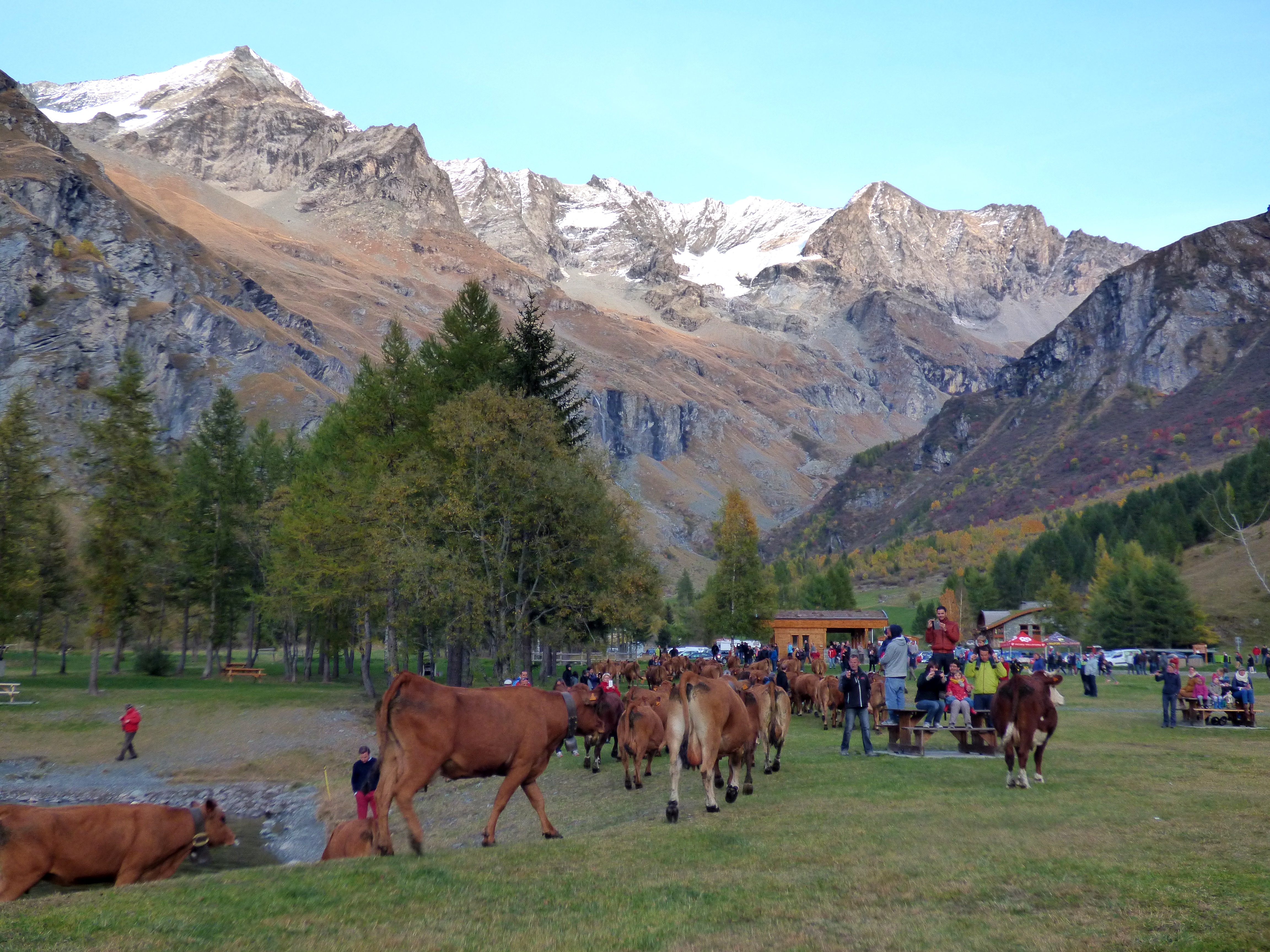 traditionnellement, cette descente se faisait autour de la date de la grande foire de St Michel, le 29 septembre. Elle se fait un peu plus tard maintenant que le climat se montre plus clément. Certaines vaches reviennent d’estives lointaines en camion.