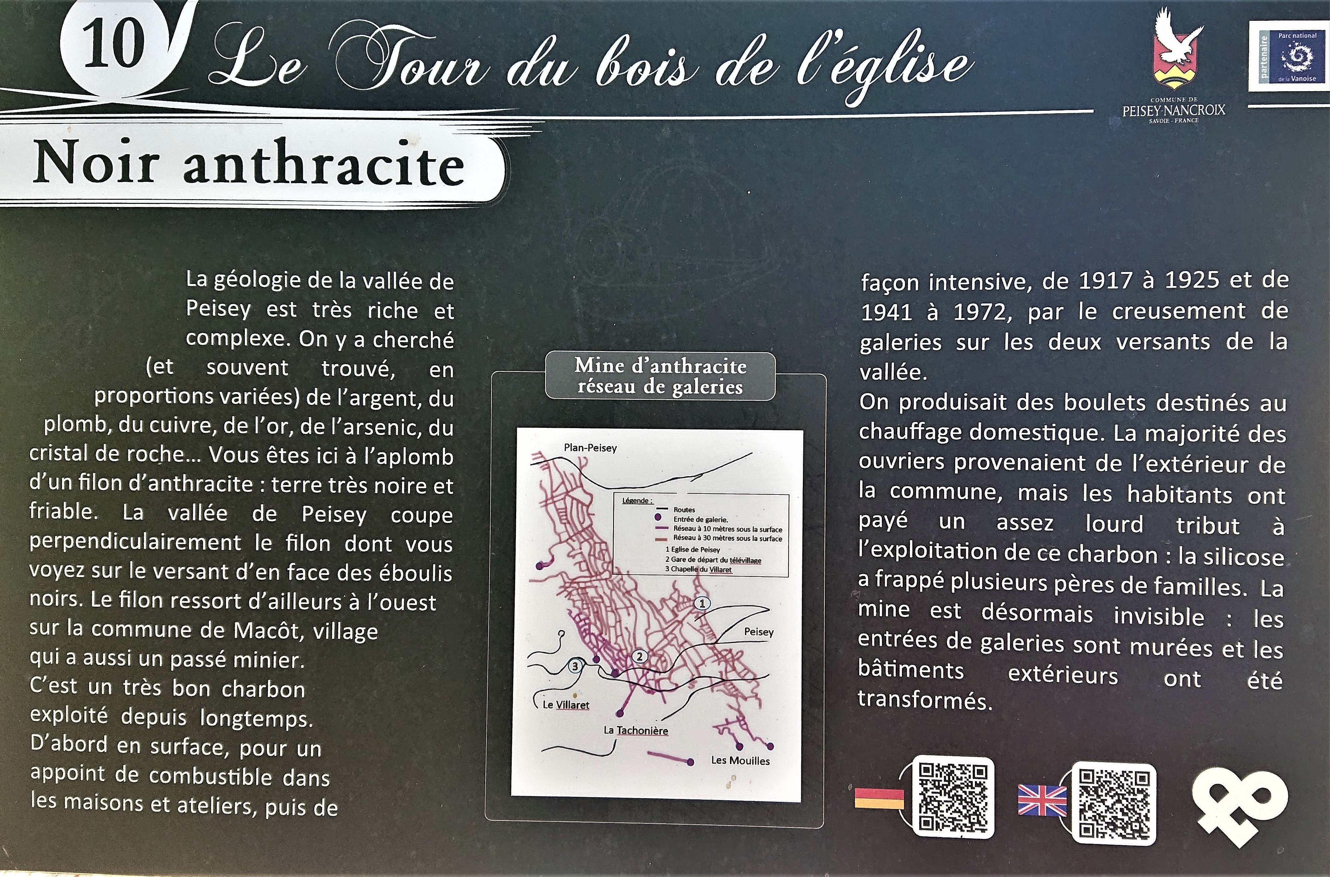 Sentier découverte “le tour du bois de l’église”, panneau n° 10, rapide présentation de la mine d’anthracite de Peisey
