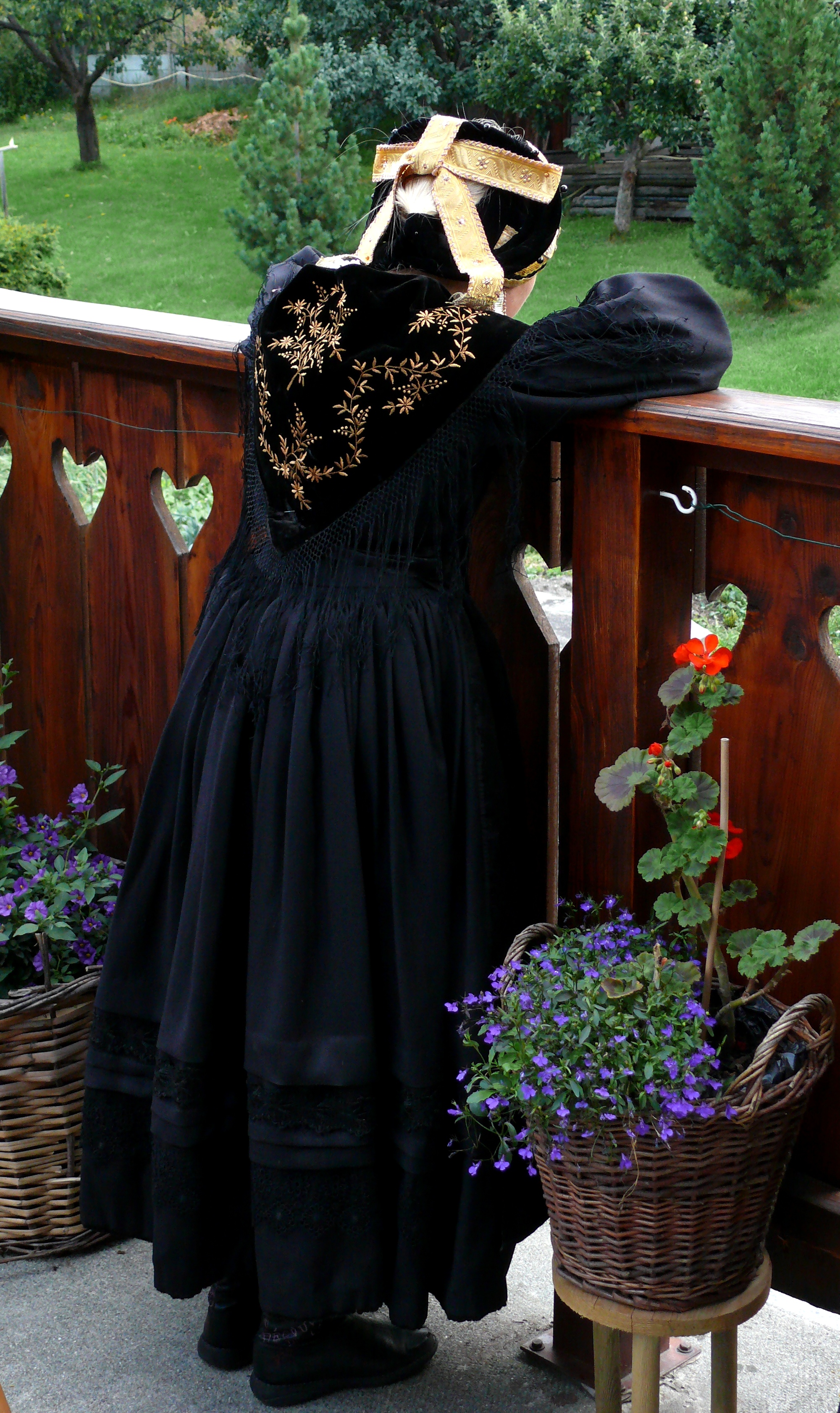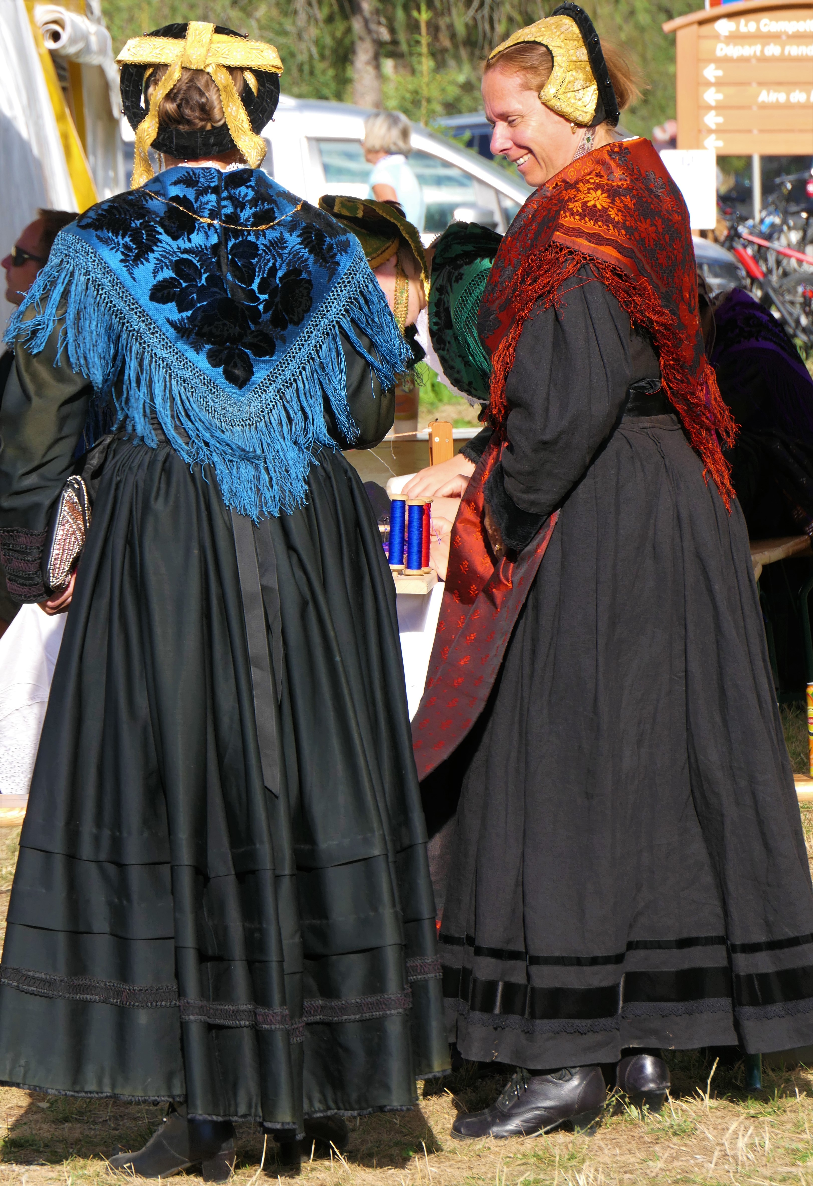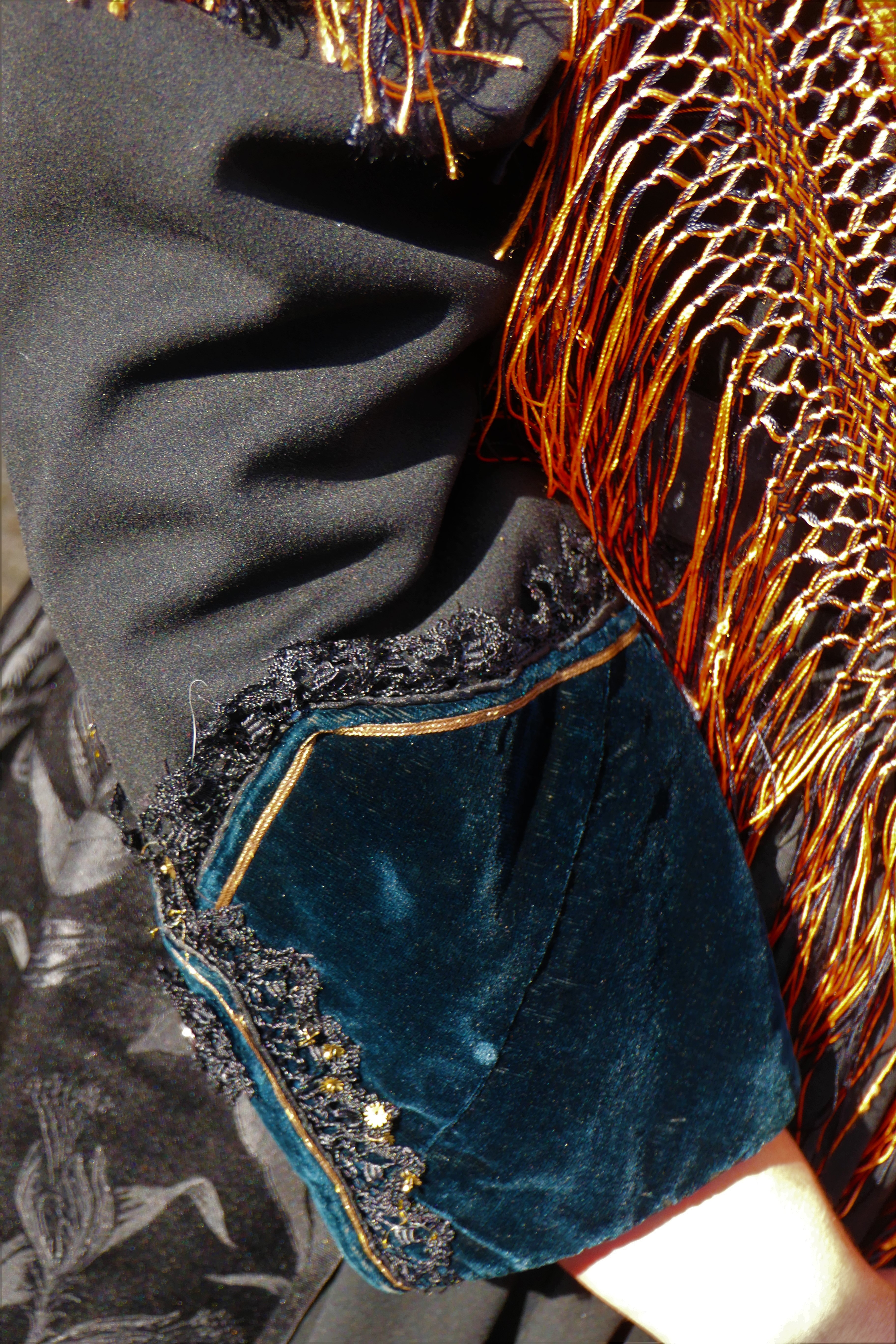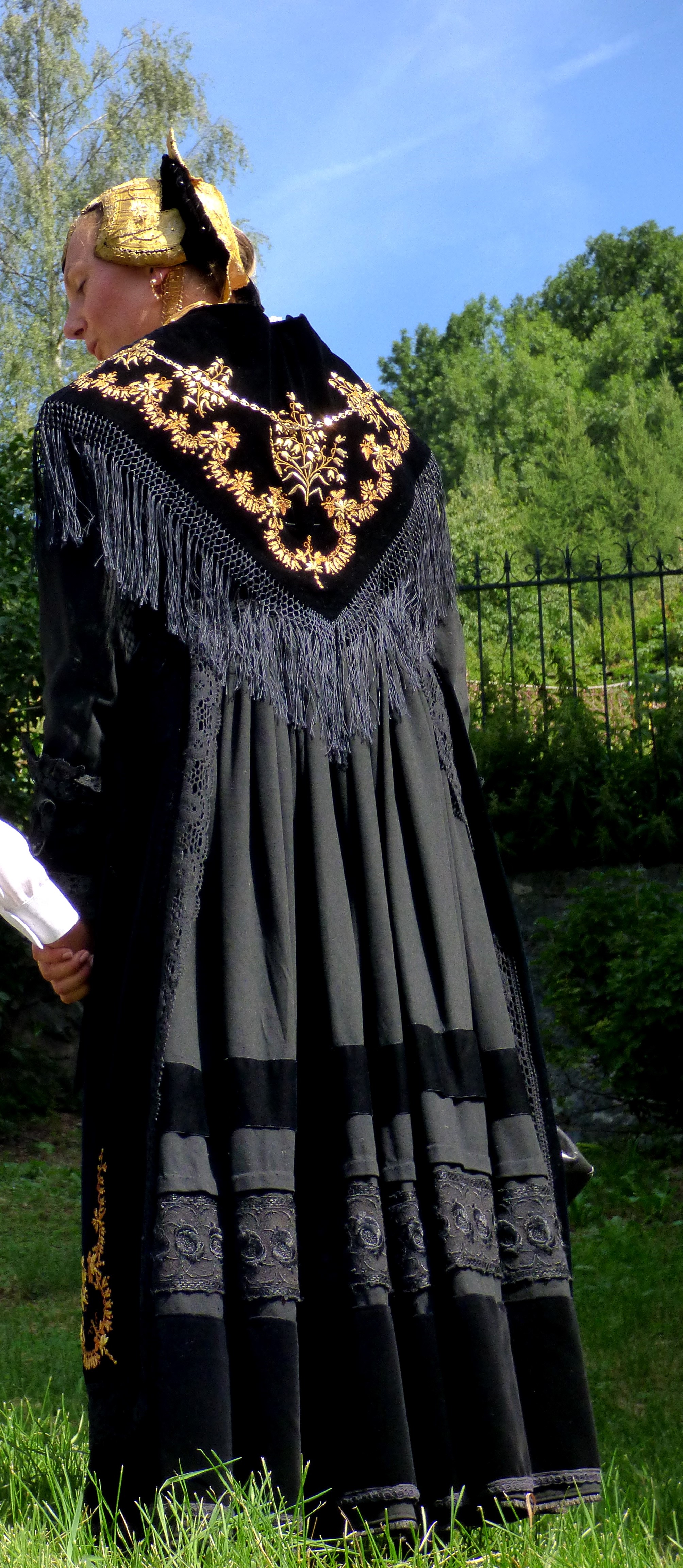 La robe, avec tous les éléments éclatants qui sont épinglés dessus, n’est pas l’élément qu’on remarque le plus. Pourtant c’est lui qui donne le style et la démarche de la personne ! Elle permet aussi de rectifier ce que la dame souhaite : on rembourre par ci, on sert excessivement par là (la taille !). La robe comporte sur l’arrière de la taille un “boudin” pour bien répartir les plis de la robe et avoir un “tombant” parfait. Le boudin est caché par la pointe du châle. Le bas de la robe est fait de larges ourlets agrémentés de velours ou de dentelles. Les manches sont soignées.