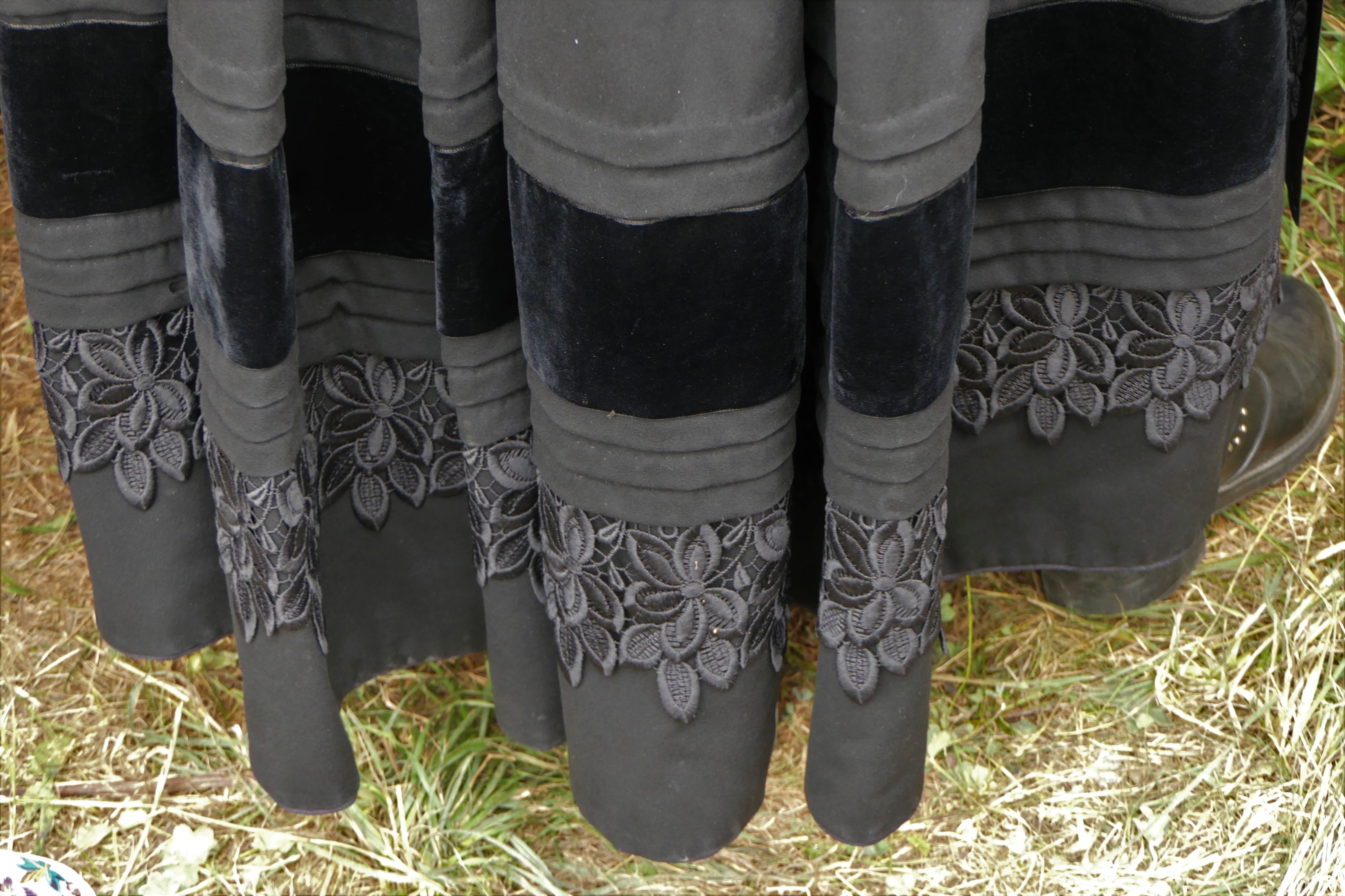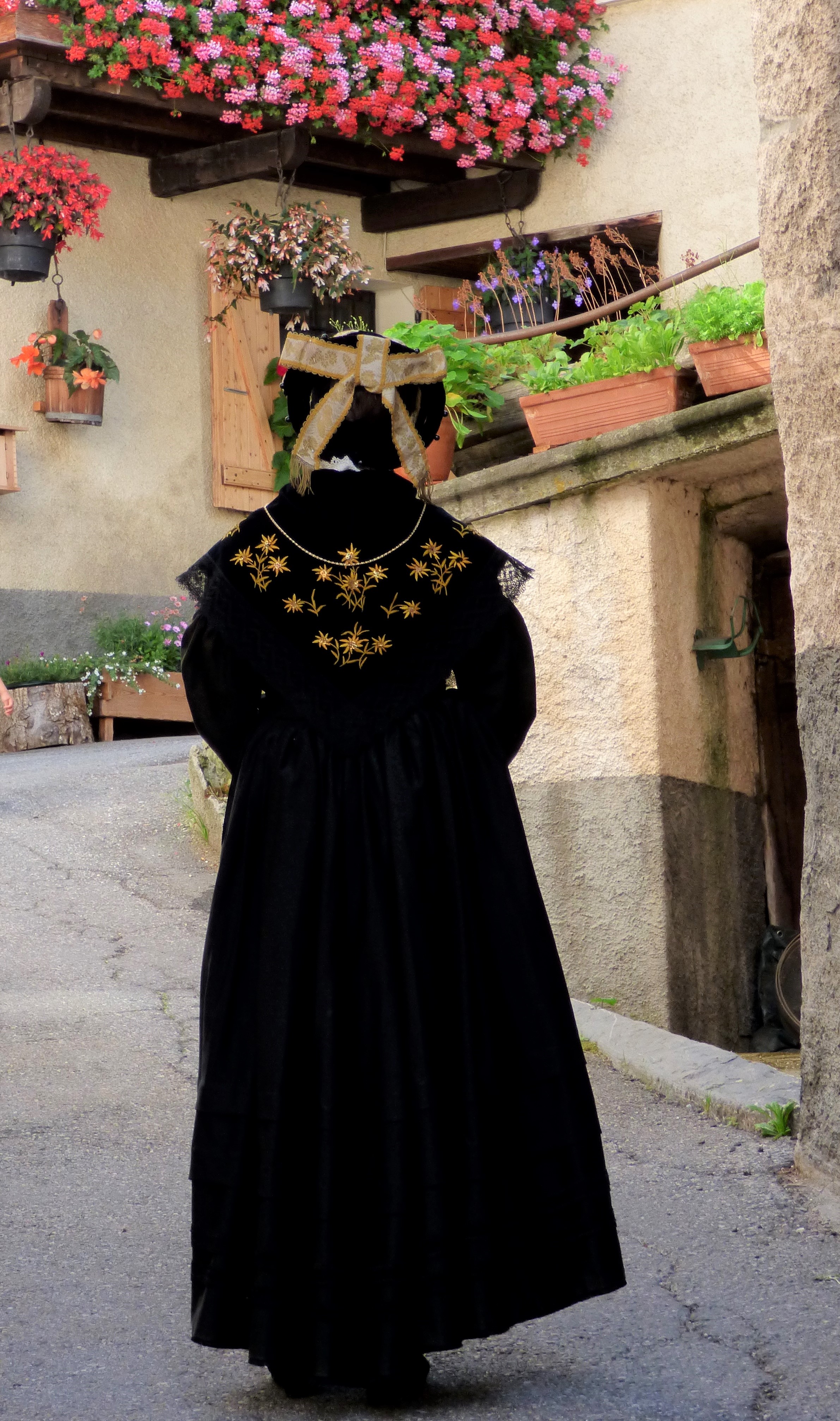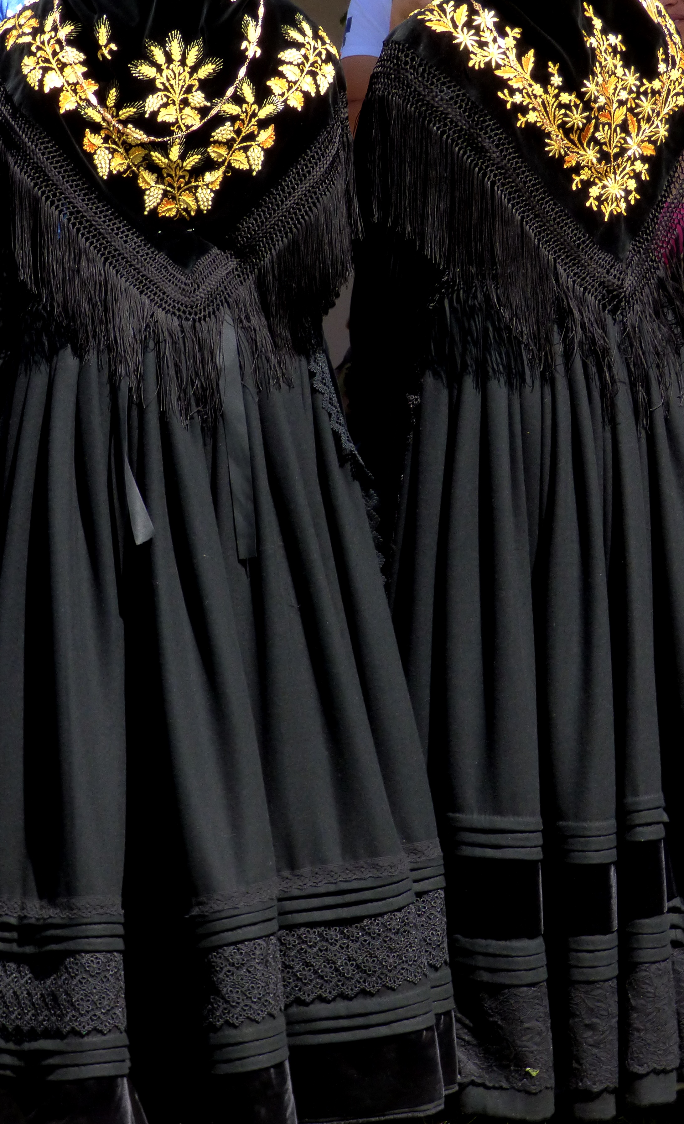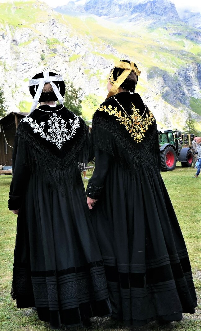 La robe, avec tous les éléments éclatants qui sont épinglés dessus, n’est pas l’élément qu’on remarque le plus. Pourtant c’est lui qui donne le style et la démarche de la personne ! Elle permet aussi de rectifier ce que la dame souhaite : on rembourre par ci, on sert excessivement par là (la taille !). La robe comporte sur l’arrière de la taille un “boudin” pour bien répartir les plis de la robe et avoir un “tombant” parfait. Le boudin est caché par la pointe du châle. Le bas de la robe est fait de larges ourlets agrémentés de velours ou de dentelles. Les manches sont soignées.