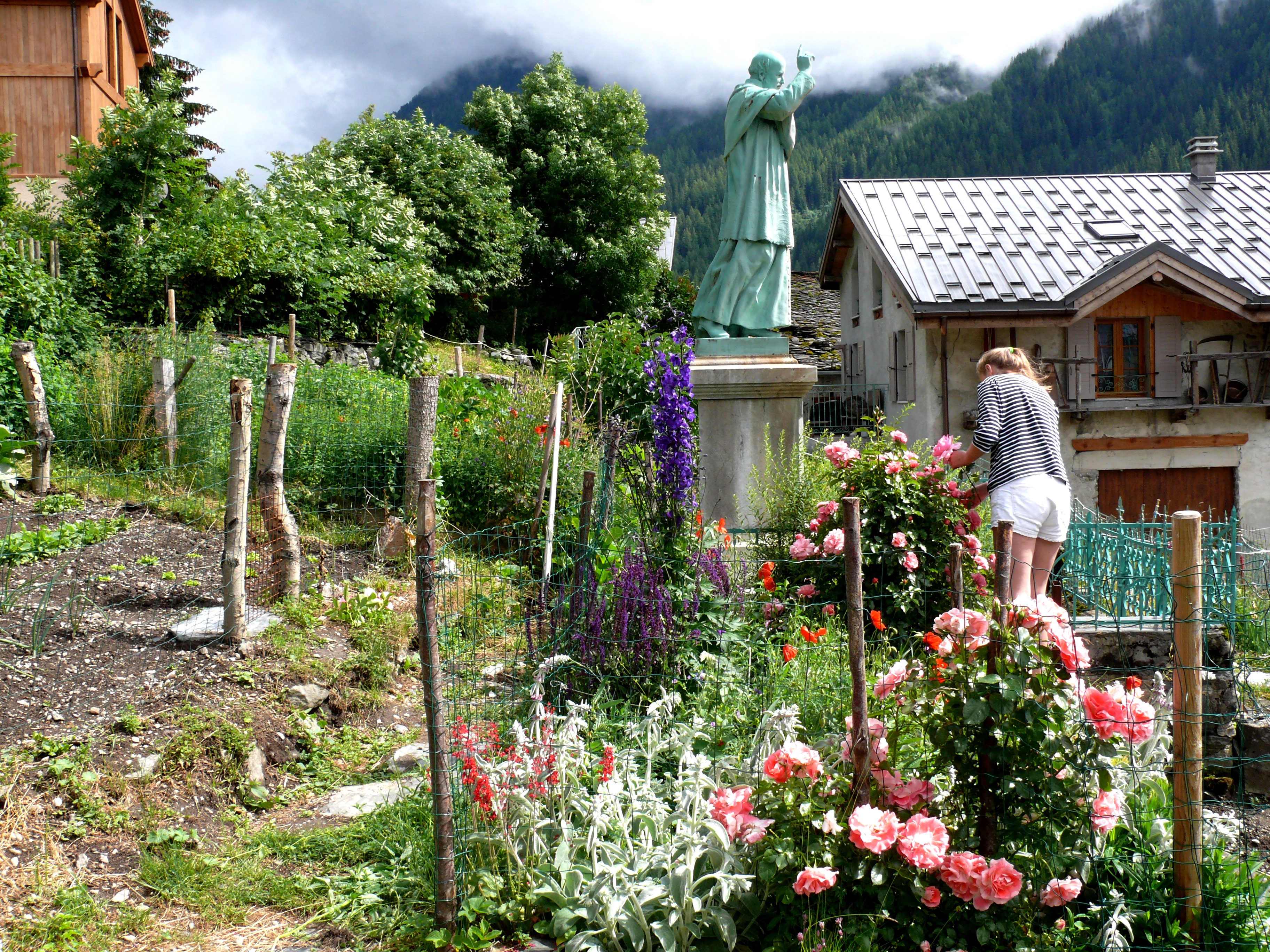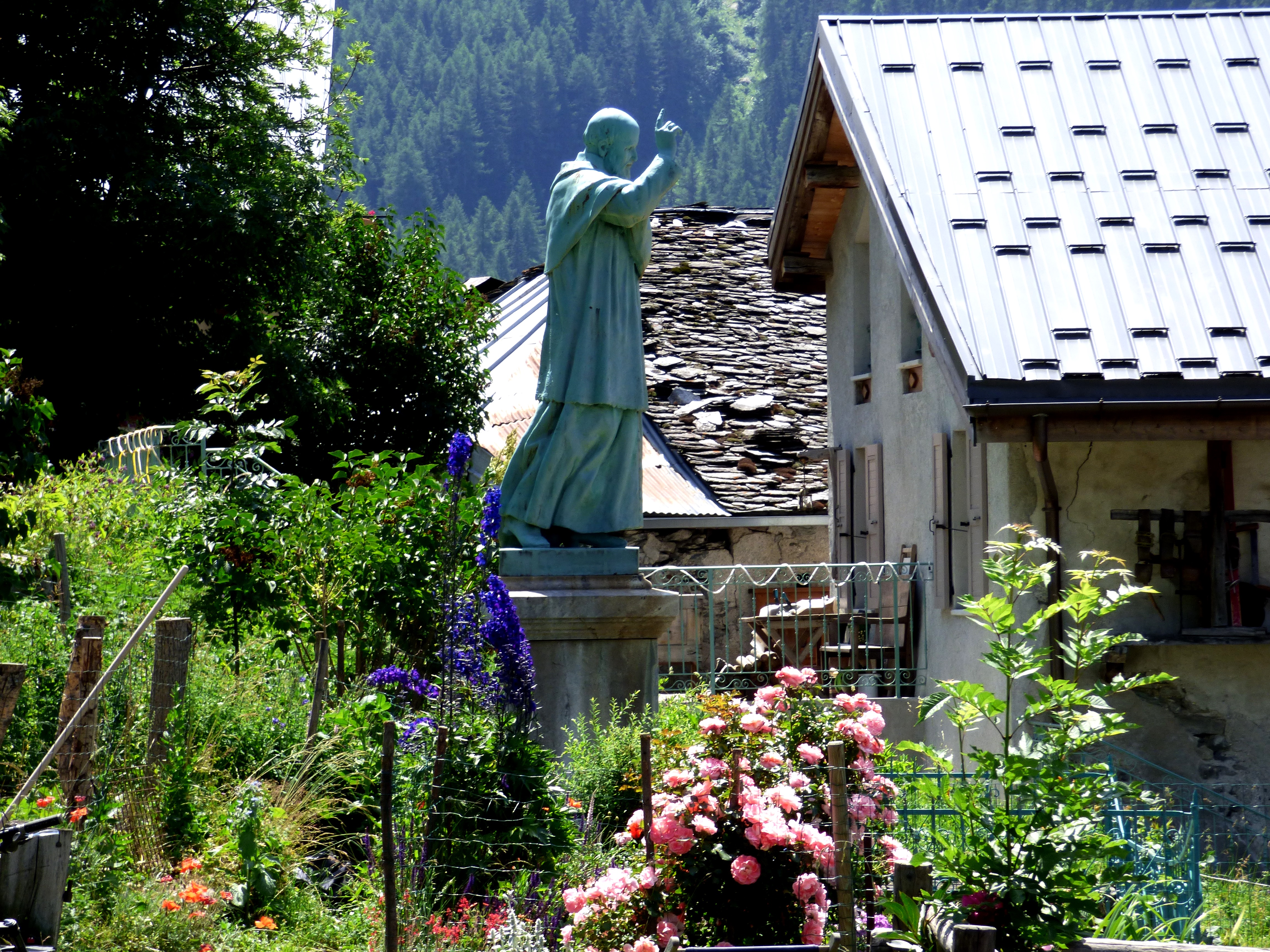 La statue est installée au milieu des jardins de Peisey-d’en-bas. Sur une coulée de terre noire ayant, à une date dont on ne se rappelle plus, dévissé de sa tourbière d’origine, en amont. D’où la qualité du sol de ces jardins et leur maintien en plein milieu du village.