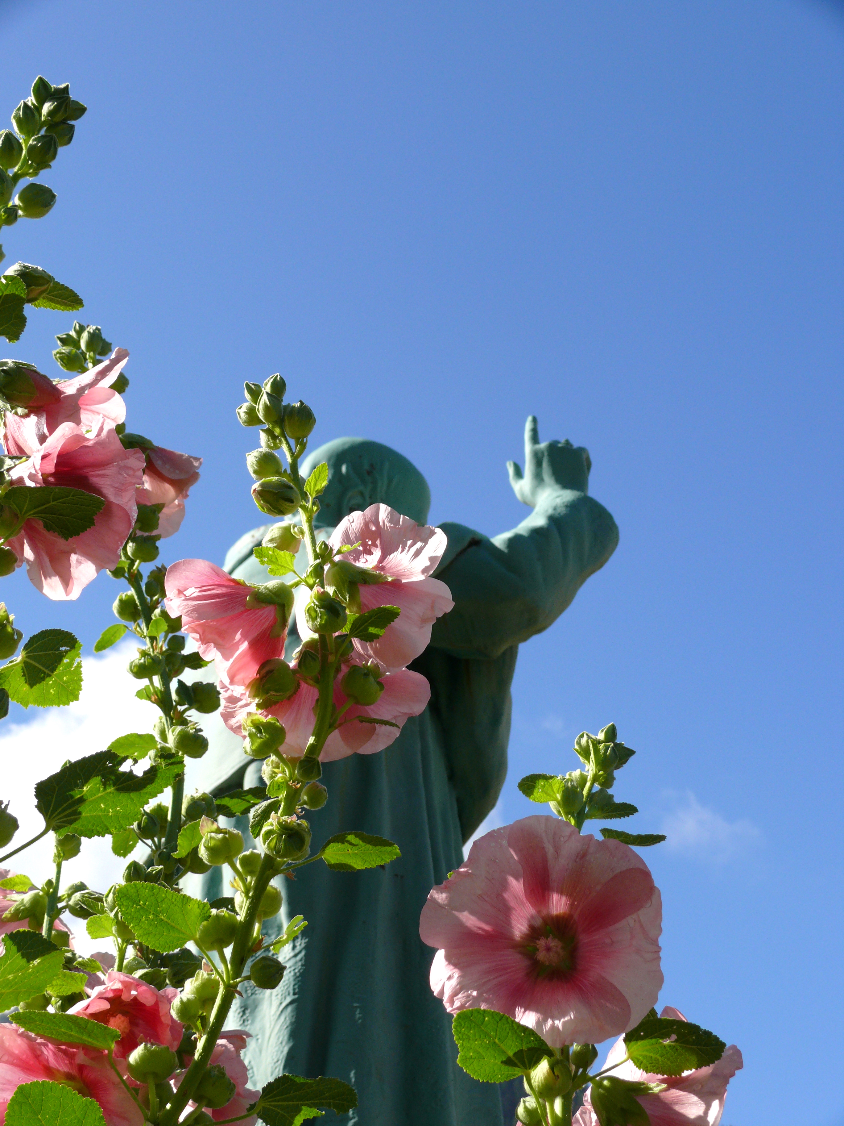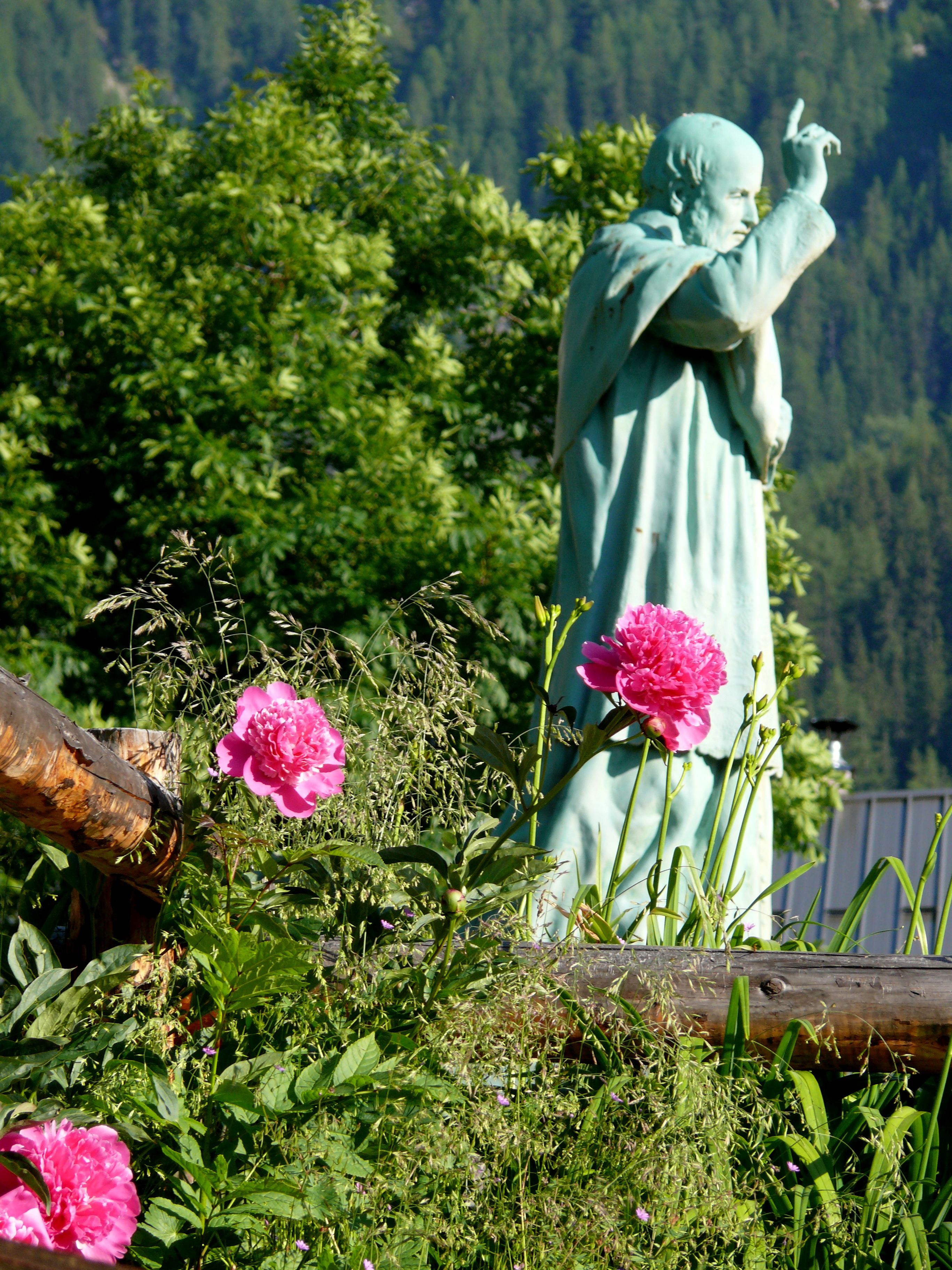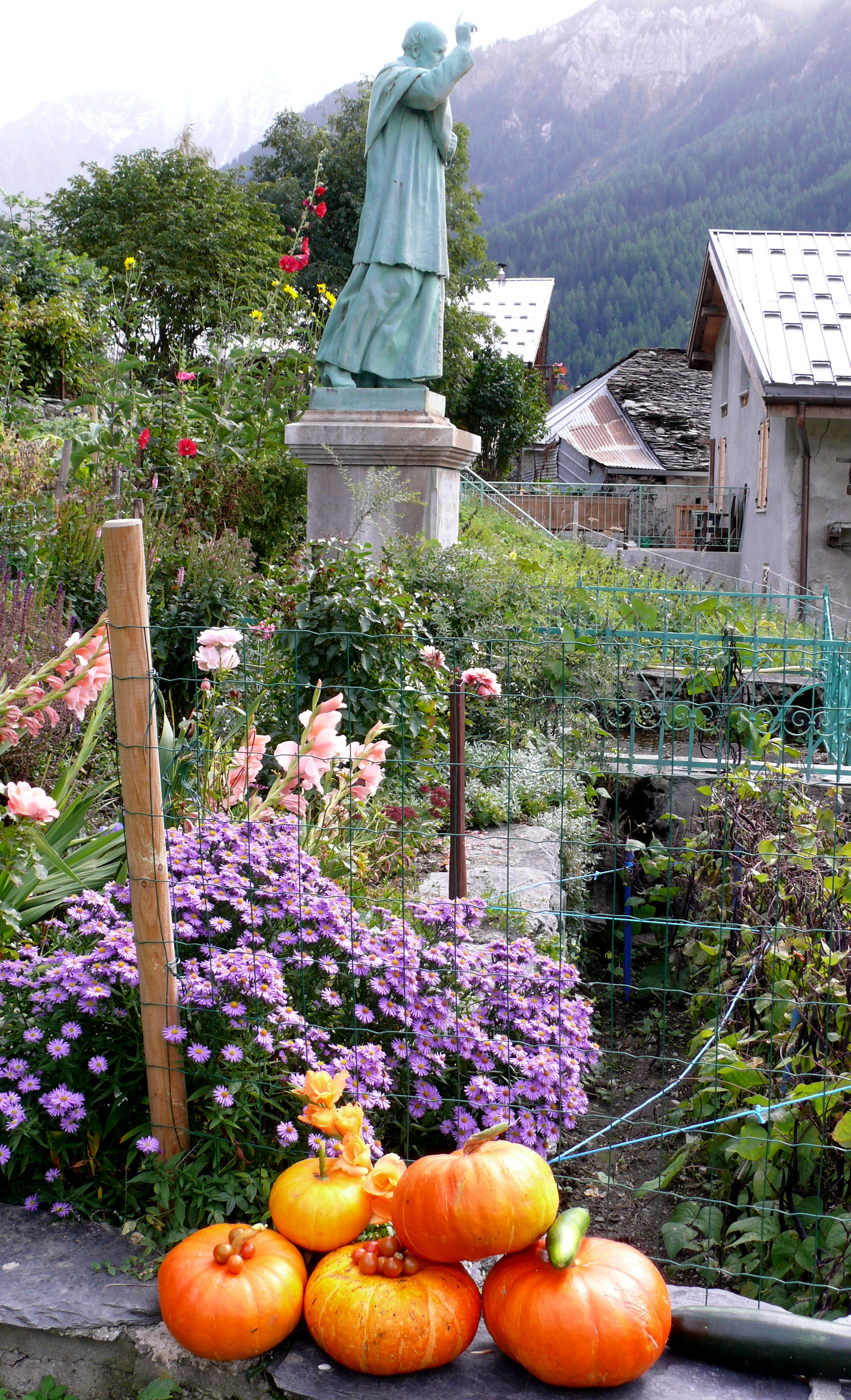 Qu’on mette les oignons à « réessuyer » sur les pierres de son petit parc, qu’on y empile les potirons, qu’on sifflote pour faire sortir les lézards curieux de son muret, qu’on s’asseye tranquillement pour lire au soleil contre son socle, qu’il fasse de l’ombre aux salades aux heures chaudes, qu’il serve de tuteur aux roses trémières : Saint-François participe à la vie des jardins qu’il bénit à longueur d’année.