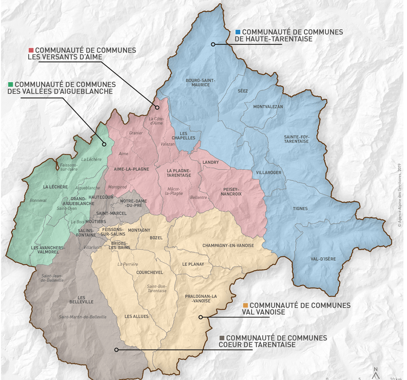 “Créée en 2005, l’Assemblée du Pays Tarentaise Vanoise (APTV) est un syndicat mixte regroupant les cinq communautés de communes de Tarentaise (soit 35 communes) et le Département de la Savoie.