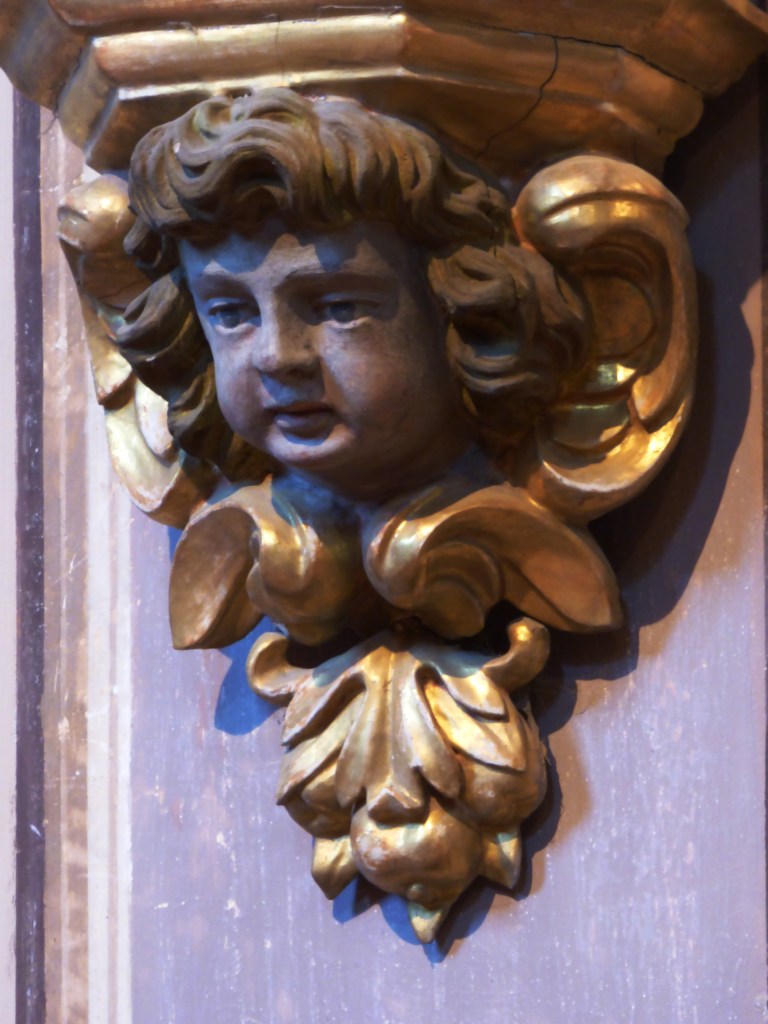 Les stales sont en noyer, trois de chaque côté, avec de jolies décorations fleuries. Elles ont hélas été vandalisées : 6 têtes d’anges ont été arrachées et remplacées par d’autres qui jurent un peu…