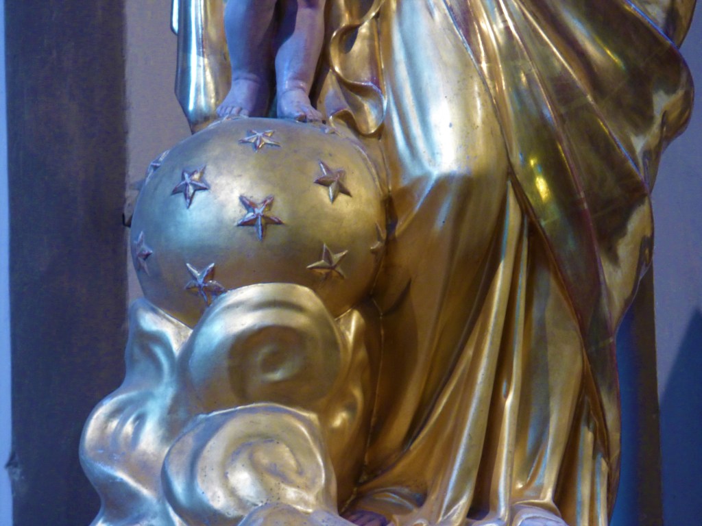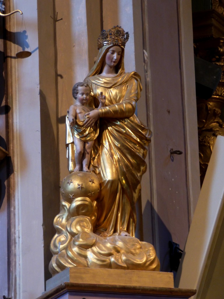 Statue entièrement dorée de la madone (vierge à l’enfant) qui présente son fils debout sur la boule-monde piquetée d’étoiles et posée sur la nuée. C’est une vierge reine qui porte une belle couronne. Le petit Jésus tend la main droite vers le public et montre les 3 doigts de la trinité avec la main gauche.
