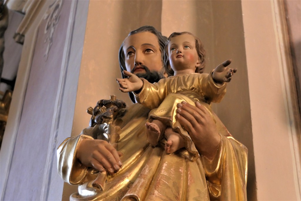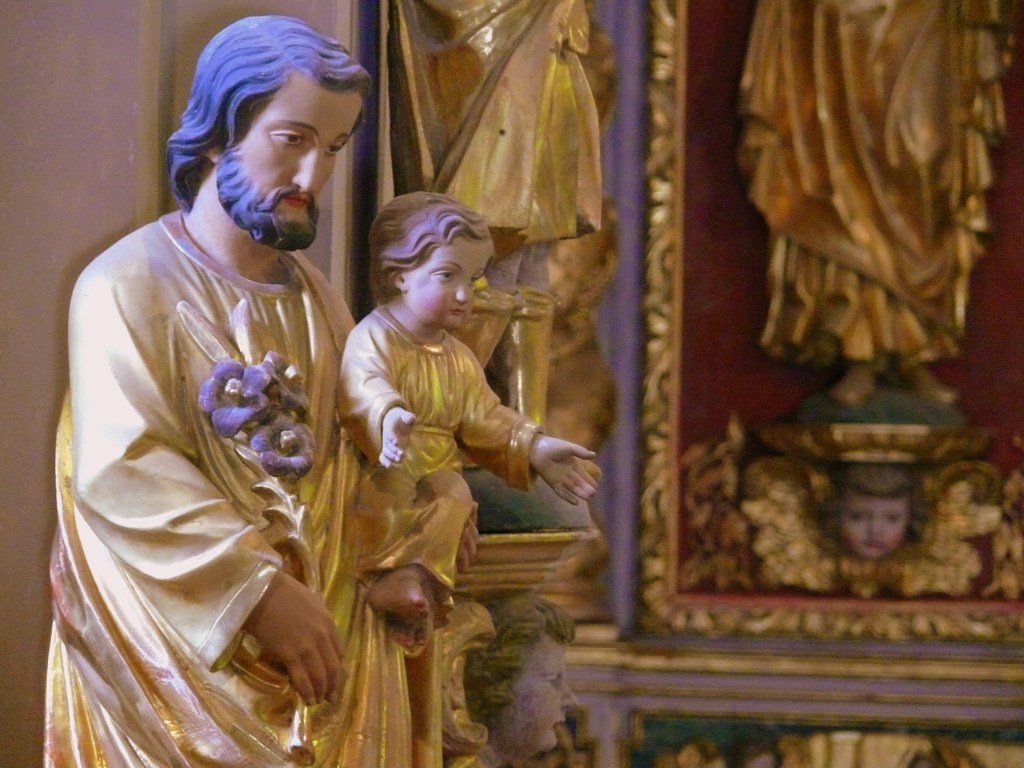 Il est représenté ici jeune, avec le petit Jésus dans les bras. On note la très grande douceur de son expression. Il tient son bâton fleuri, réduit à une belle fleur.