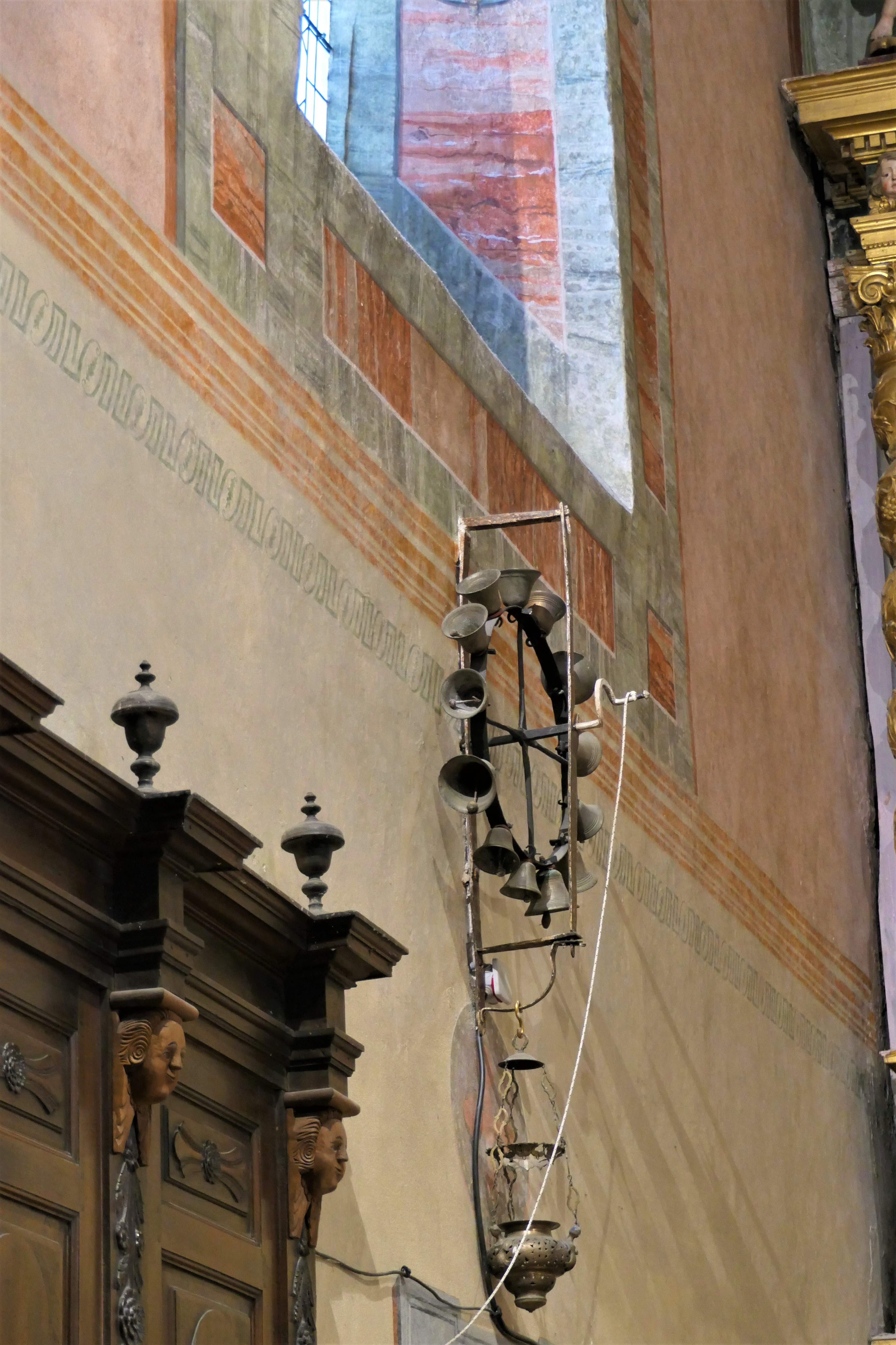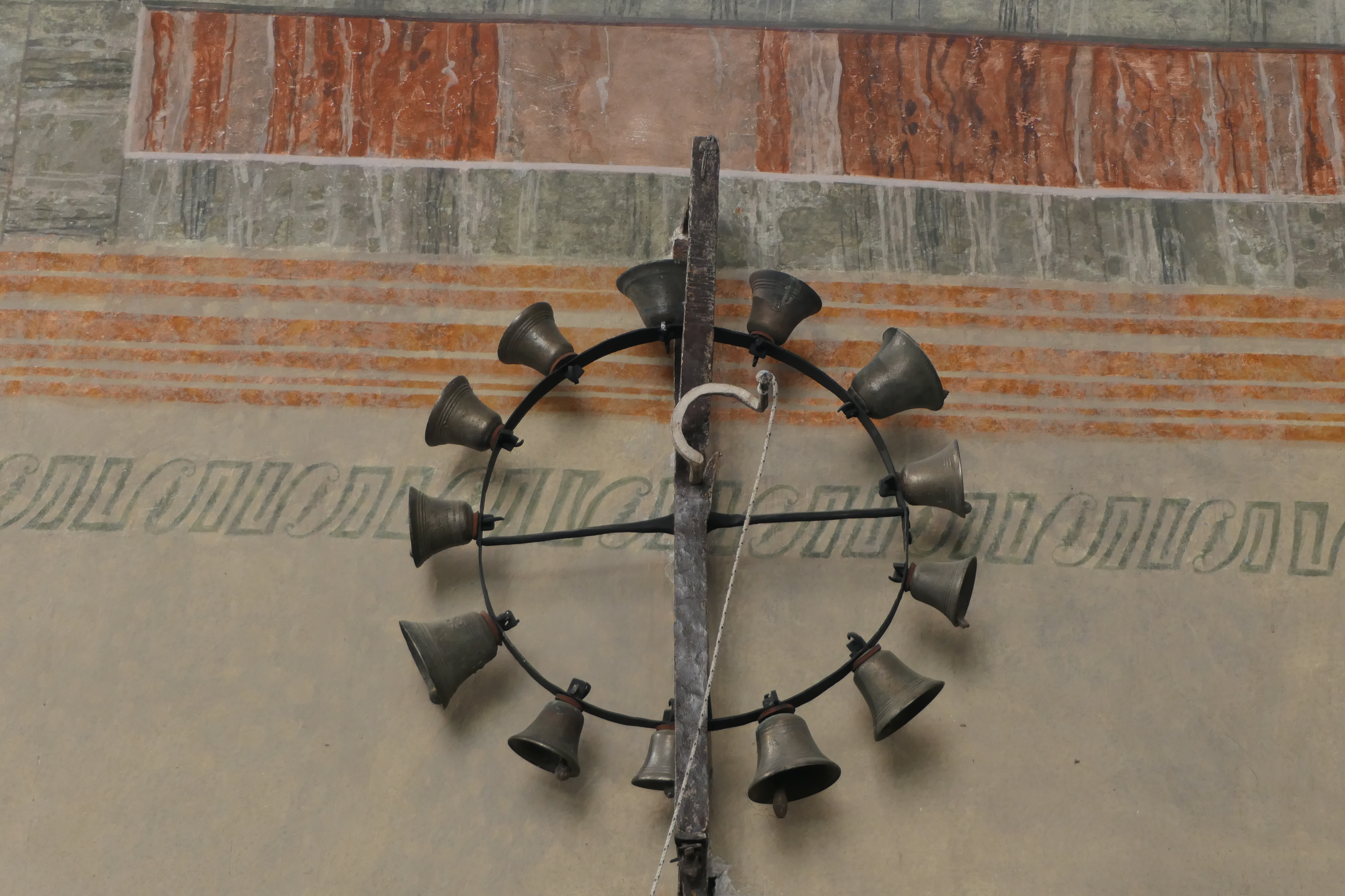 Le treizin est une roue munie de clochette typique des église de Tarentaise. Peu sont pourtant parvenus jusqu’à nous. Les 13 clochettes ont été fondues tout près de là , au Villaret, dans l’atelier Mérandon, dernier fondeur de Peisey. Elles n’ont pas toutes la même taille et ne produisent donc pas toutes le même son. Elles symbolisent le Christ et les douze apôtres lors de la Cène pascale. La poignée pour actionner le treizin ressemble fort à celle des rouets ! C’était un honneur réservé aux bons élèves du cathéchisme que d’actionner le treizin pendant la semaine pascale.
