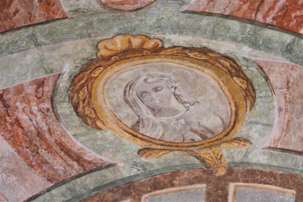 Le chœur est de forme carrée, avec une grande baie vitrée au sud-ouest … et un beau trompe-l’œil au nord-Est. Deux personnages dessinés dans ce décor, peu identifiables.