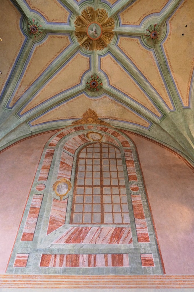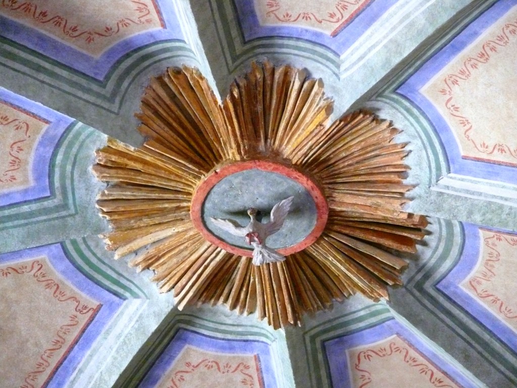 Le plafond en voûtes d’arêtes a été merveilleusement restauré dans les couleurs d’origines. Quatre clefs de voûtes sont de motifs fleuris mais la clef de voûte centrale est pourvue d’un superbe Saint-Esprit au milieu d’une gloire de rayons dorés.