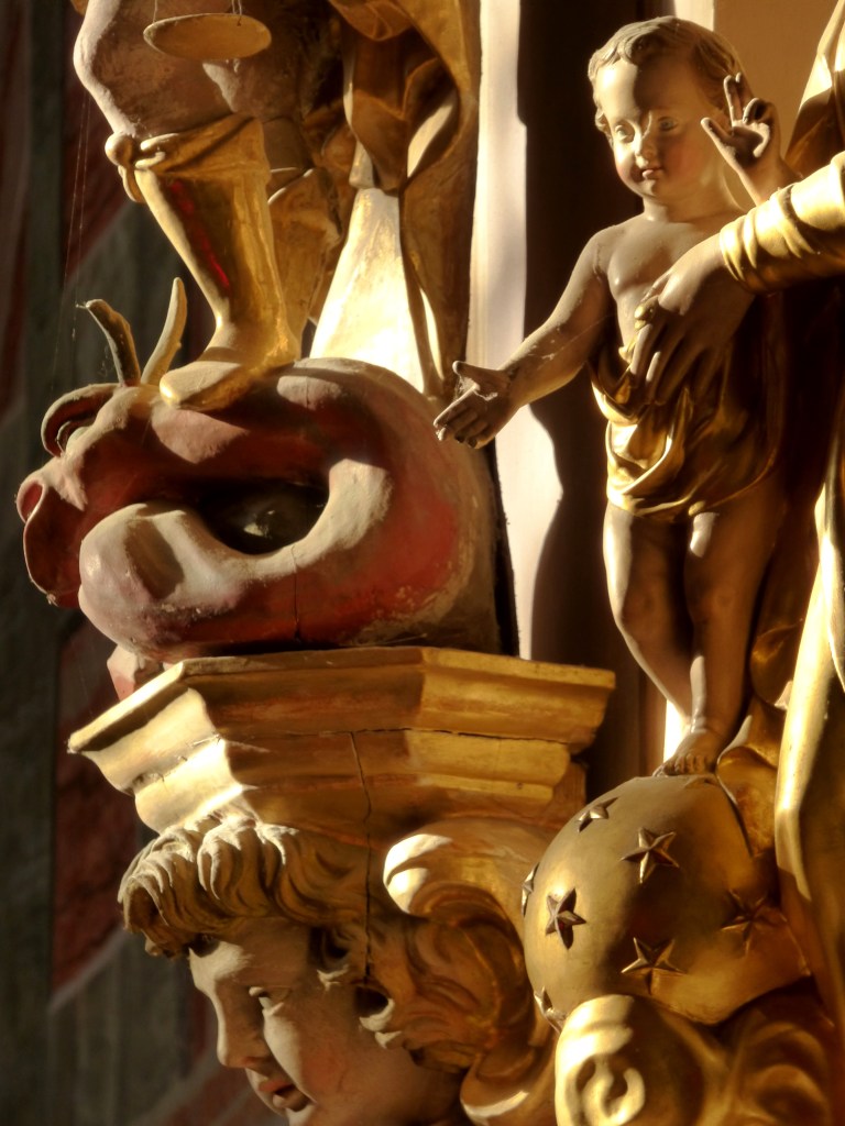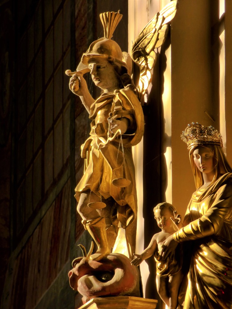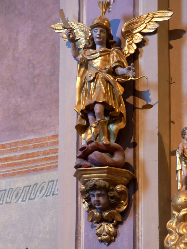 Juste à côté St Michel, archange en armure, terrasse un drôle de dragon dodu, rouge et cornu, qui représente Satan. Ce thème est évoqué dans l’Apocalypse de St Jean et c’est la représentation de l’archange et l’ensemble est un élément de l’iconographie médiévale. Mais St Michel, chef de la milice des anges est aussi celui qui procède à la pesée des actions des défunts : la psychostasie (pesée des âmes) il tient en main gauche une fragile balance, celle qui fera la différence entre les bonnes et les mauvaises actions.