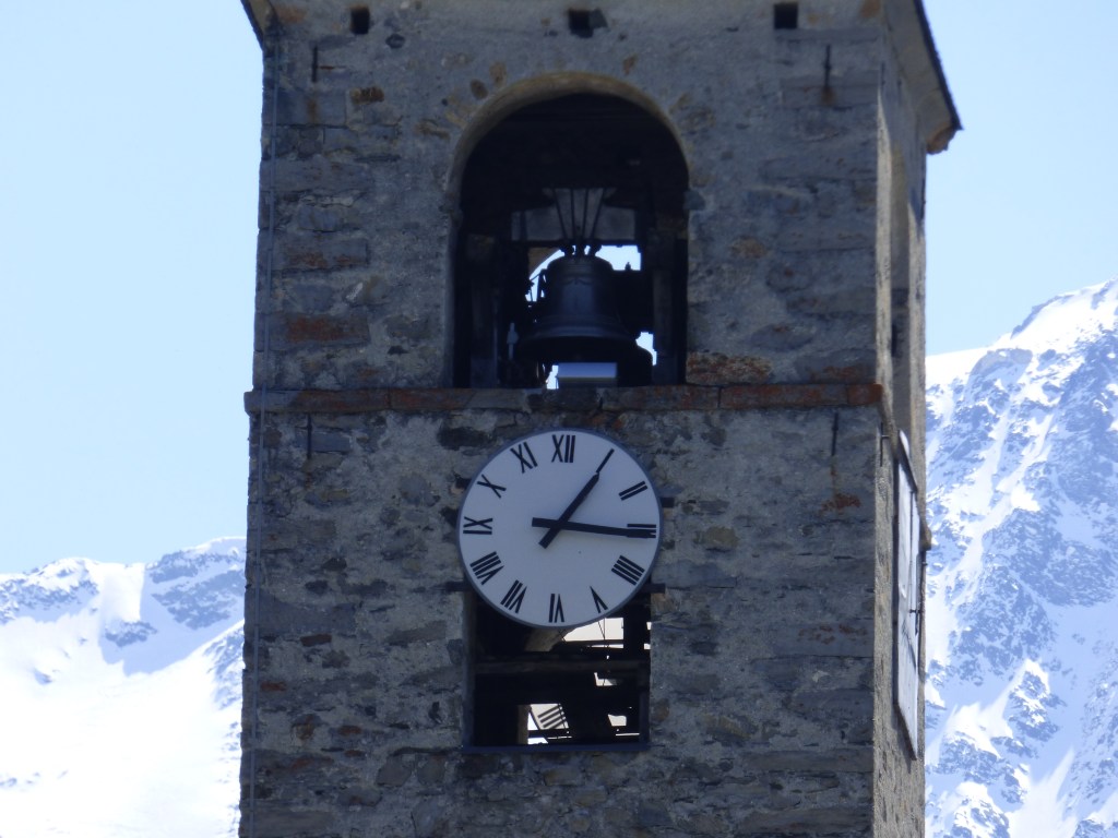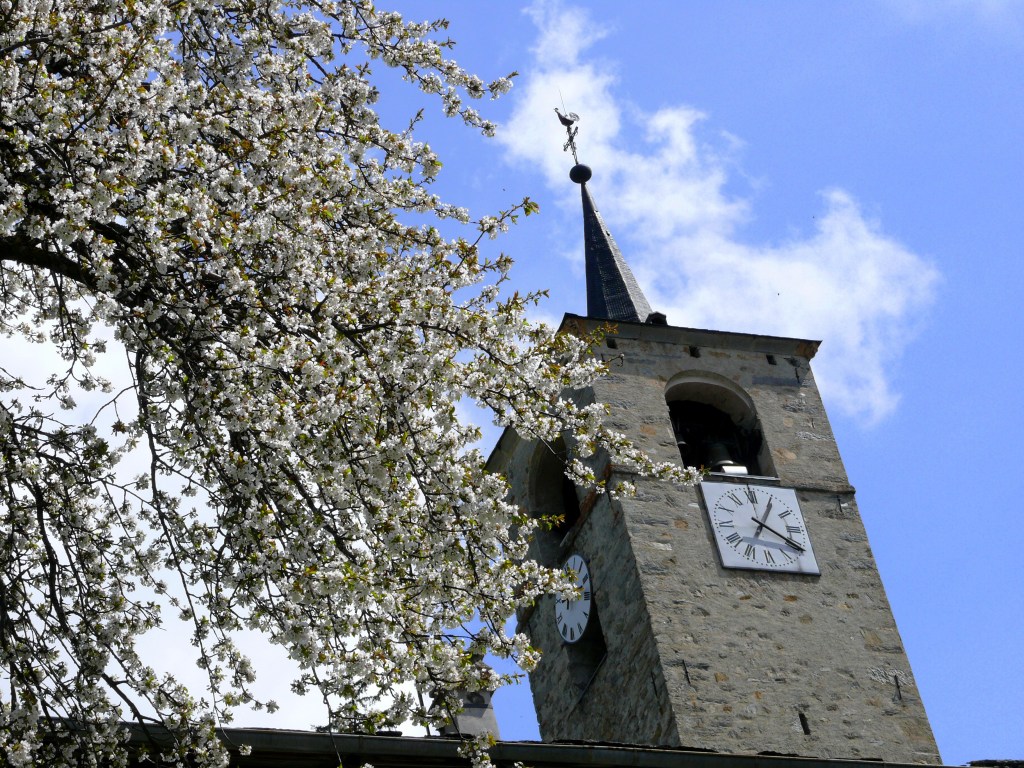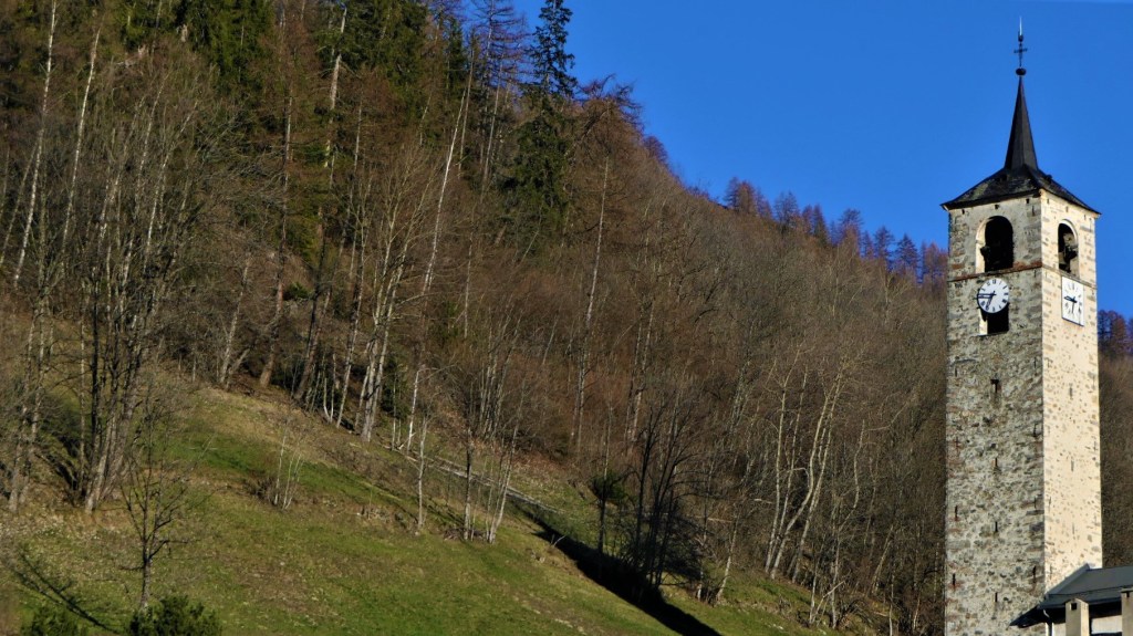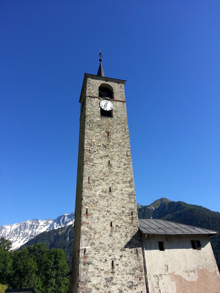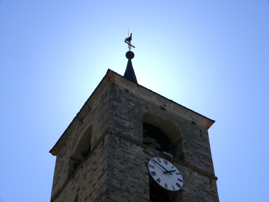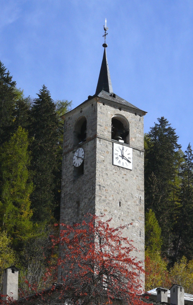 Le clocher a été construit en 1699 par Nicolas Calcia et son fils Pierre, aidés de Pietro Jachetto, maitres maçons originaire de la paroisse de Riva en Val Sesia, pour la somme de 2 760 florins , (somme équivalente à plus de la moitié de celle payée pour le bâtiment de l’église)