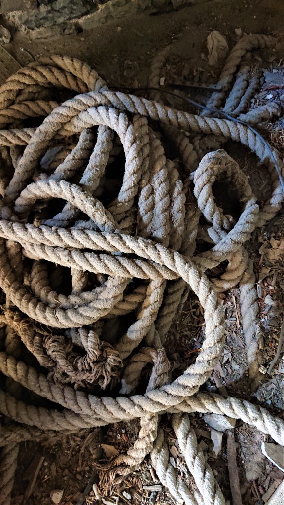 Affalée au pied de l’escalier : l’ancienne très longue corde qui probablement servait à mettre en branle les cloches avant l’installation de l’électricité.