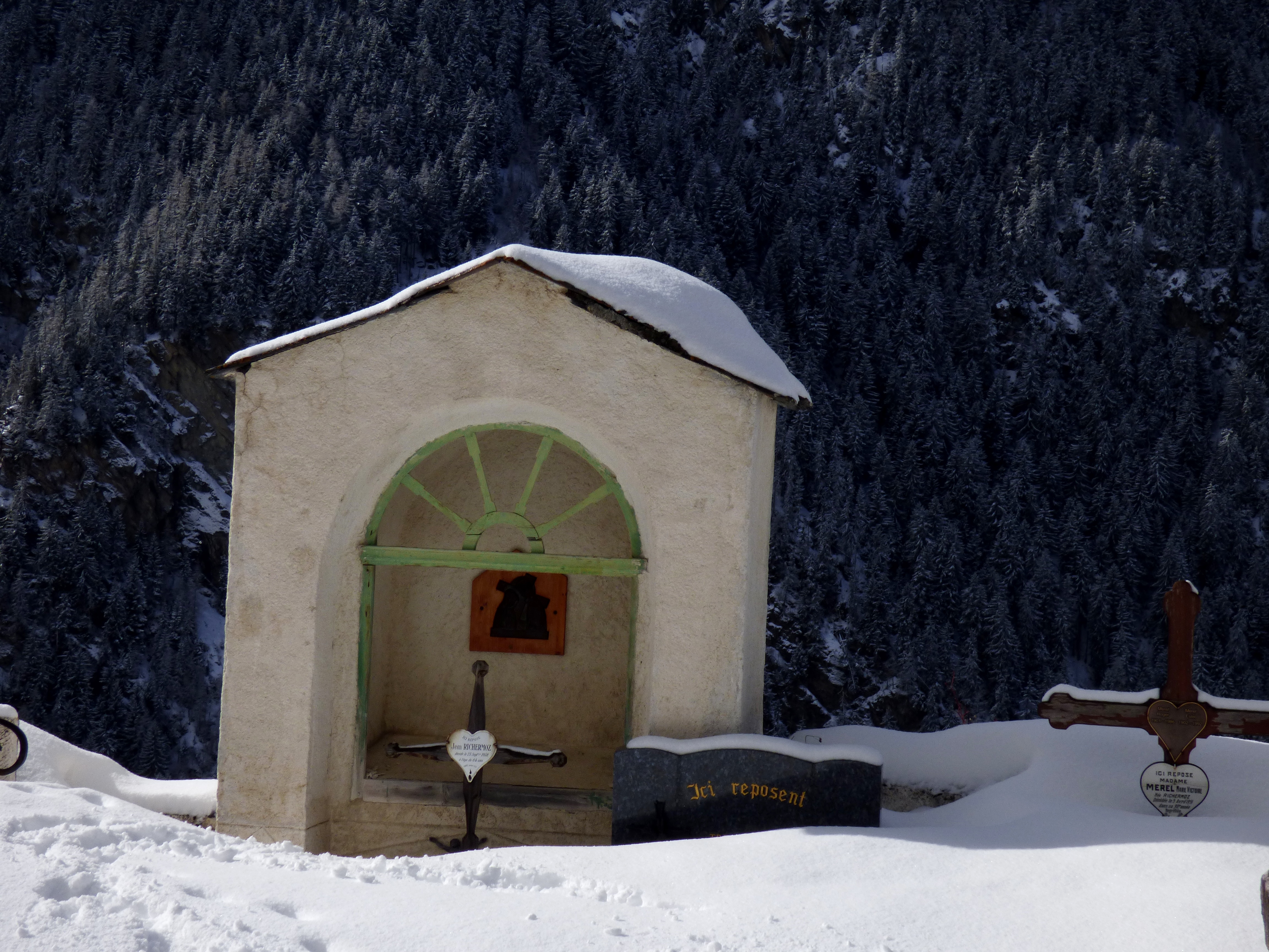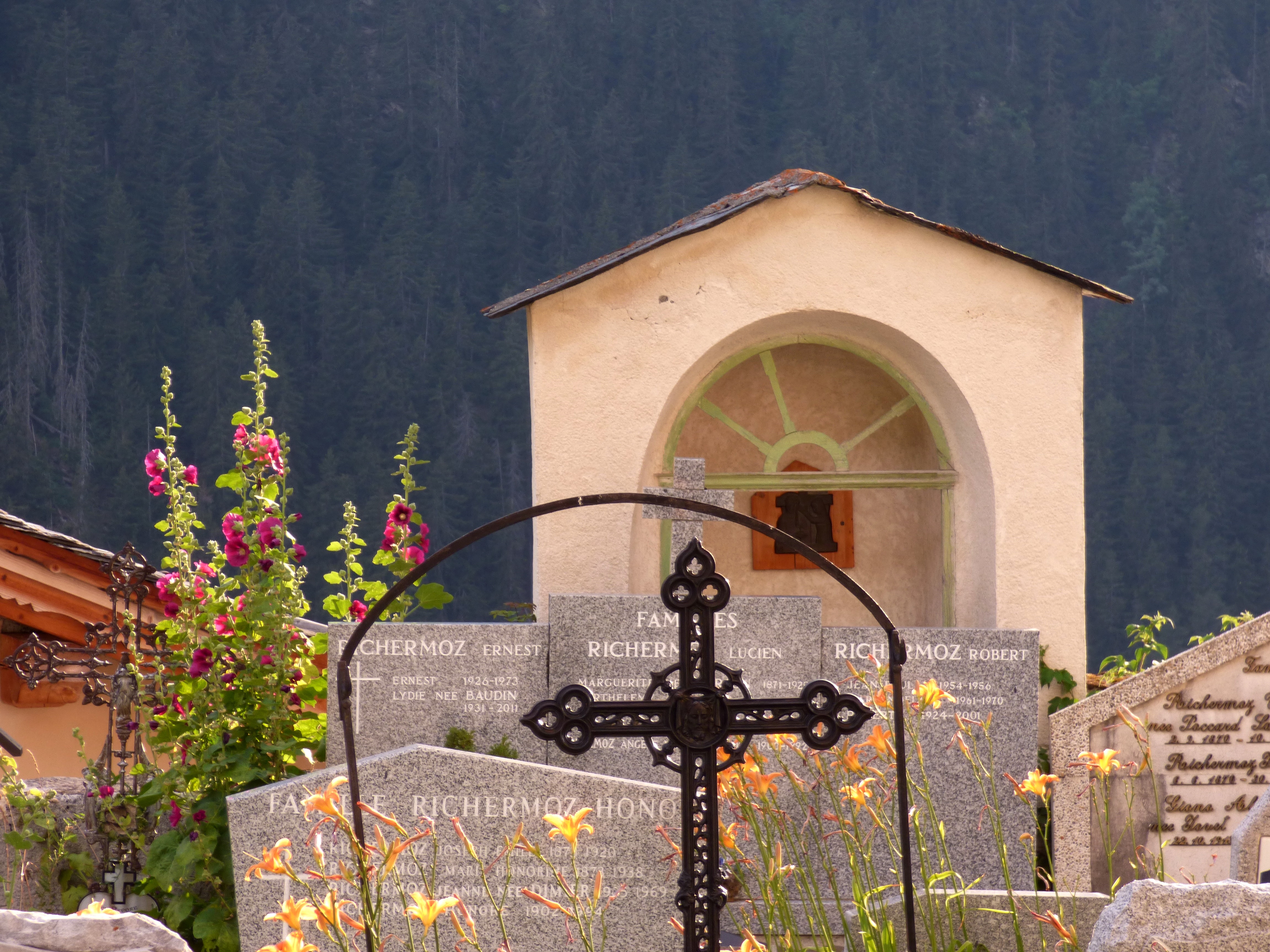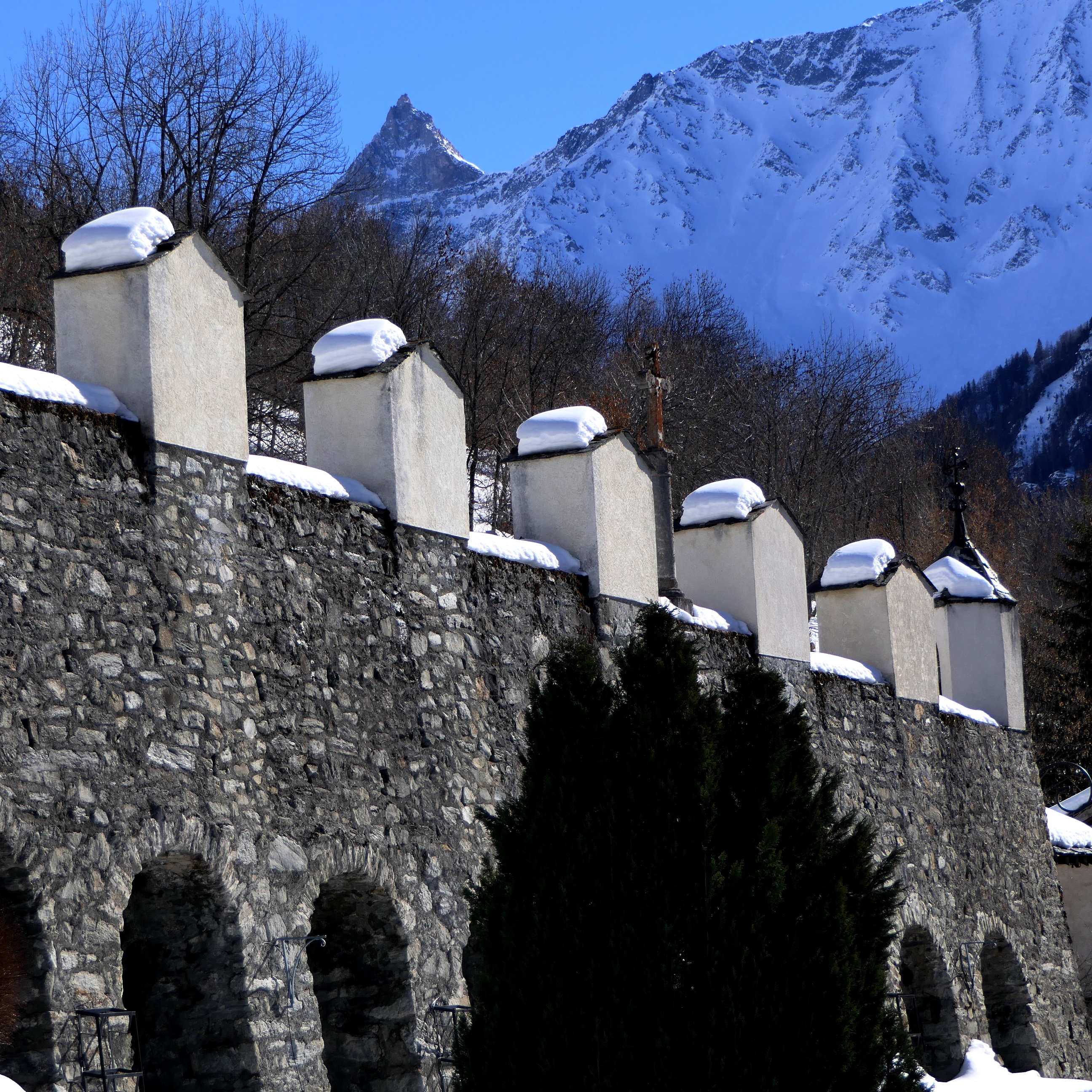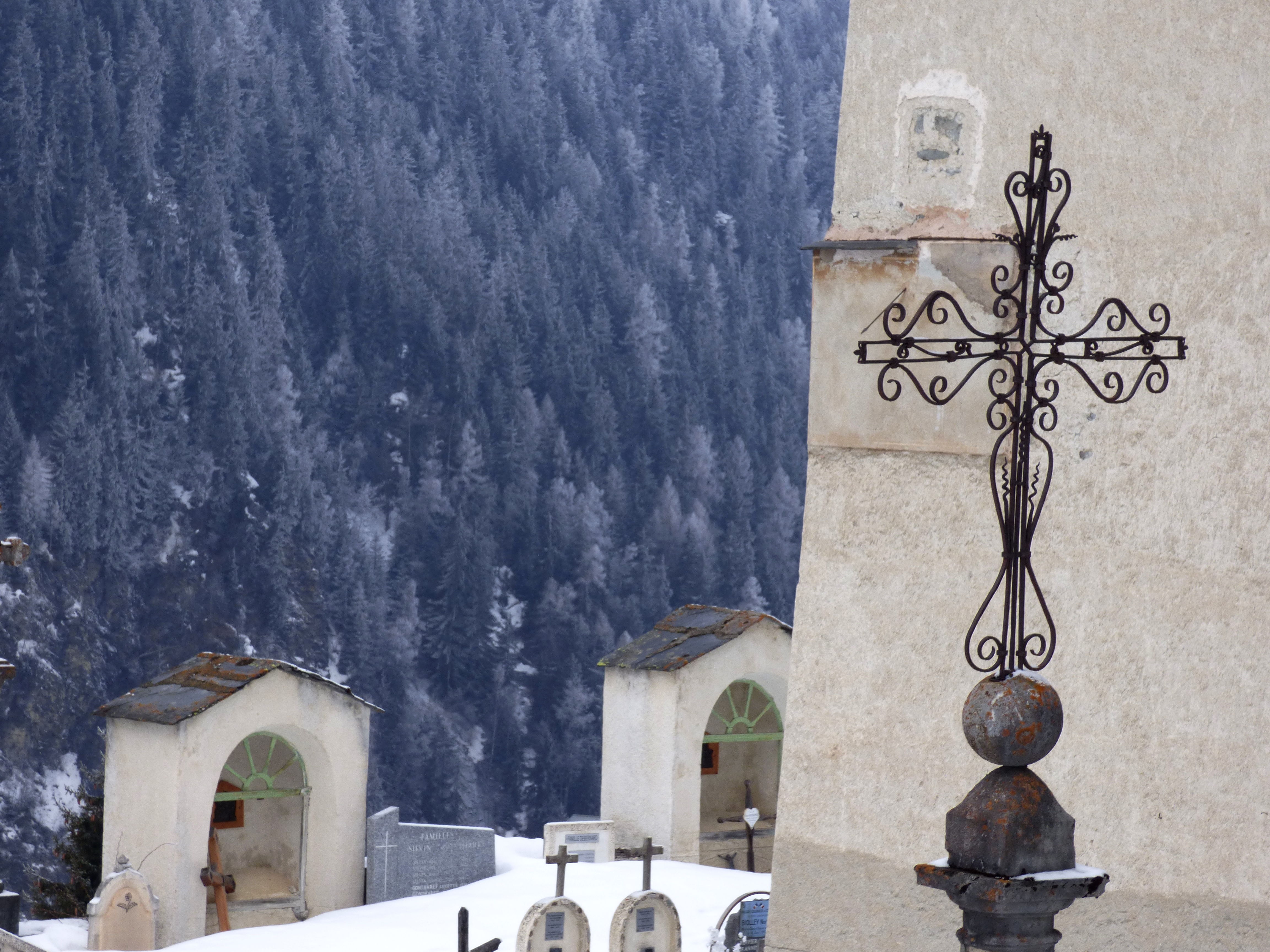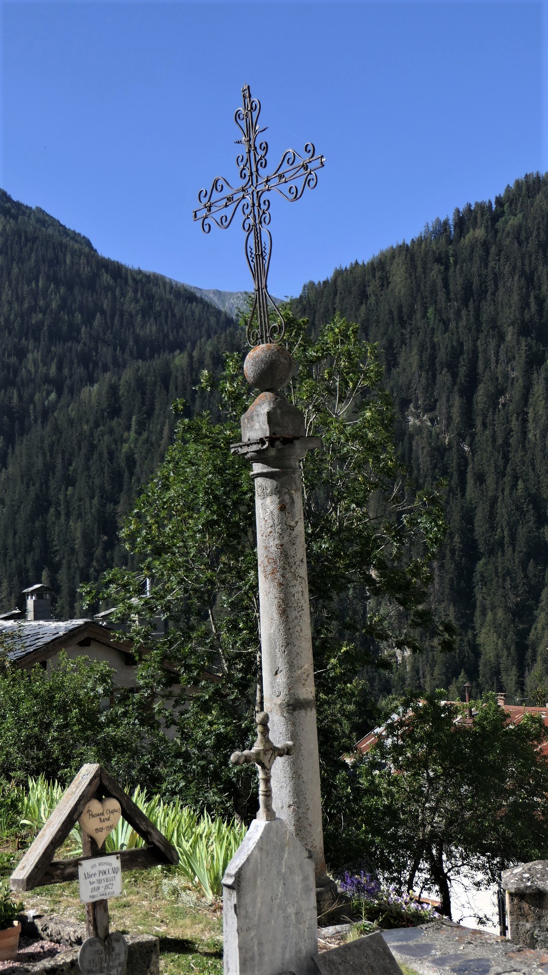 Comme la croix est à la jonction entre les vivants et les morts, elle les rassemble dans l’annonce de la bonne nouvelle du salut. C’est pourquoi elle accueille en général les vivants à l’entrée de l’église qui est aussi celle du cimetière. Dans l’ouest de la France, ces croix sont parfois de véritables monuments. Celle de Peisey est une des plus élégante de Tarentaise : un fine colonne de granit, un chapiteau daté de 1731 et au dessus, la même symbolique qu’au sommet des clochers : la croix (de fer forgé très