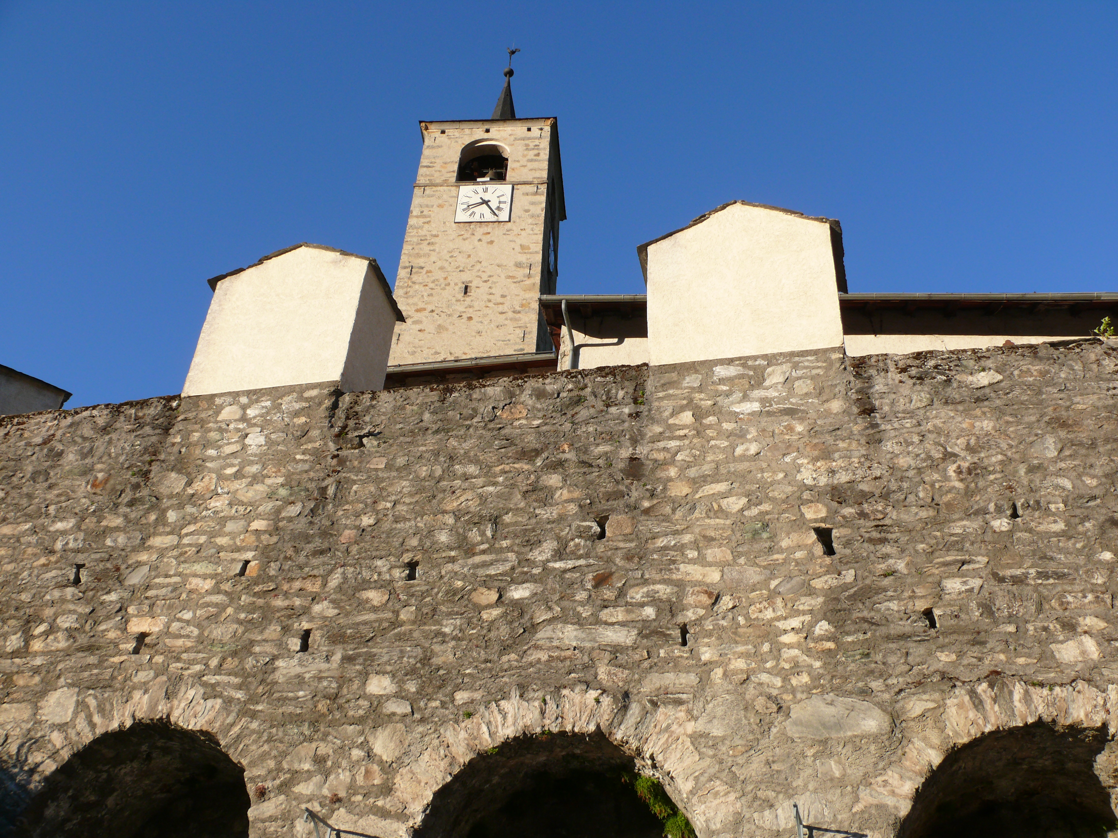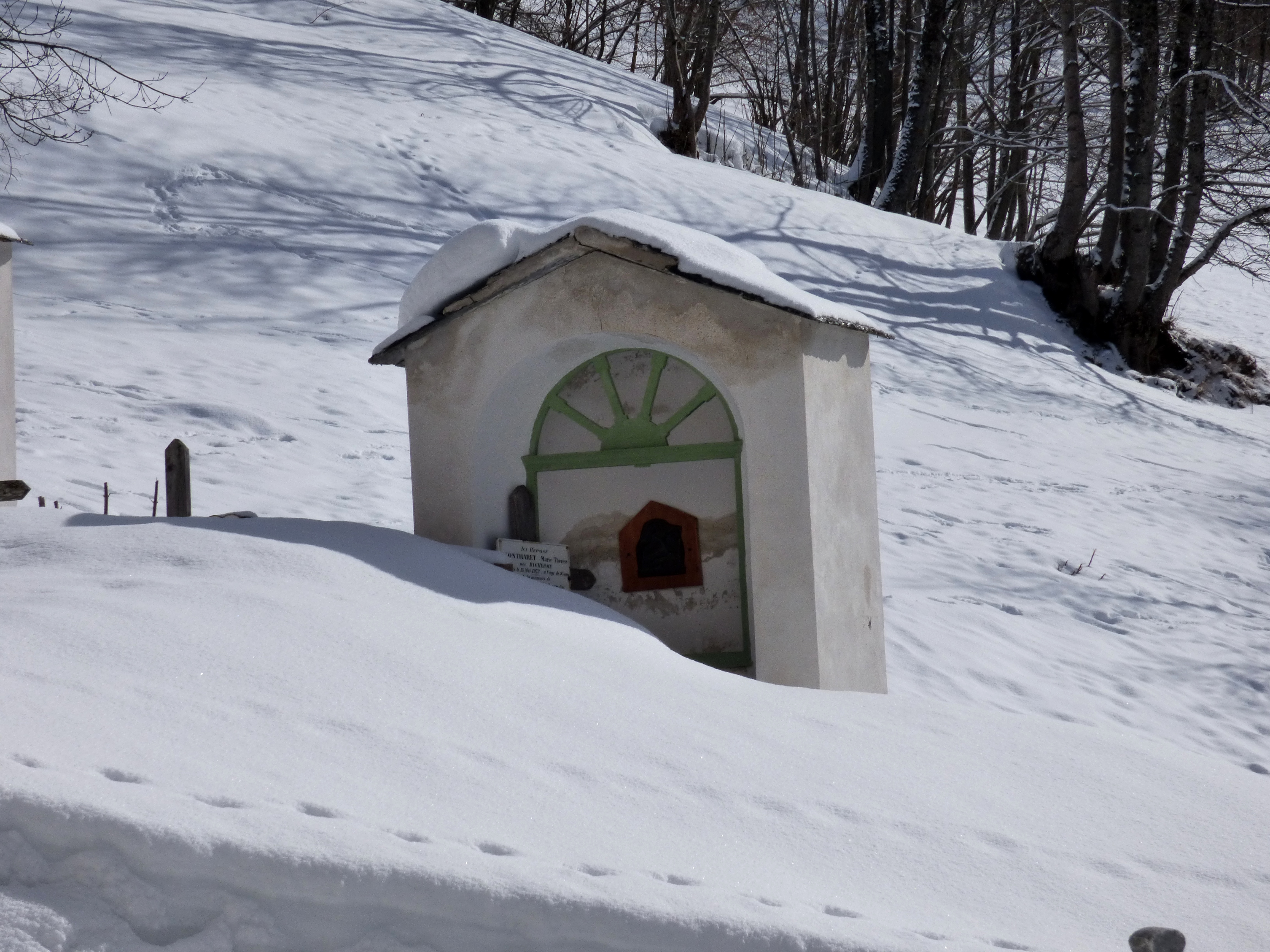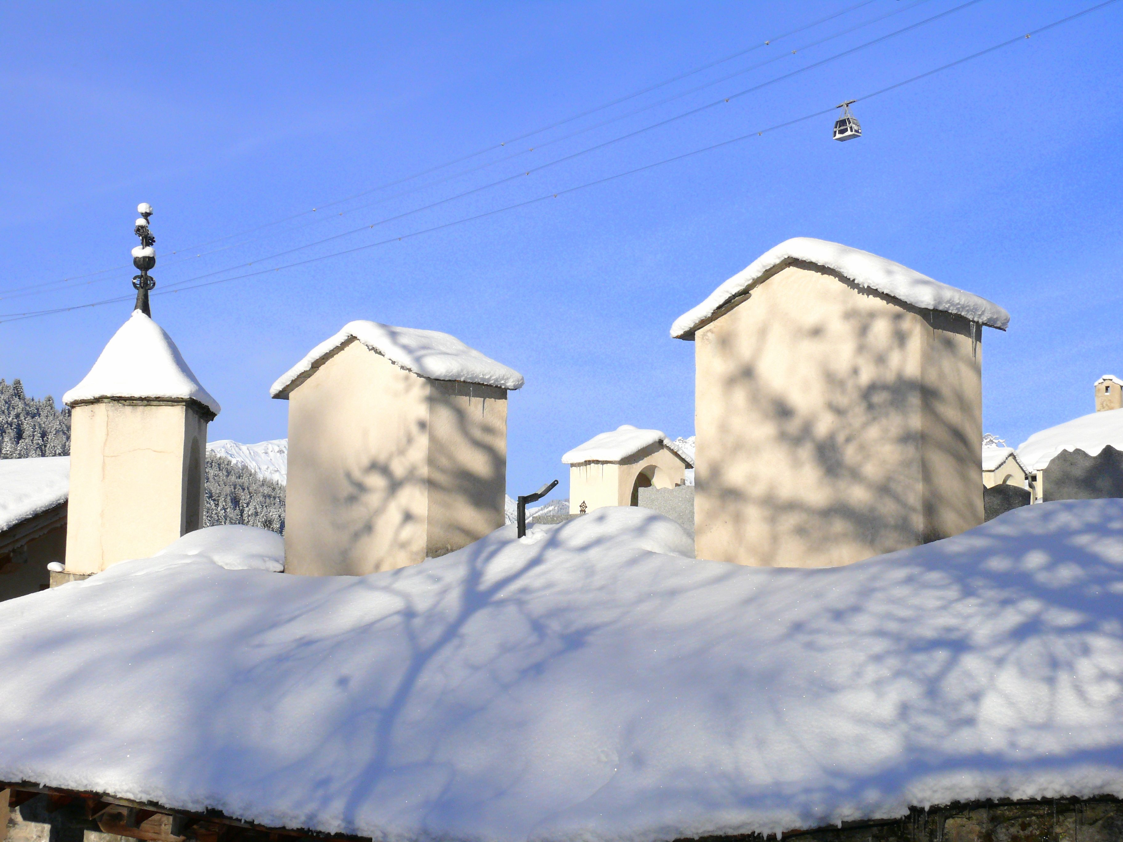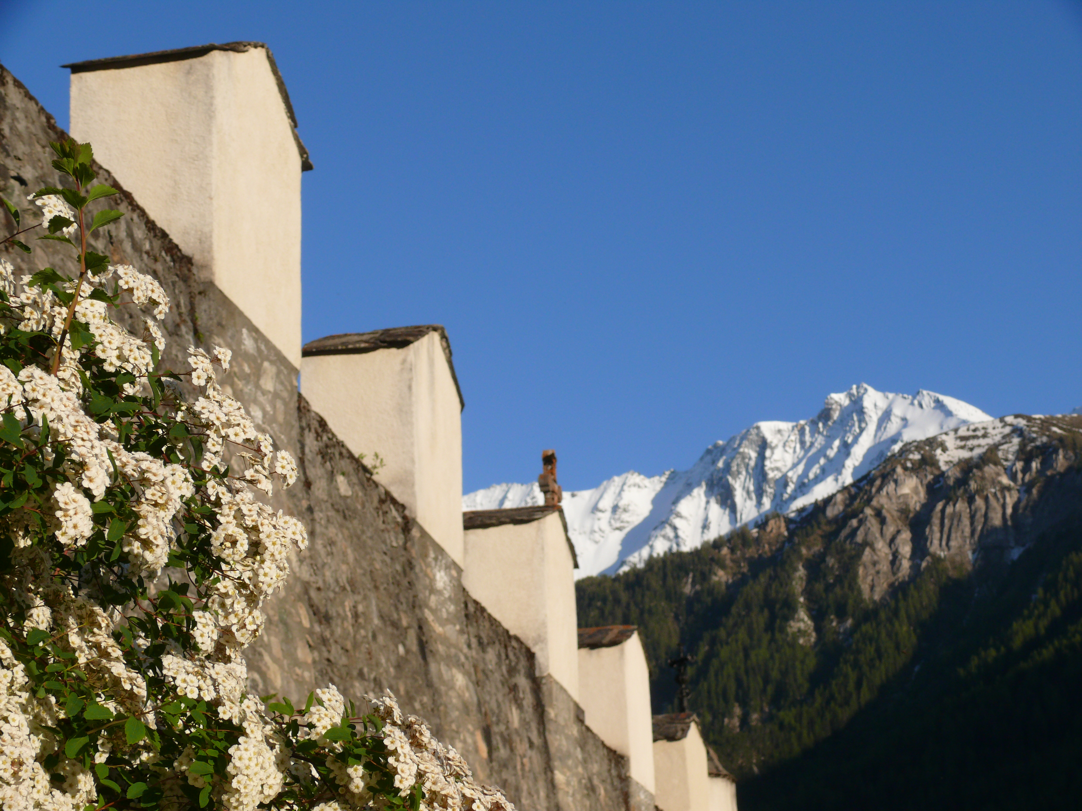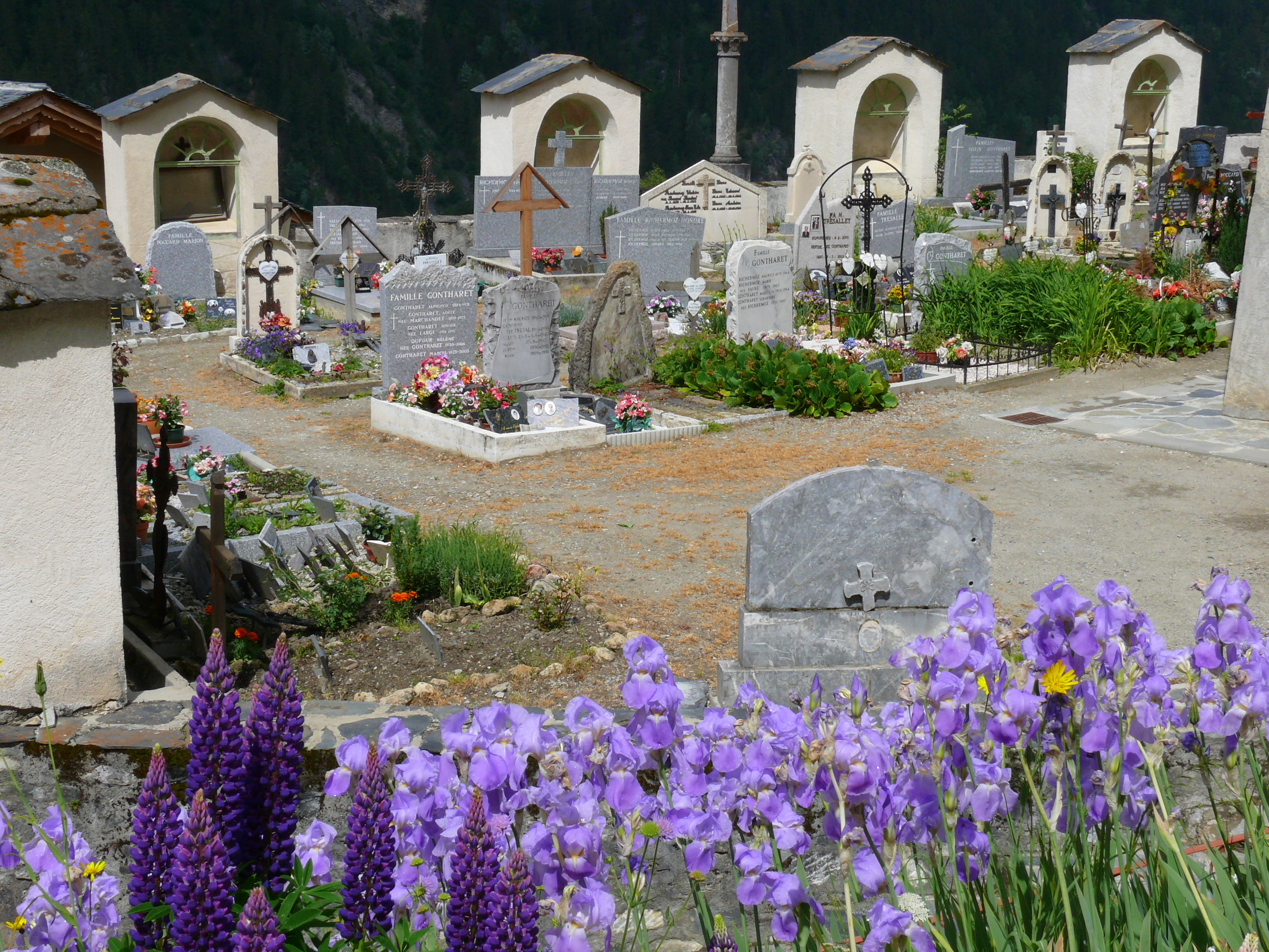 Comme la croix est à la jonction entre les vivants et les morts, elle les rassemble dans l’annonce de la bonne nouvelle du salut. C’est pourquoi elle accueille en général les vivants à l’entrée de l’église qui est aussi celle du cimetière. Dans l’ouest de la France, ces croix sont parfois de véritables monuments. Celle de Peisey est une des plus élégante de Tarentaise : un fine colonne de granit, un chapiteau daté de 1731 et au dessus, la même symbolique qu’au sommet des clochers : la croix (de fer forgé très