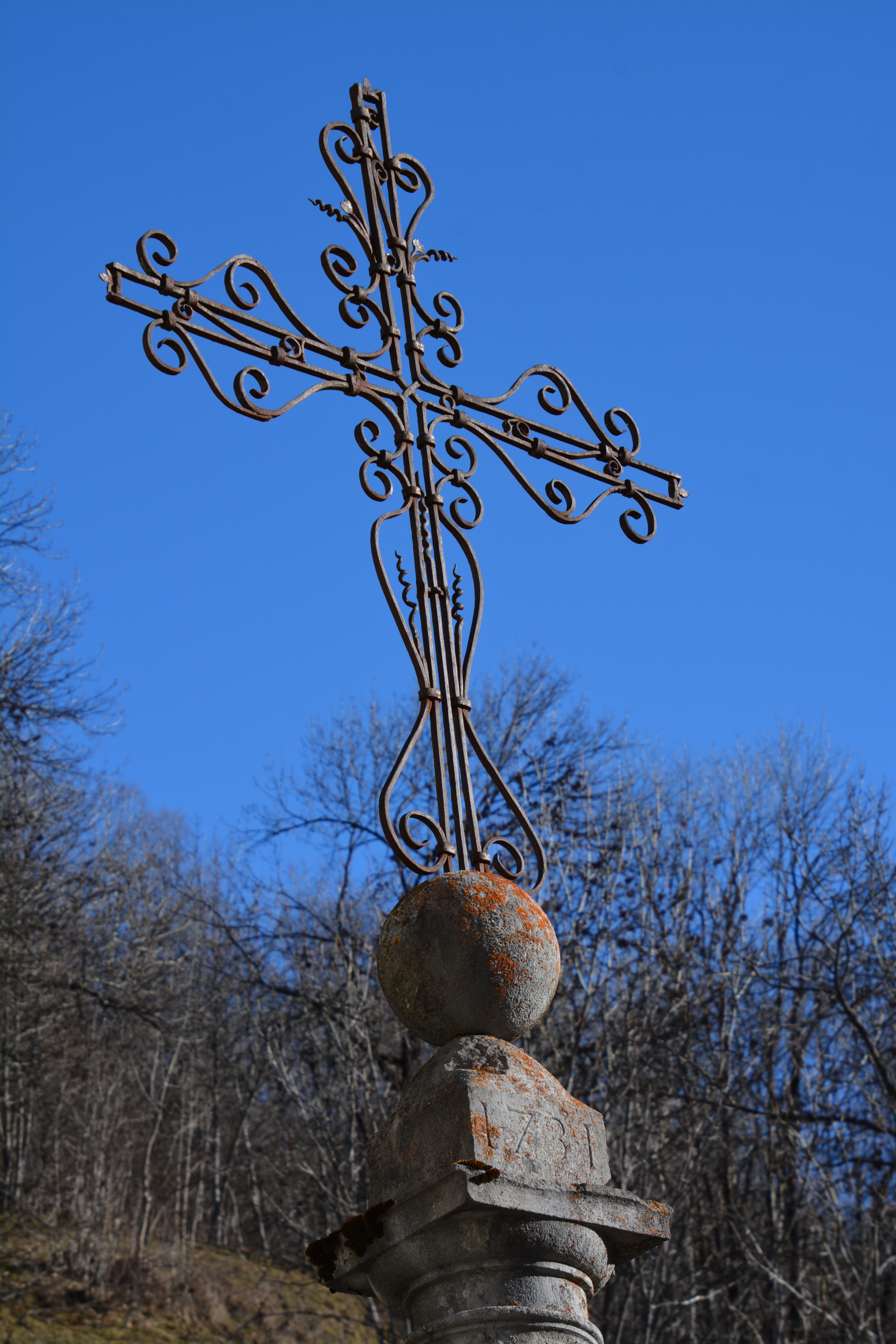 ouvragé) plantée sur la boule-monde, en granit. Le problème avec les dates c’est que celle du socle de la croix …est plus tardive que celle du sommet ! Le socle est de 1776, installé 45 ans après la croix.