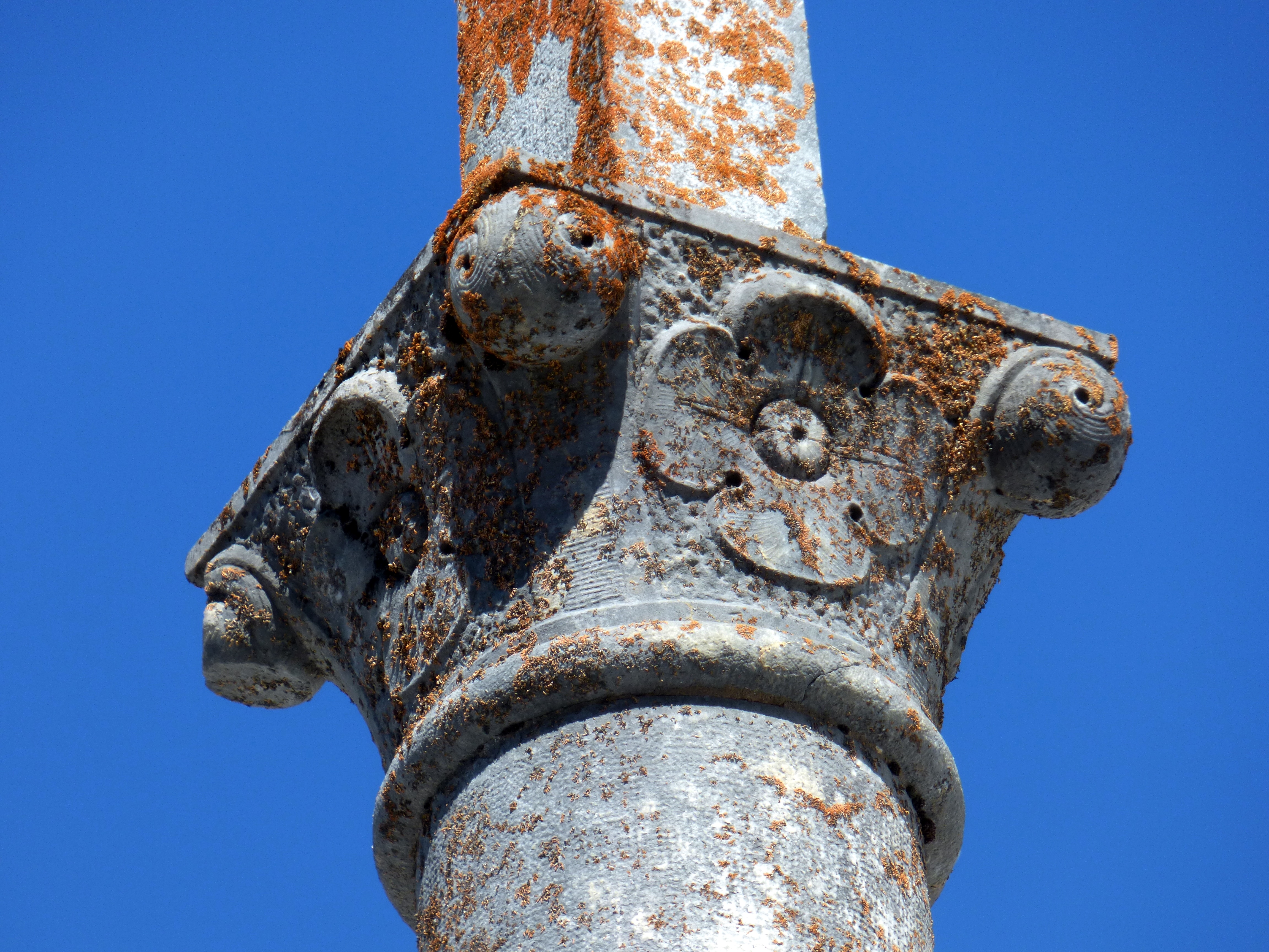 sommet d’une colonne, avec un chapiteau très ouvragé : une fleur sur chaque face et un rouleau à chaque angle. Côté nord-est, donnant sur le cimetière, la croix est gravée d’une phrase du crédo”je crois en la résurrection des corps et la vie éternelle”
