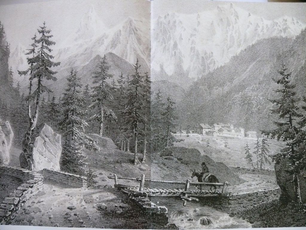 (gravure de P. Courtois faite en 1840). Le pont muletier, les bâtiments dont deux seulement on subsisté jusqu’à nous, la montagne de Bellecôte (3 417 m) et la pointe de l’Aliet (3109 m). Le site du pont a été “englouti” dans des ouvrages de défense contre les coulées de laves torrentielles)
