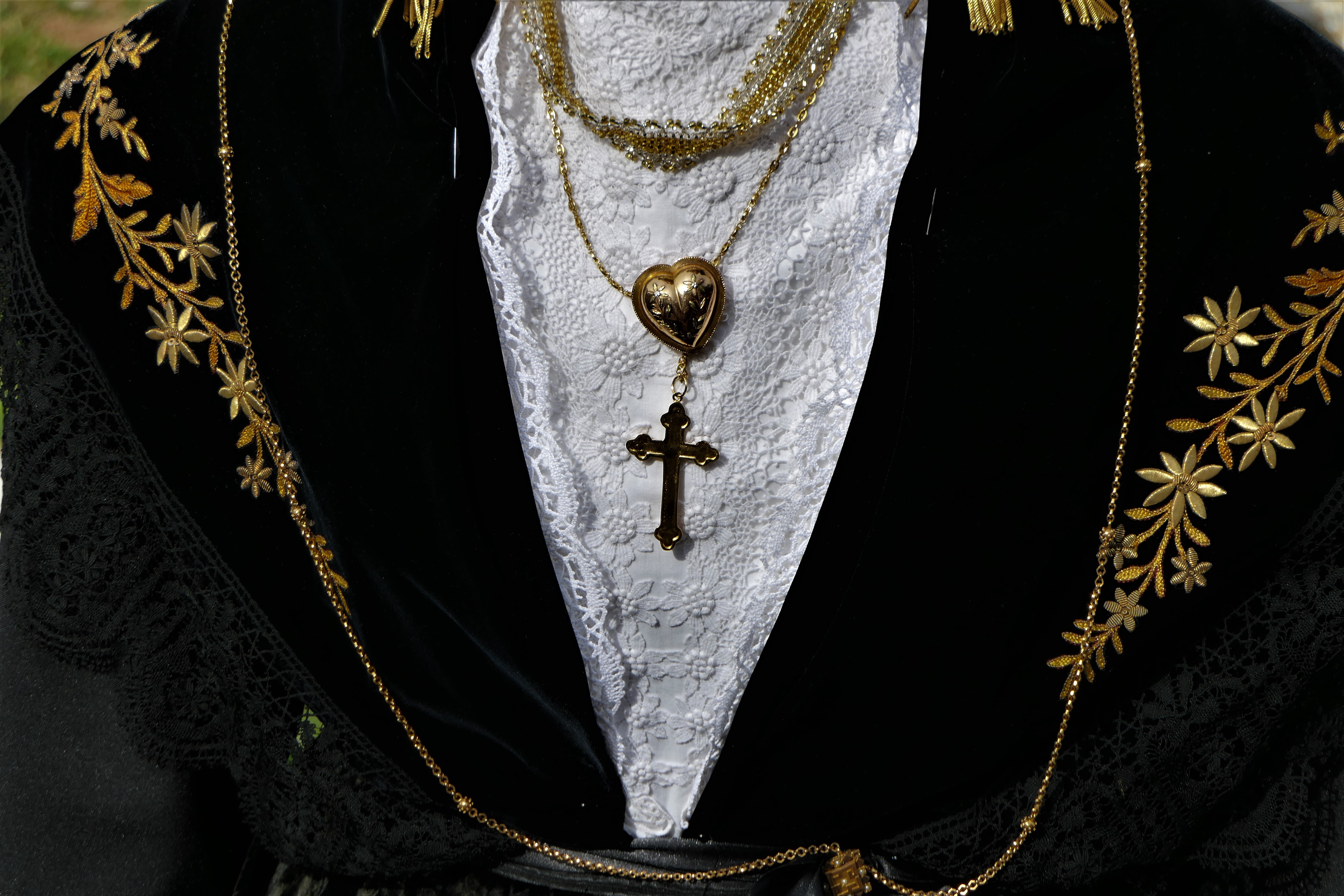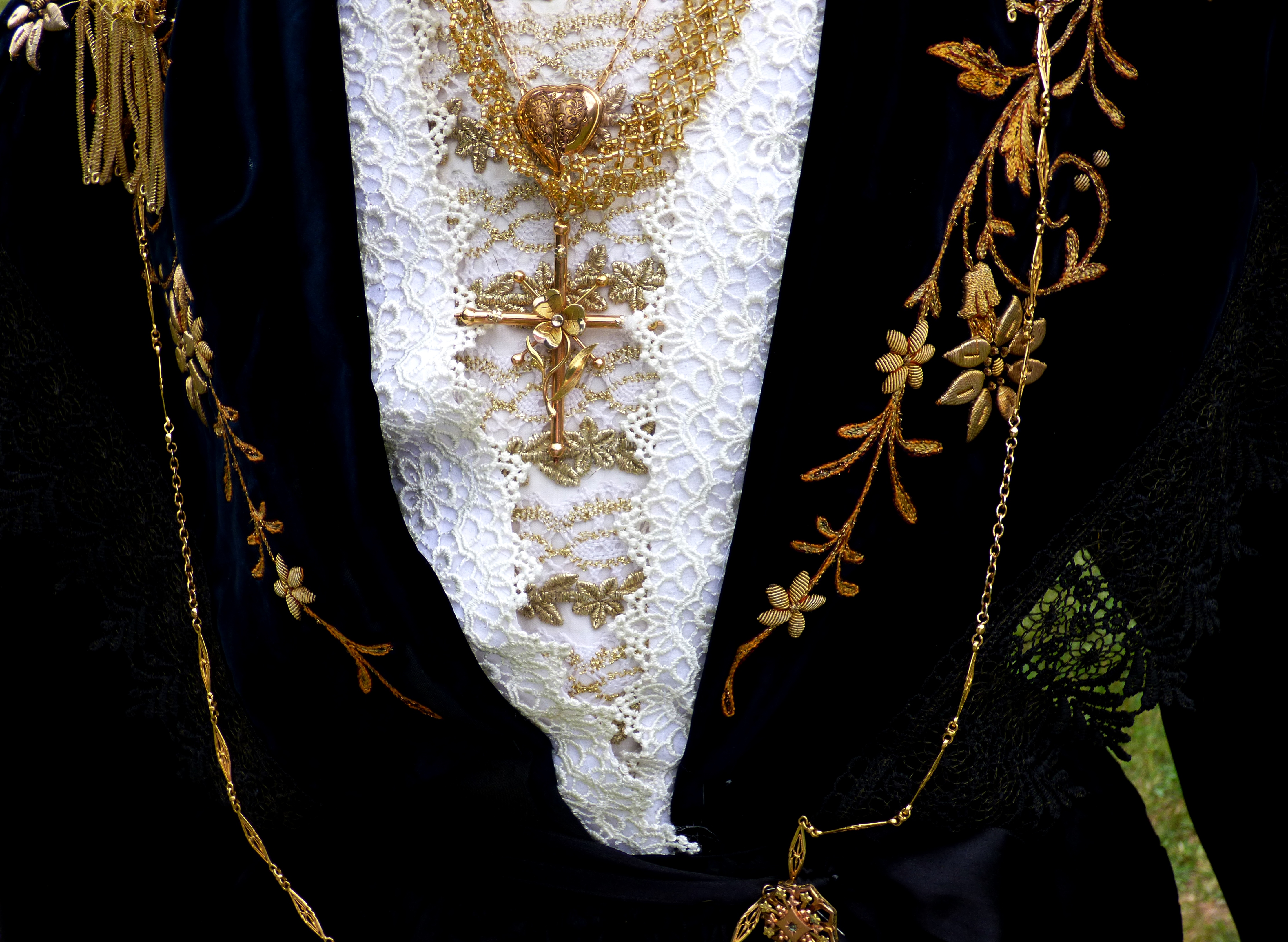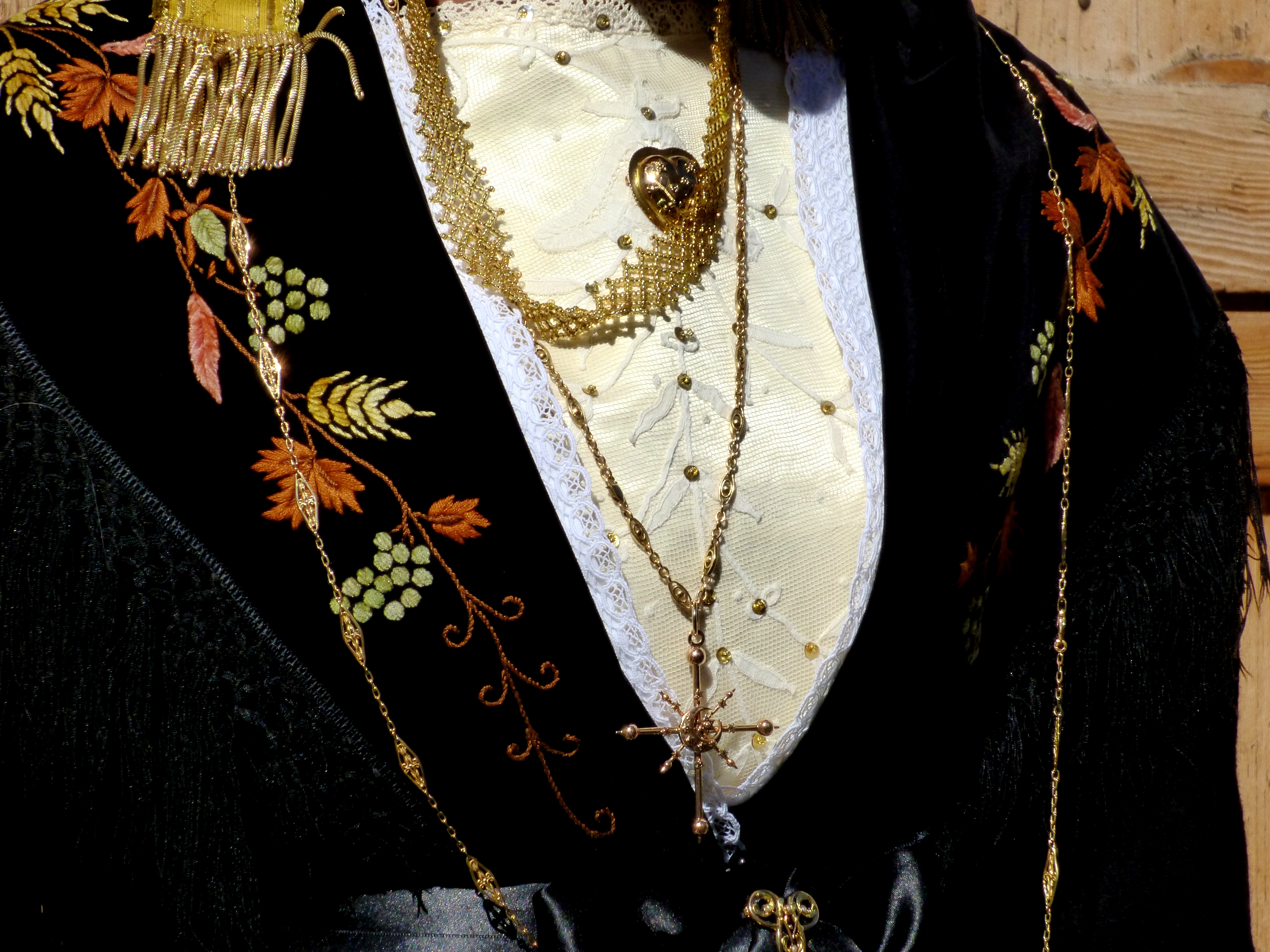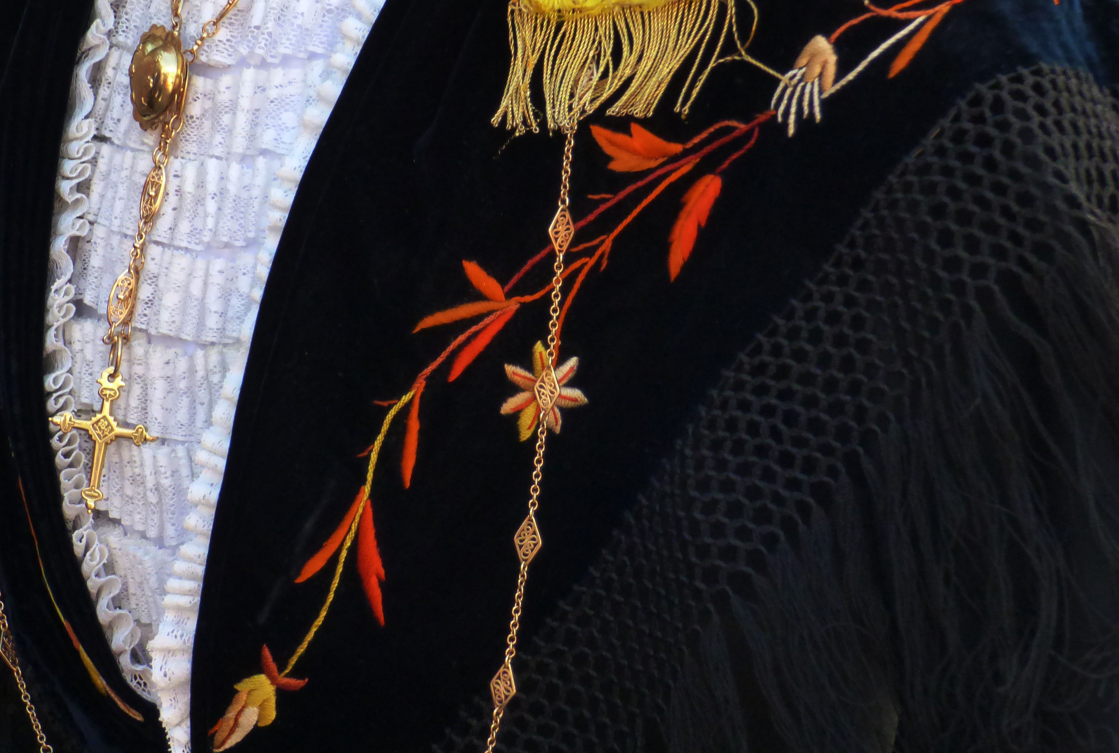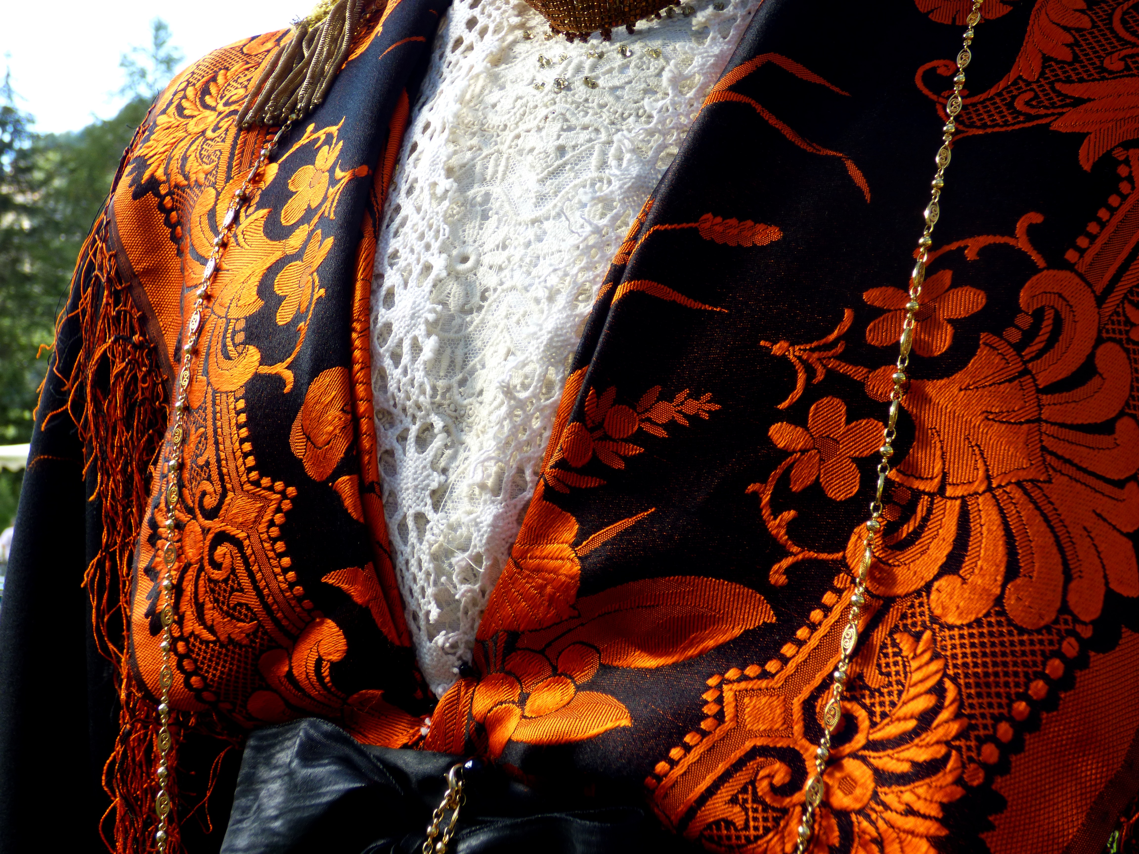 Il est bordé d’une dentelle qu’on fixe sur le châle : la modestie. Elle fait le lien entre le motif ou la matière du plastron et le motif ou la couleur du châle.