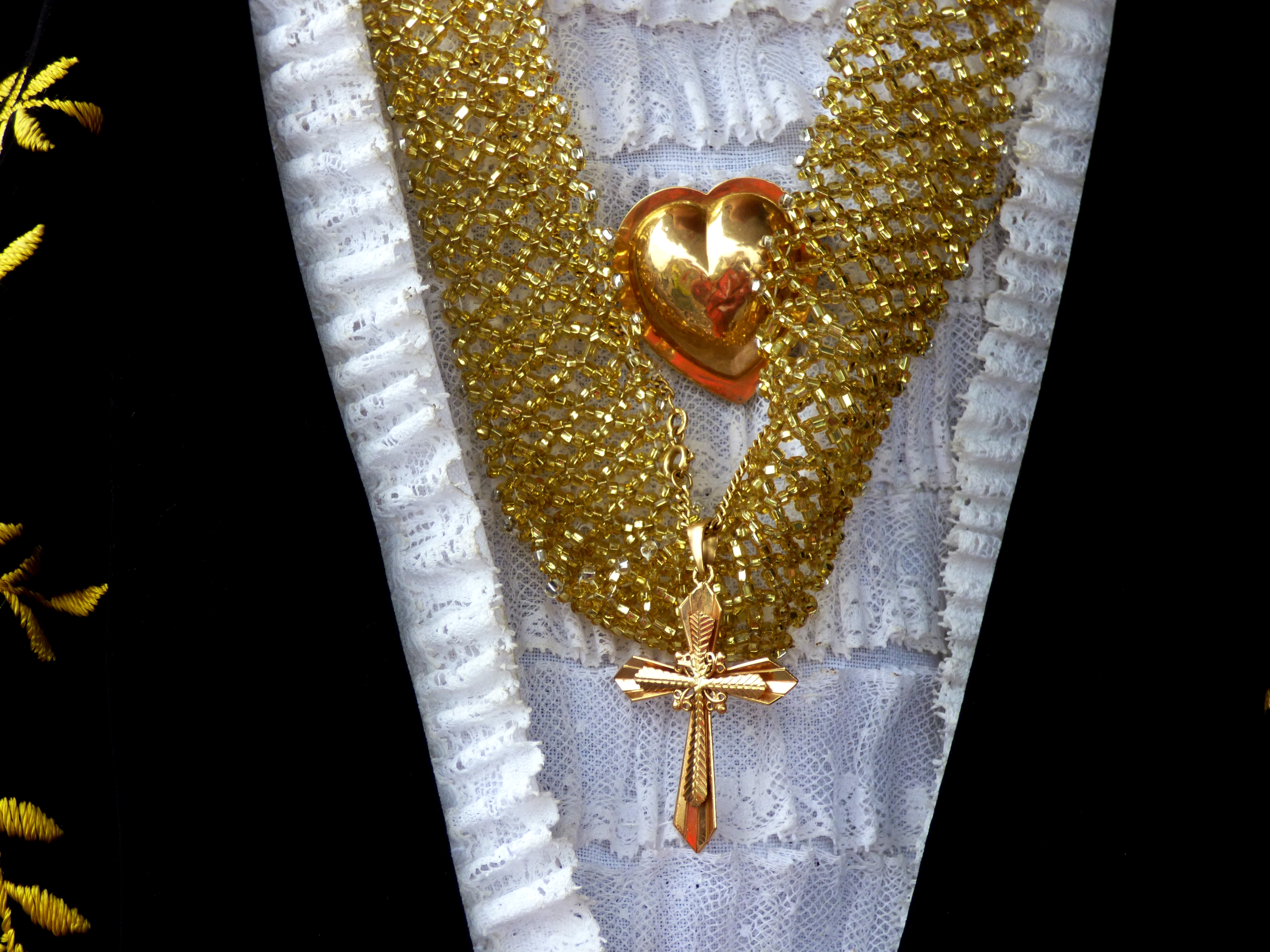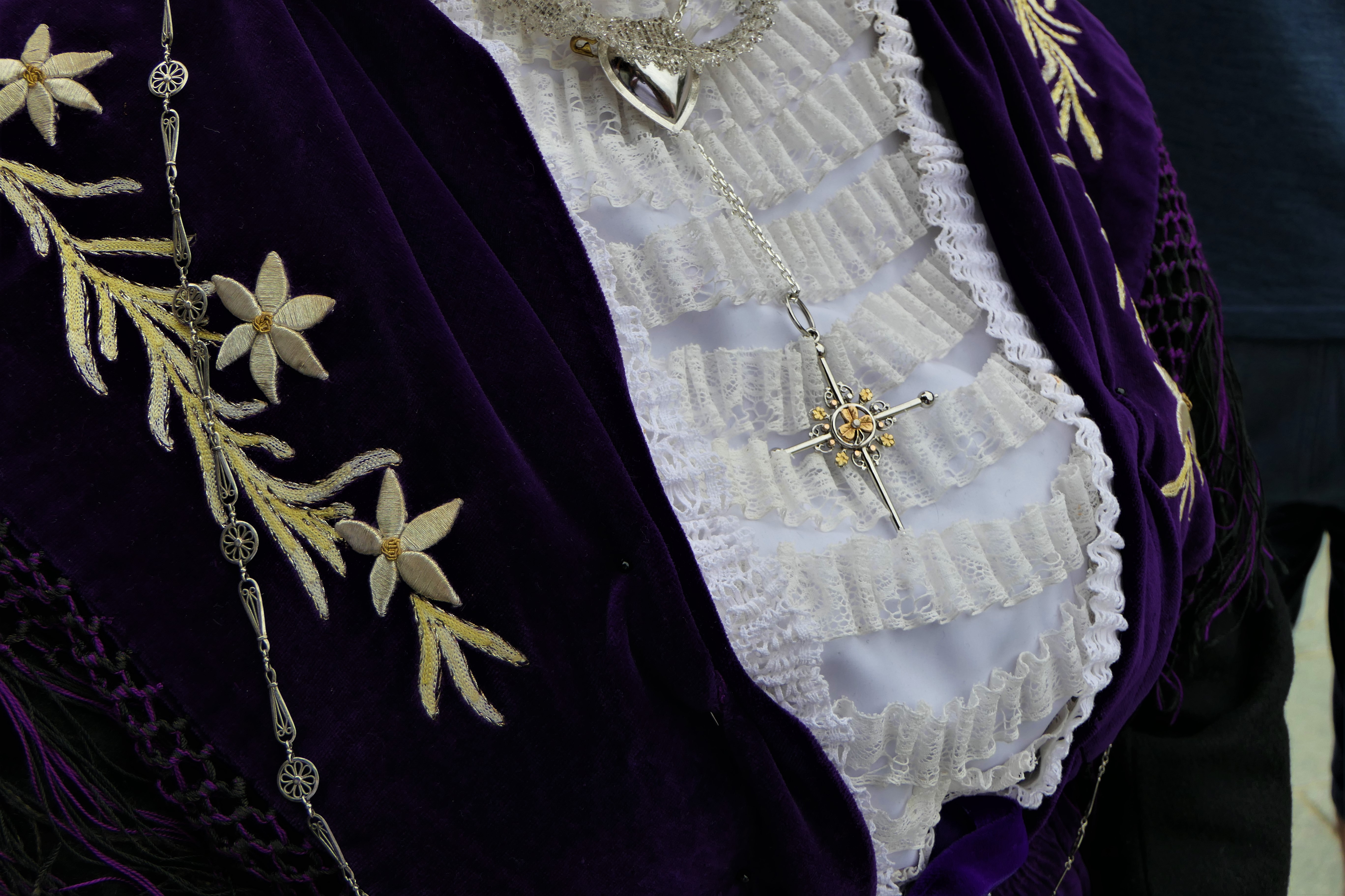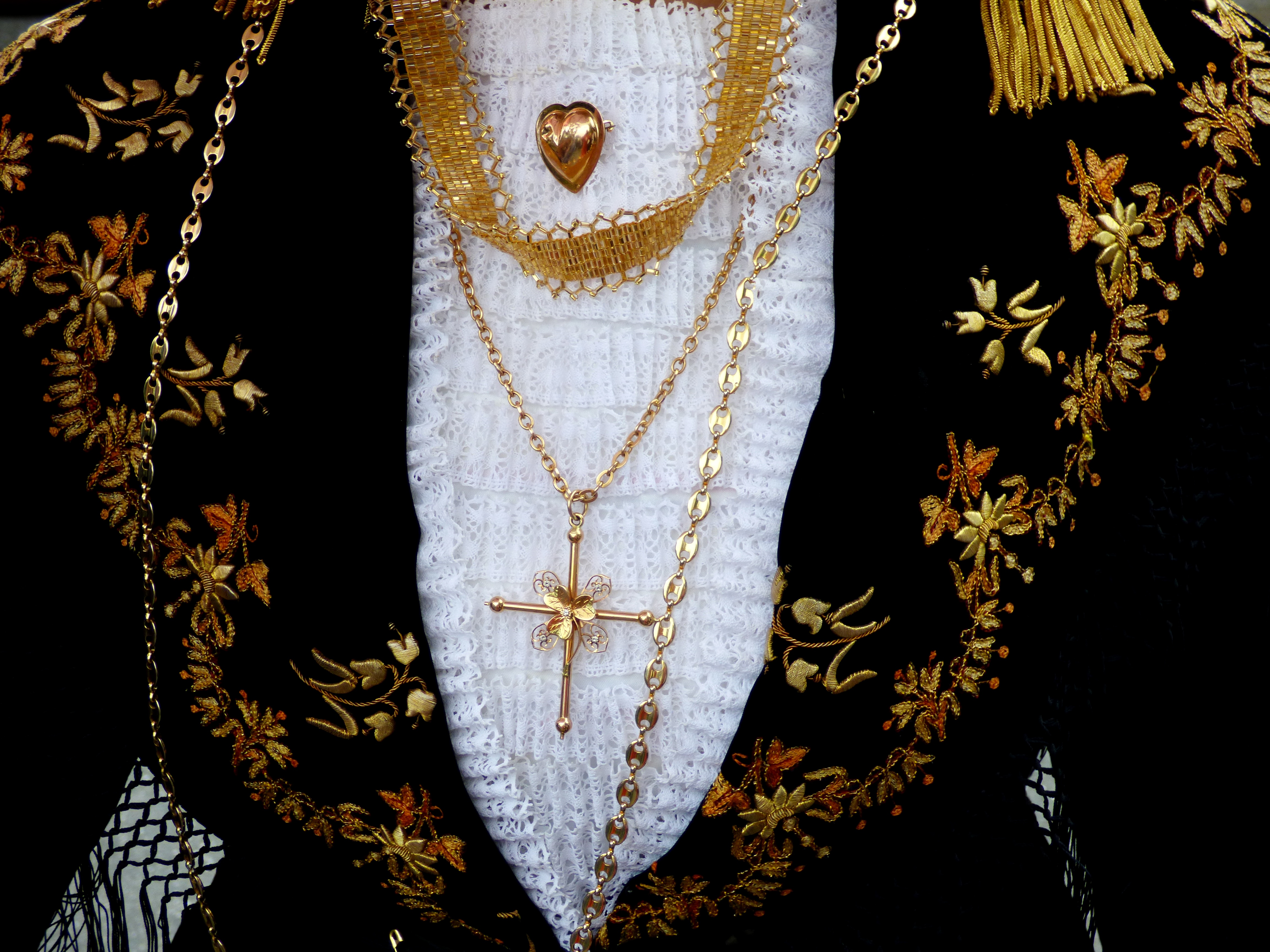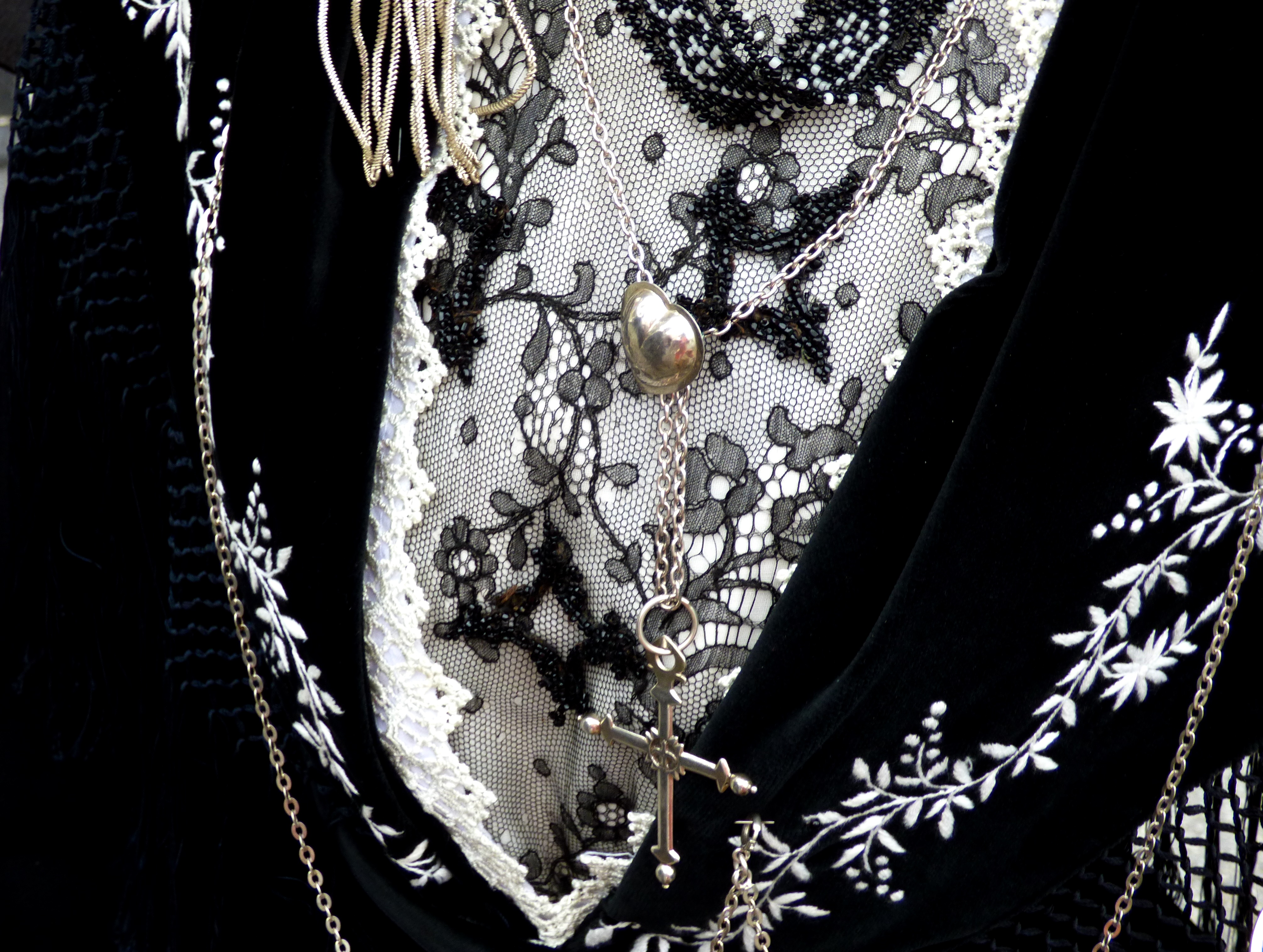 Il est bordé d’une dentelle qu’on fixe sur le châle : la modestie. Elle fait le lien entre le motif ou la matière du plastron et le motif ou la couleur du châle.