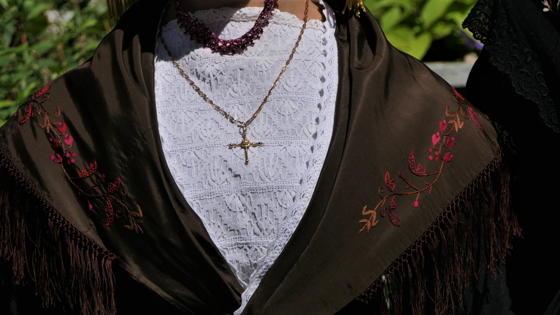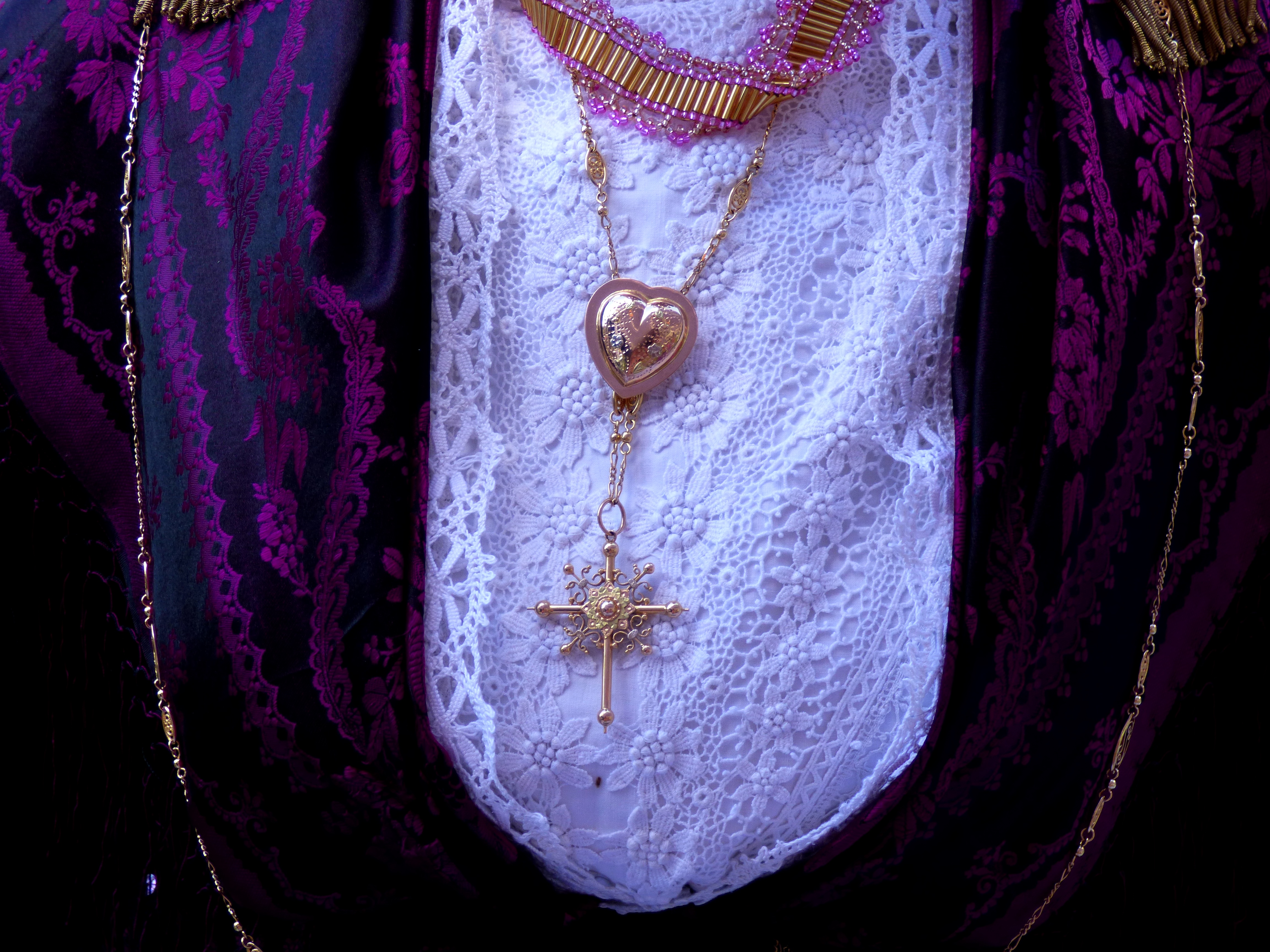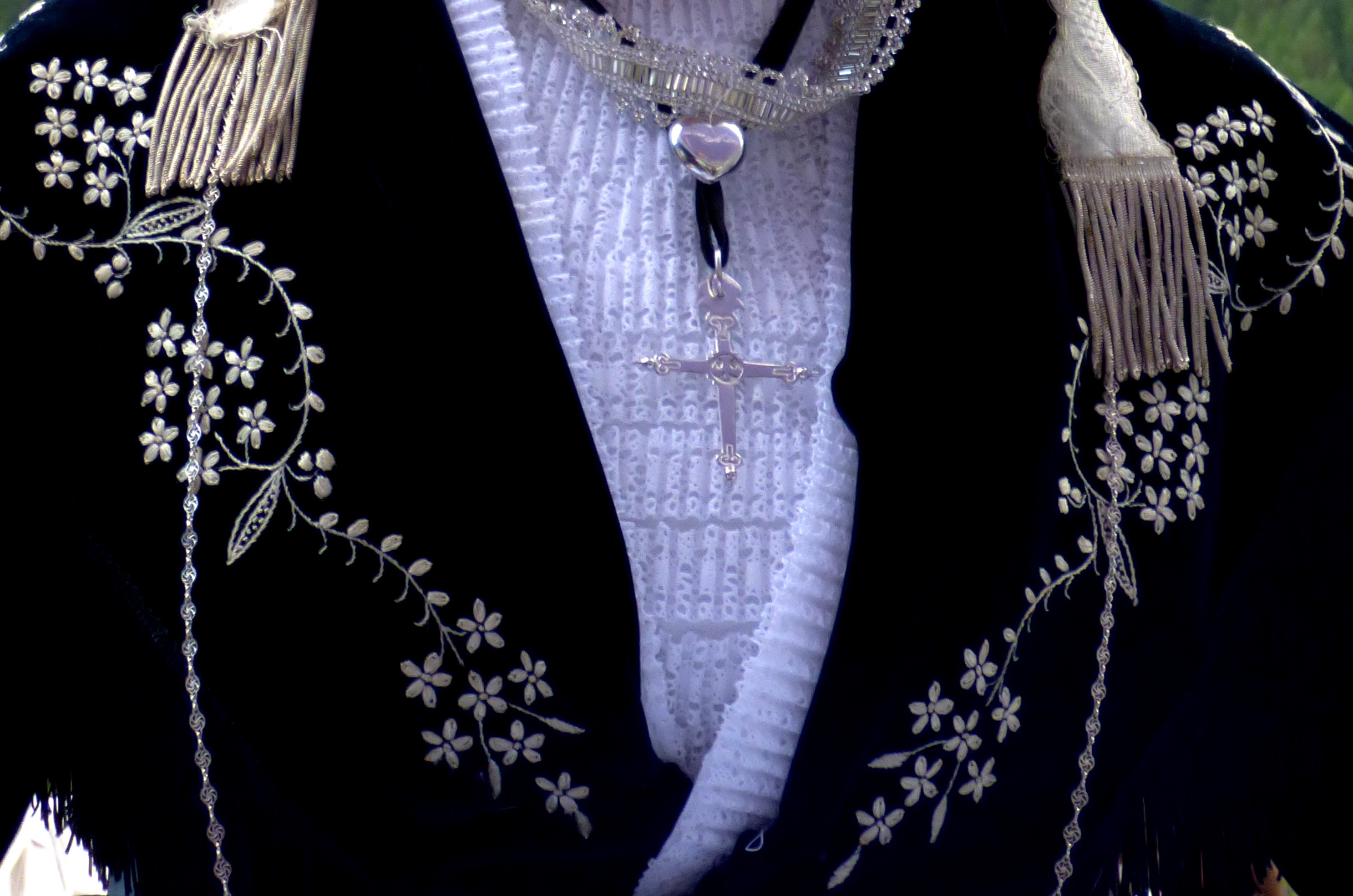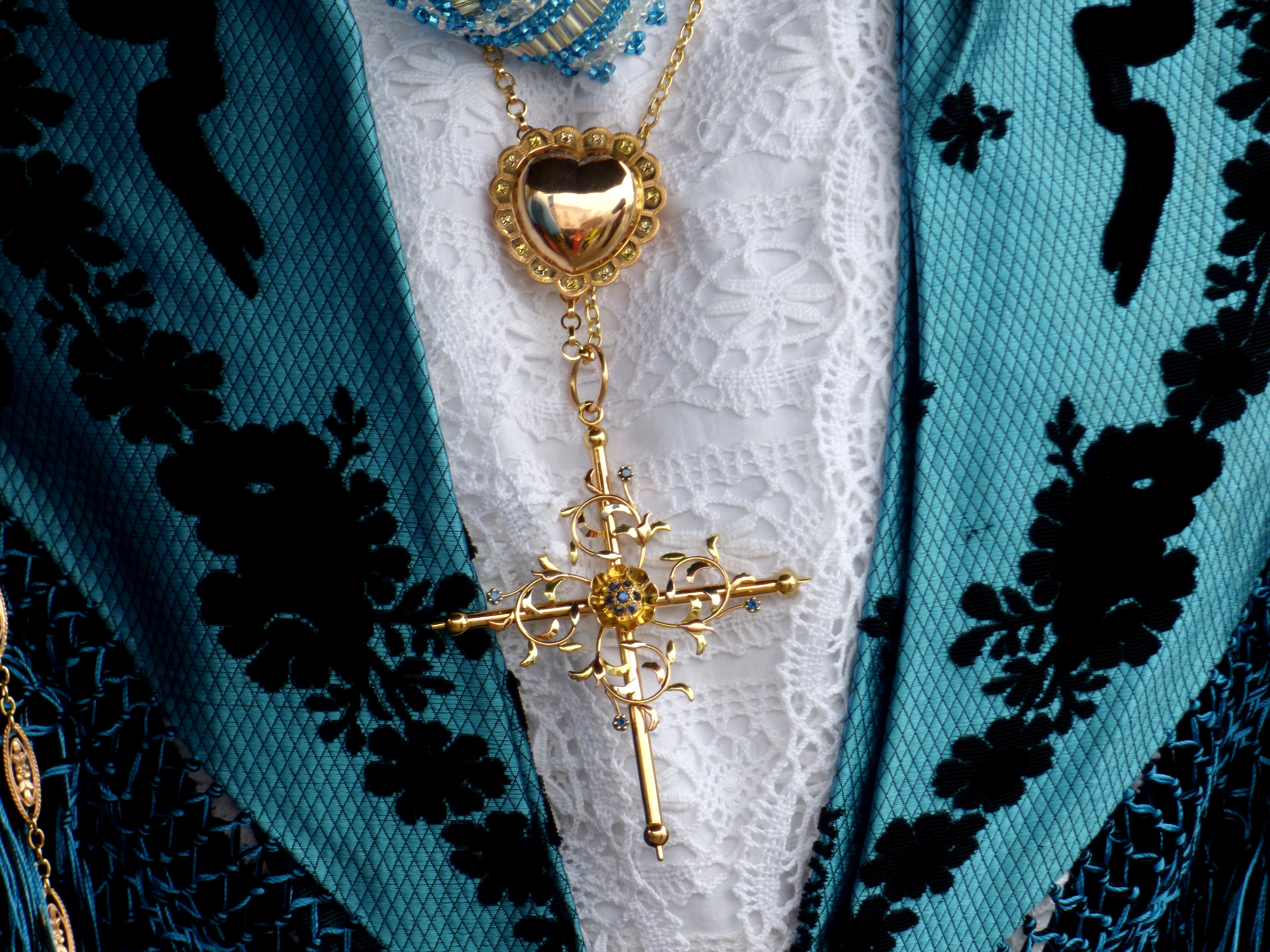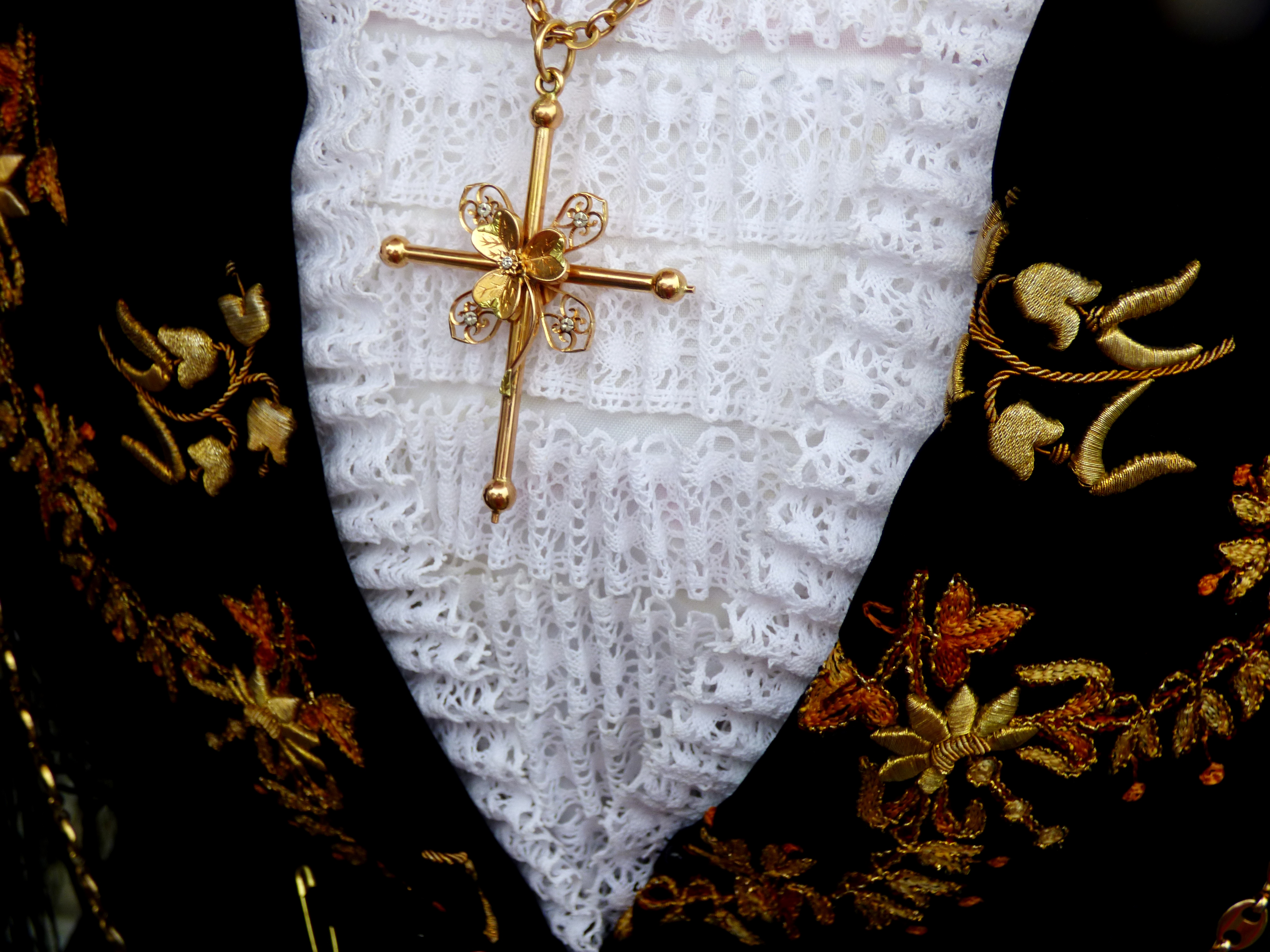 Il est bordé d’une dentelle qu’on fixe sur le châle : la modestie. Elle fait le lien entre le motif ou la matière du plastron et le motif ou la couleur du châle.