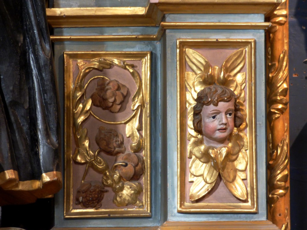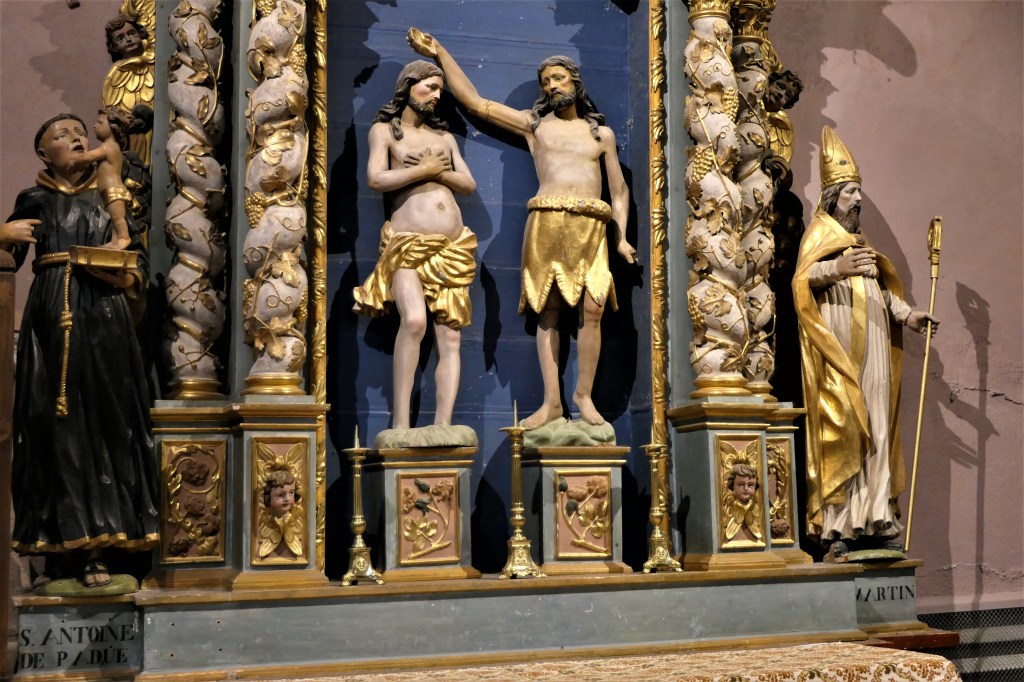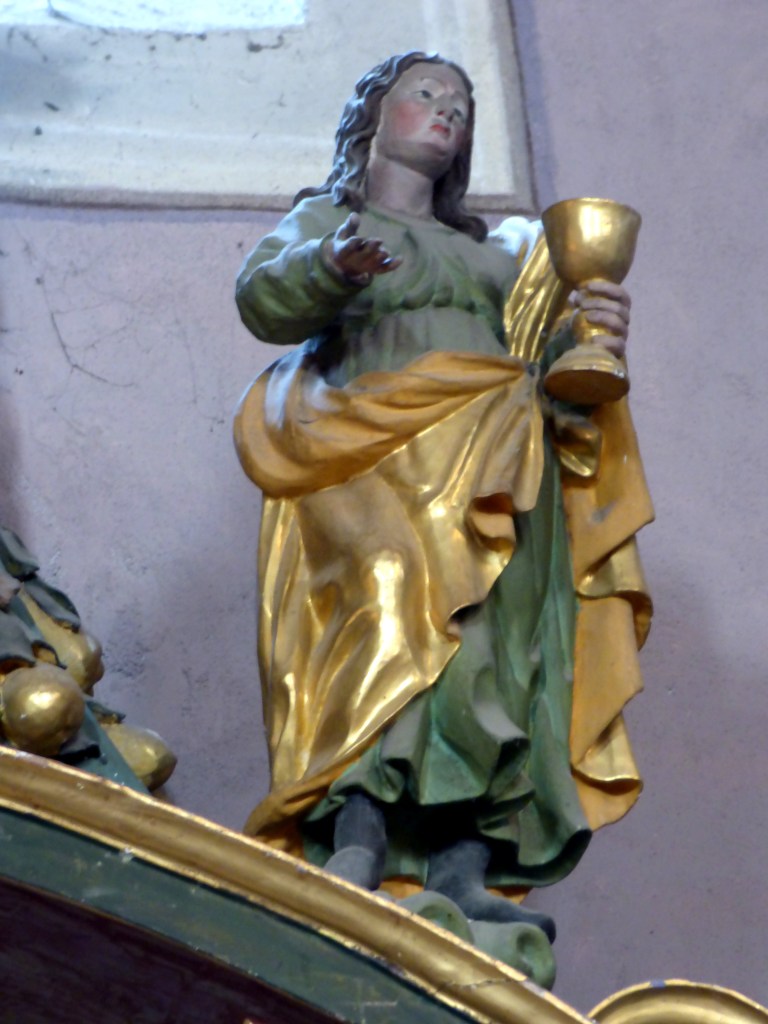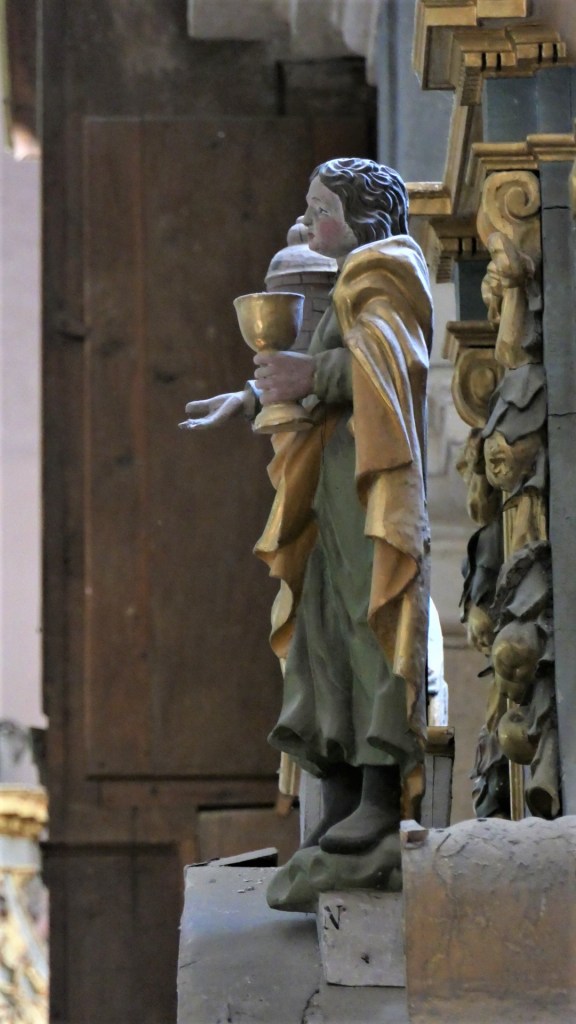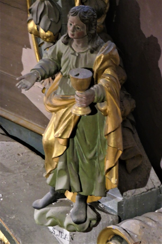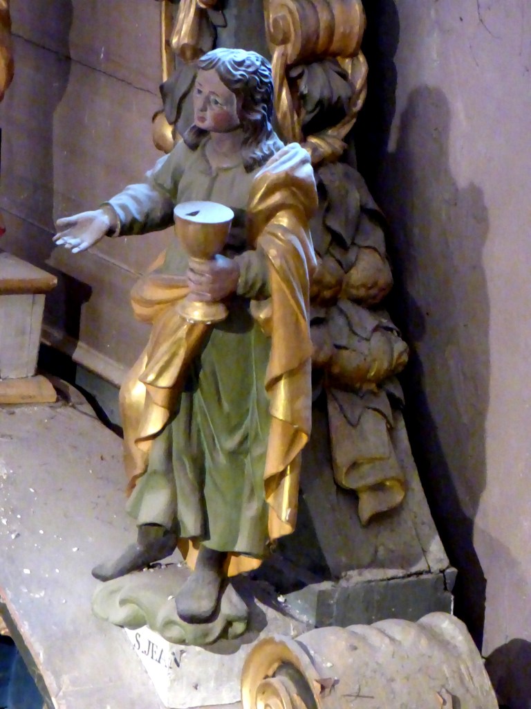 Saint-Jean, le disciple préféré de Jésus, celui à qui il confie sa mère à sa mort est présent dans toutes les églises. ( il est aussi sur la poutre de gloire et sur l’autel du rosaire)