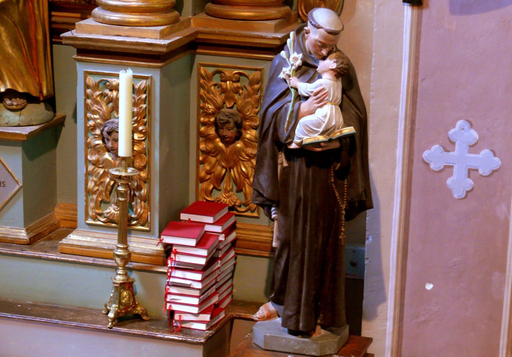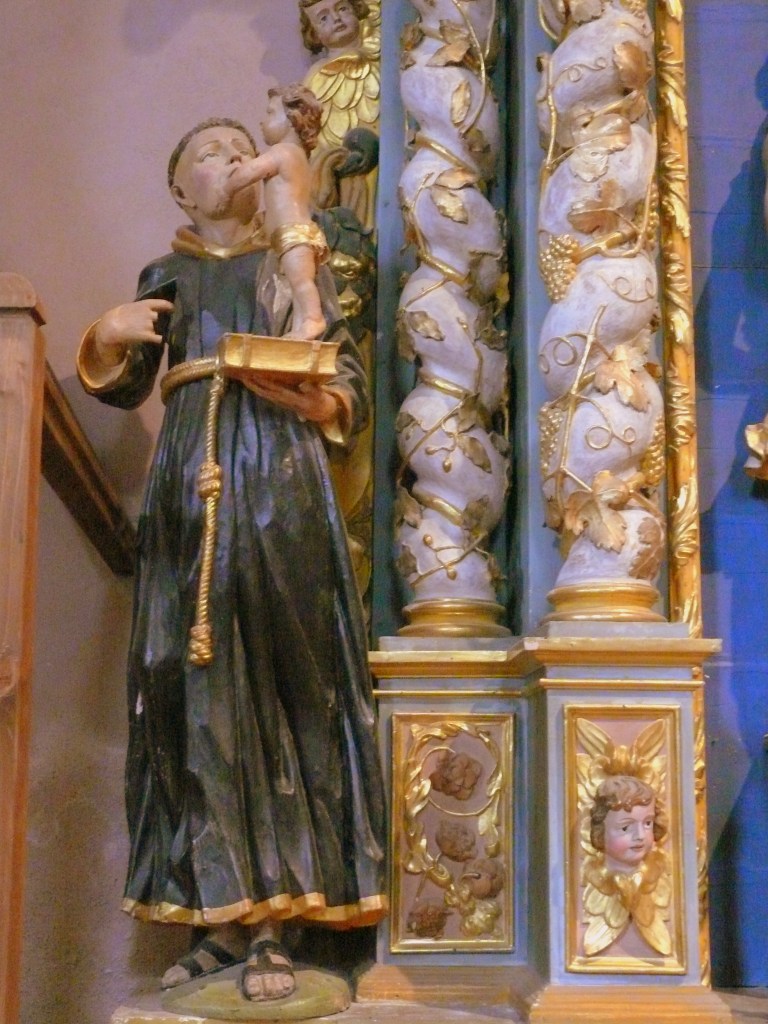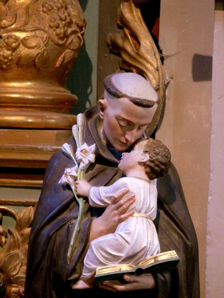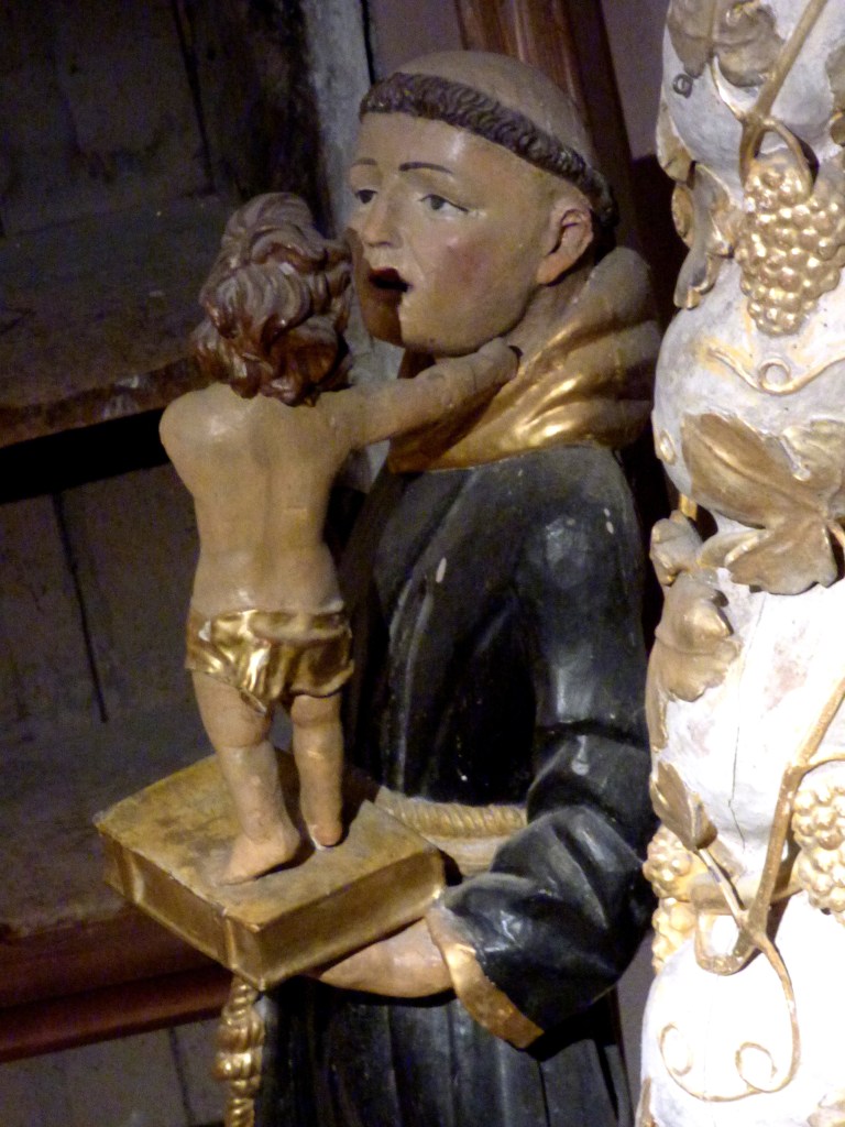 La théologie franciscaine est axée sur le christocentrisme, qui invite à réfléchir aux mystères de l‘humanité du Seigneur. Saint Antoine a par ailleurs été gratifié d’une apparition tenue secrète jusqu’à sa mort : il a tenu l’enfant Jésus dans ses bras. C’est ainsi qu’il est donc représenté : dans son habit de bure de franciscain, la corde à trois nœuds et les sandales, l’enfant Jésus, bébé presque nu, debout sur un livre lui caresse la joue d’une main. (Dans la nef il y a une autre statue de St Antoine de Padoue, plus récente mais reprenant exactement les mêmes thèmes : l’enfant est un peu plus âgé, il est assis sur le livre, comble le saint de caresses et tient une leur de lis, fleur mariale)
