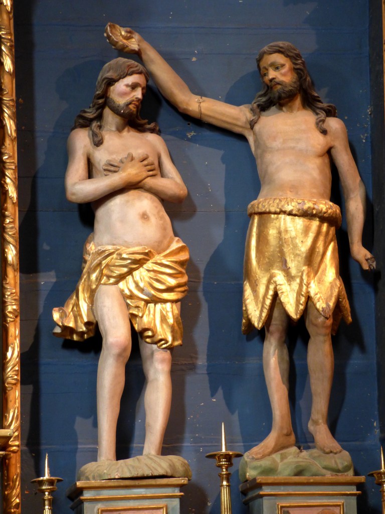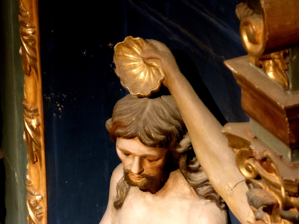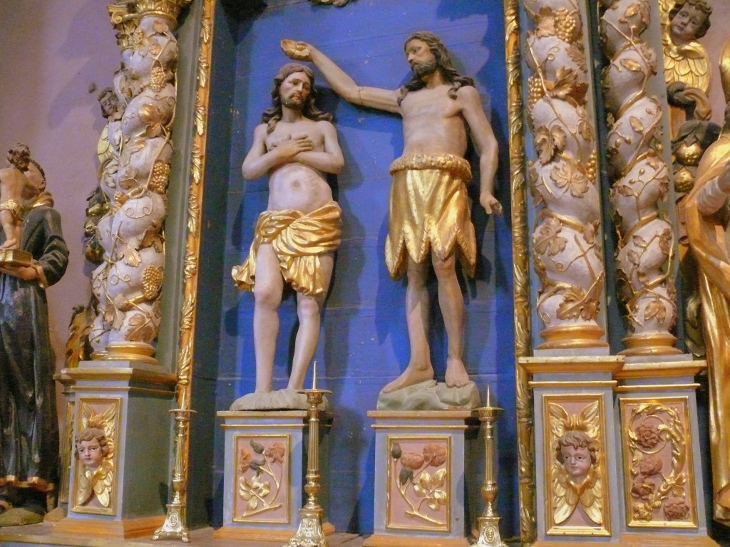 Jésus vécu vraisemblablement quelque temps en sa compagnie. Le retable montre son baptême par Jean-Baptiste, qui verse l’eau au moyen d’une coquille Saint-Jacques. Avant l’avènement du baroque, cette coquille était une simple coupe de poterie.