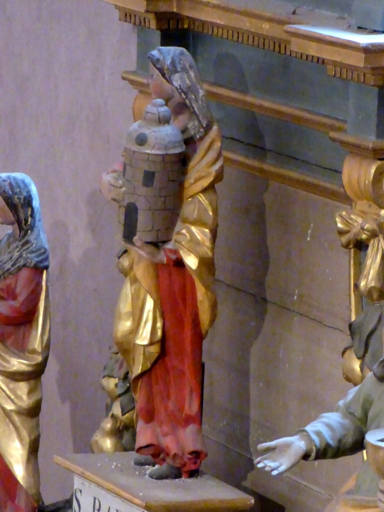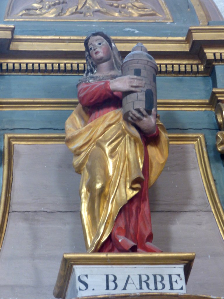 Comme sainte Marguerite, sainte Agnès, Sainte Barbe fait partie de ces jeunes filles martyrisées sous l’empire romain. Elle est née dans l’actuelle Asie Mineure. Elle refuse le fiancé que son père lui destine : celui-ci l’enferme dans une tour à deux fenêtres. Elle trouve le moyen d’y être baptisée et perce une troisième fenêtre dans le mur pour représenter la Sainte Trinité. (Ici le troisième fenêtre est un oculus)