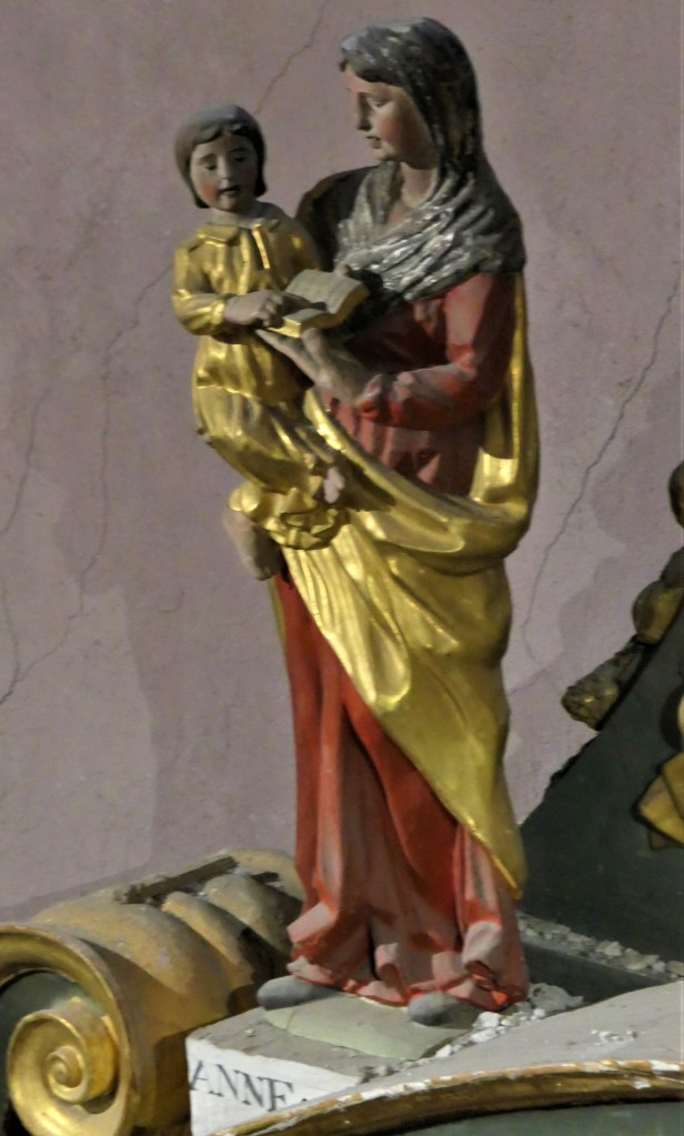 Sainte Anne, maman de la vierge Marie, tient dans sa fille dans ses bras droit et un livre de sa main gauche.