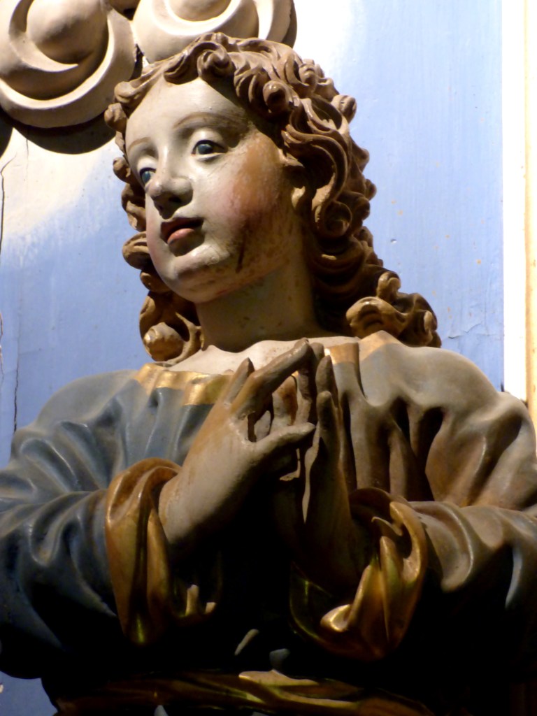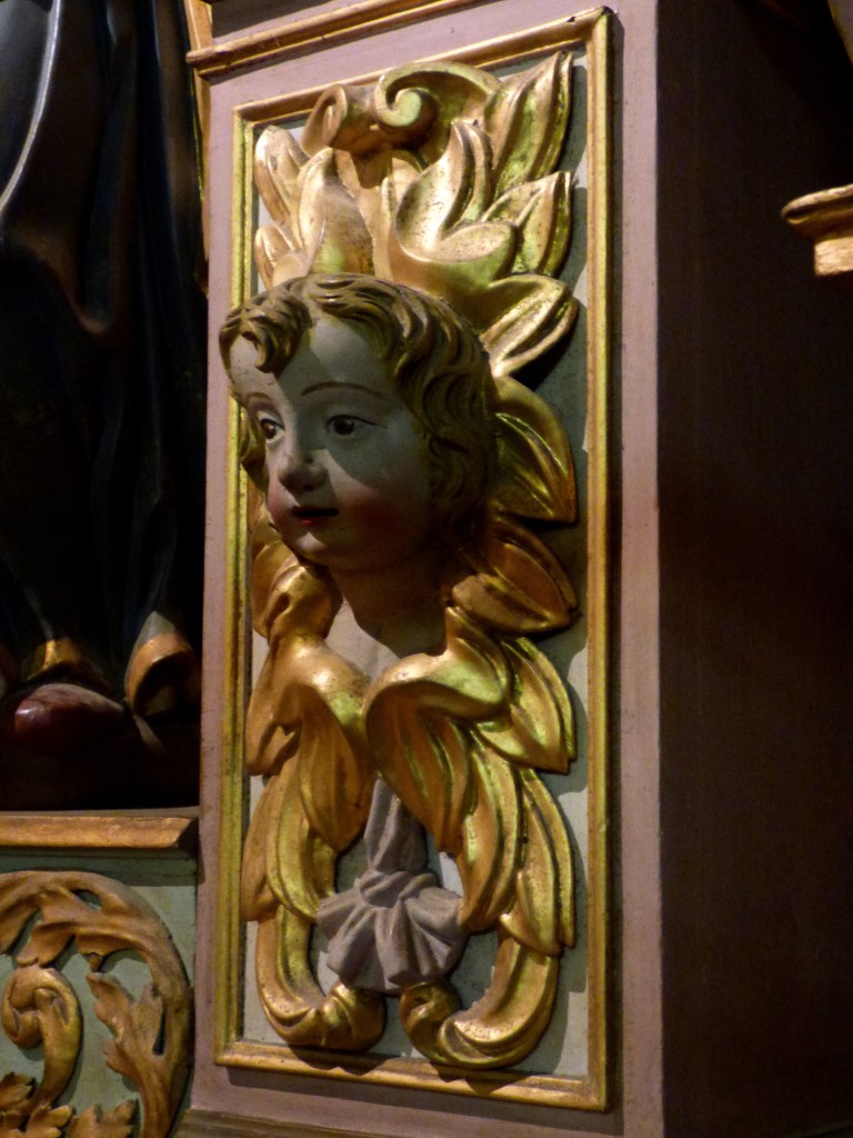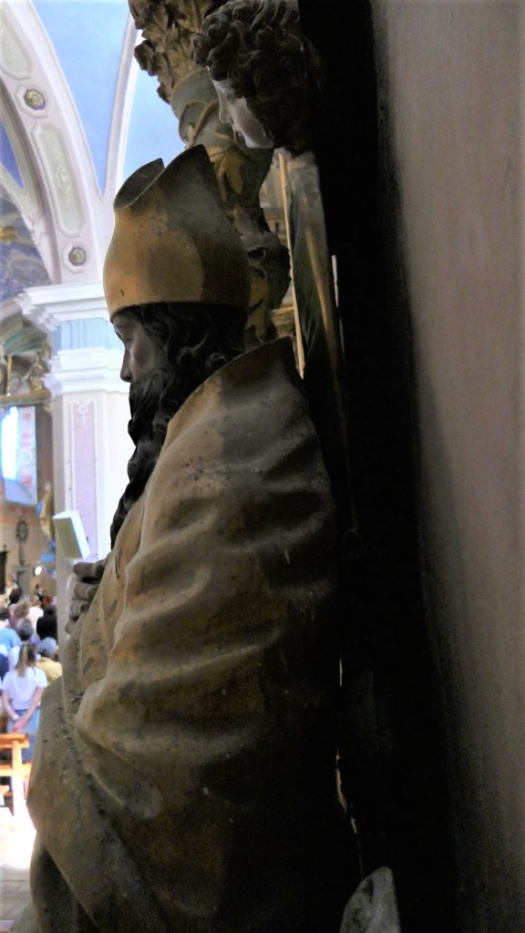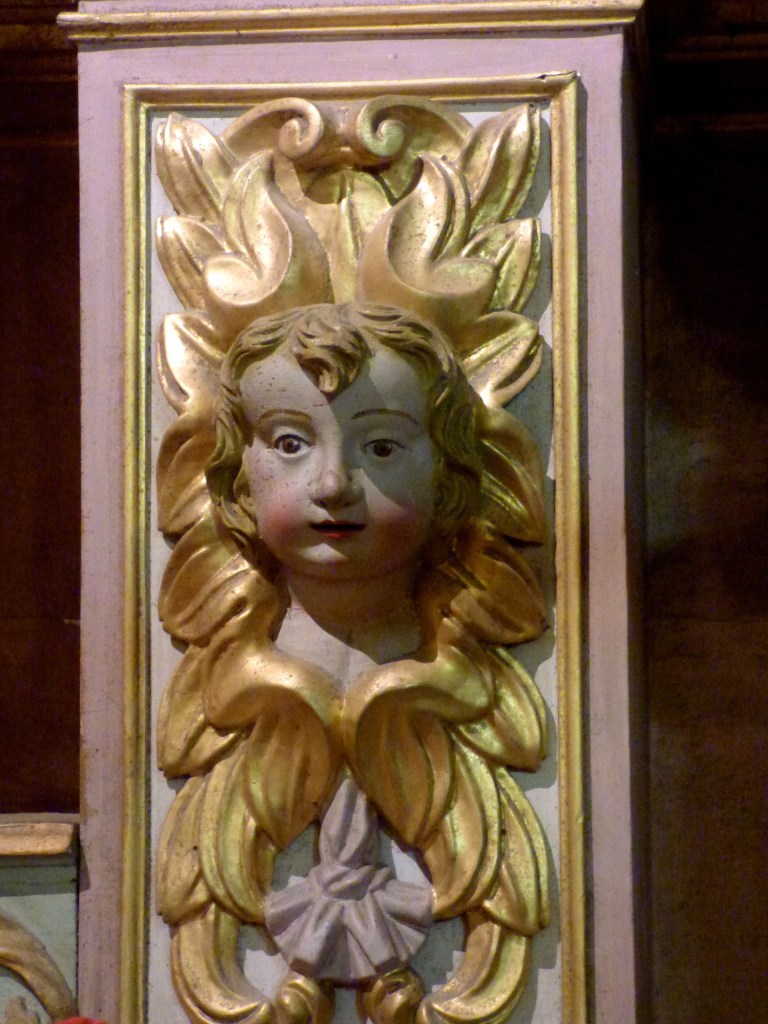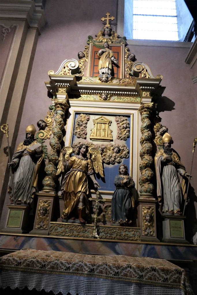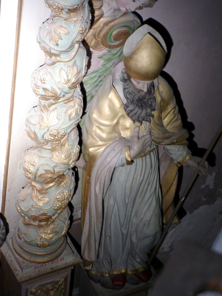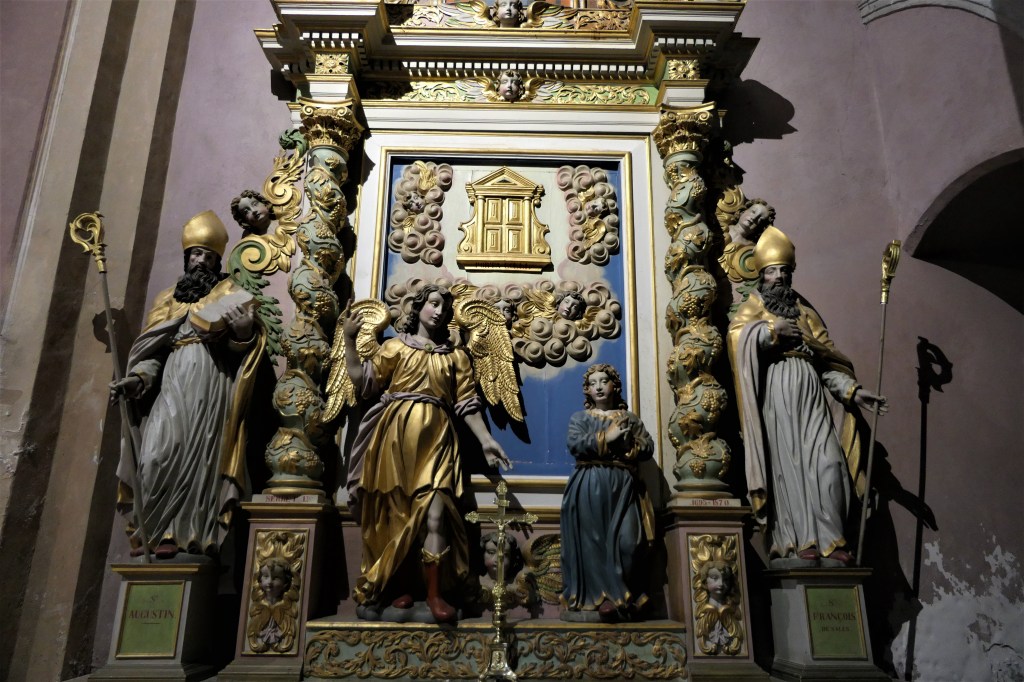 De l’autre côté du retable : un autre docteur de l’église , de 1200 ans plus proche de nous : Saint François de sales. Même attitude, même expression du visage : sans doute même modèle pour les deux formidables évêques…qui rappellent beaucoup les Saints du retable de St Antoine. Sans doute même sculpteur !