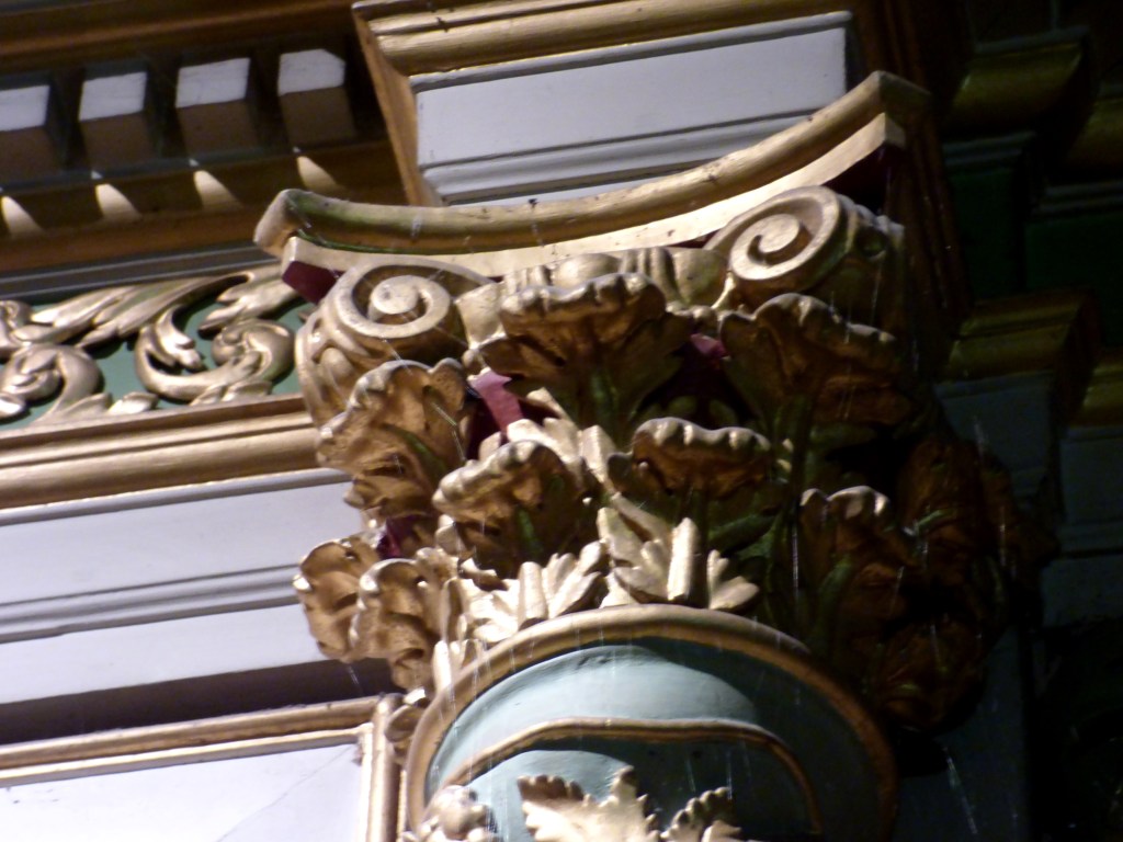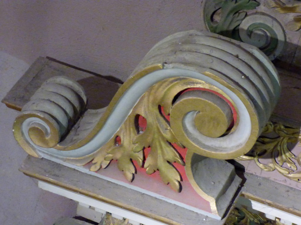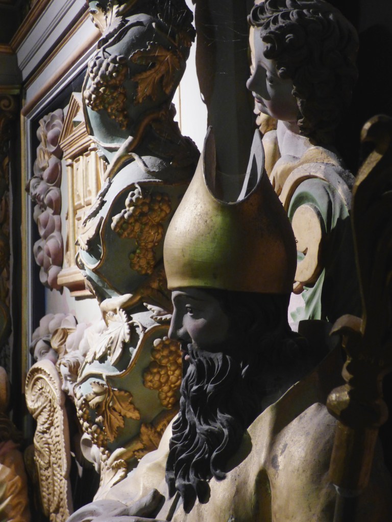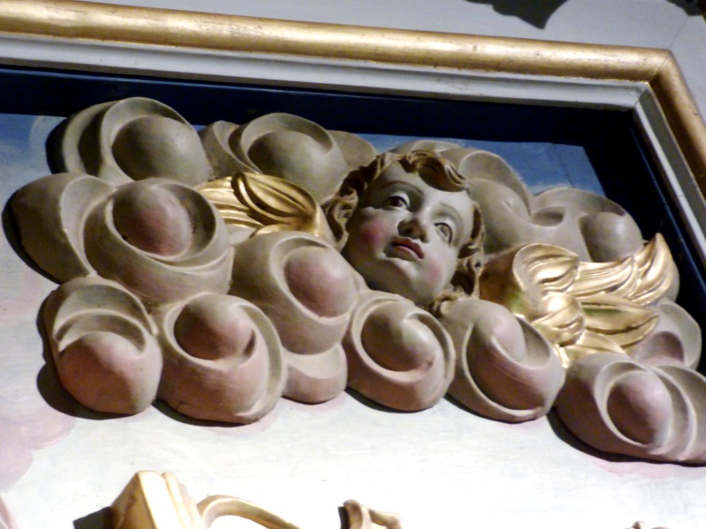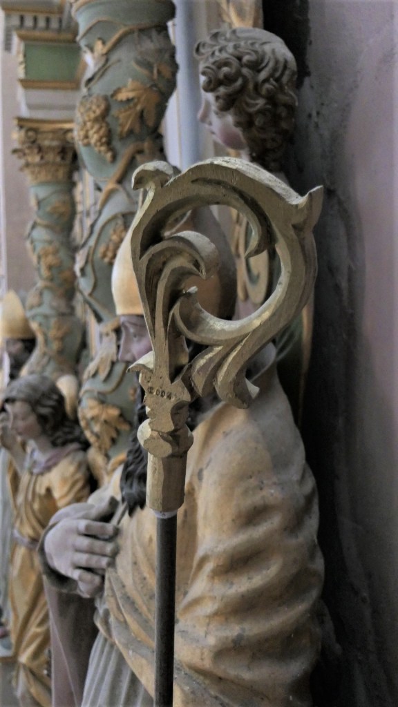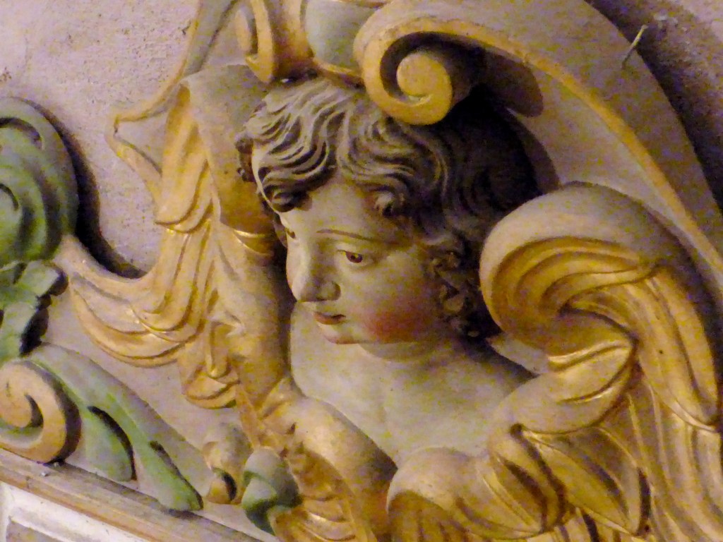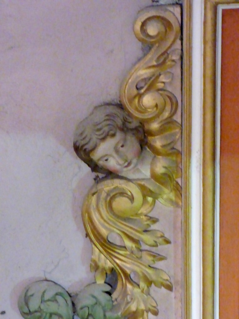 De l’autre côté du retable : un autre docteur de l’église , de 1200 ans plus proche de nous : Saint François de sales. Même attitude, même expression du visage : sans doute même modèle pour les deux formidables évêques…qui rappellent beaucoup les Saints du retable de St Antoine. Sans doute même sculpteur !