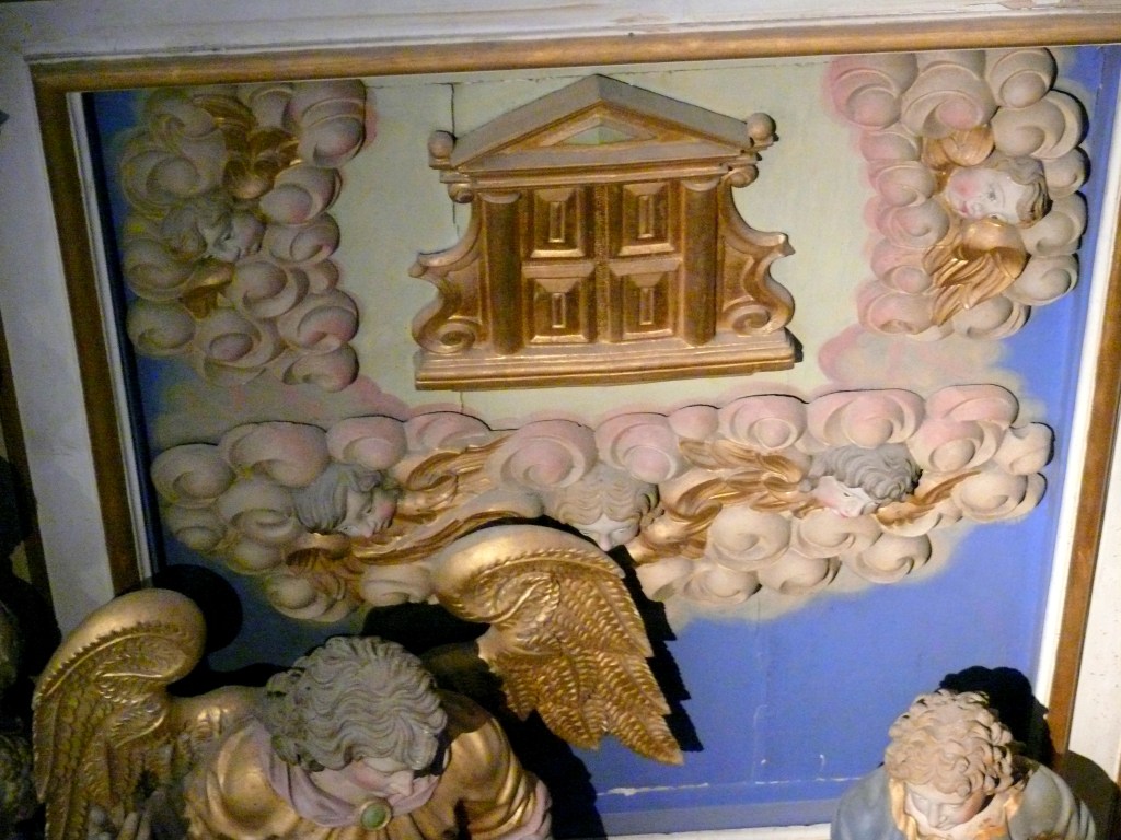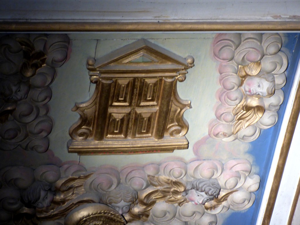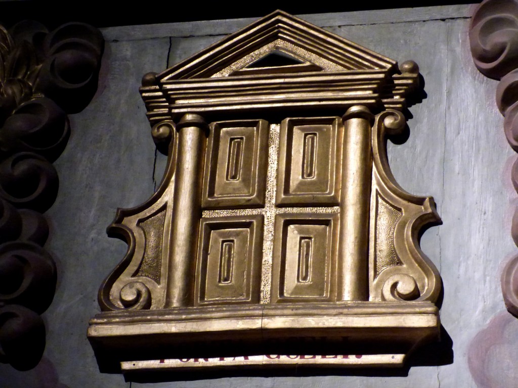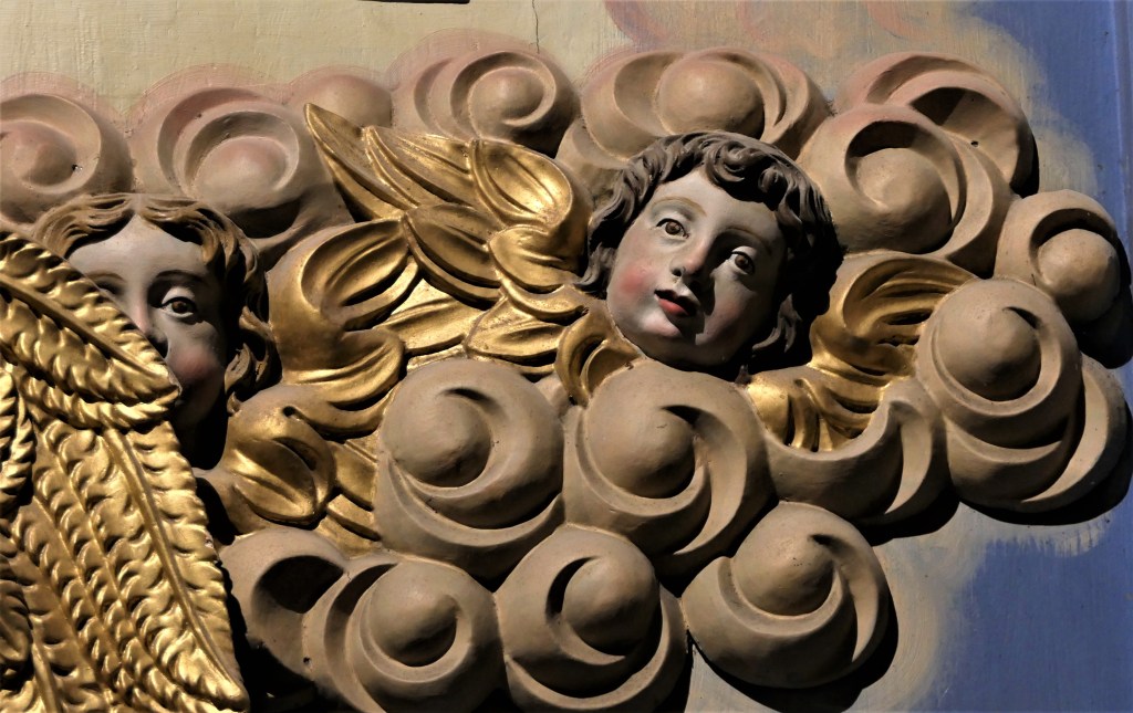 On commence par ne voir que la superbe porte du ciel : bien dorée, bien lumineuse dans ses nuages potelés où volètent des angelots , mais porte finalement…bien fermée, pour une porte du paradis, ou porte du ciel, porta coeli. C’est un thème bien énigmatique dans un retable finalement consacré à la pauvreté, à l’exil, aux longues marches, à l’espoir d’aides imprévues.