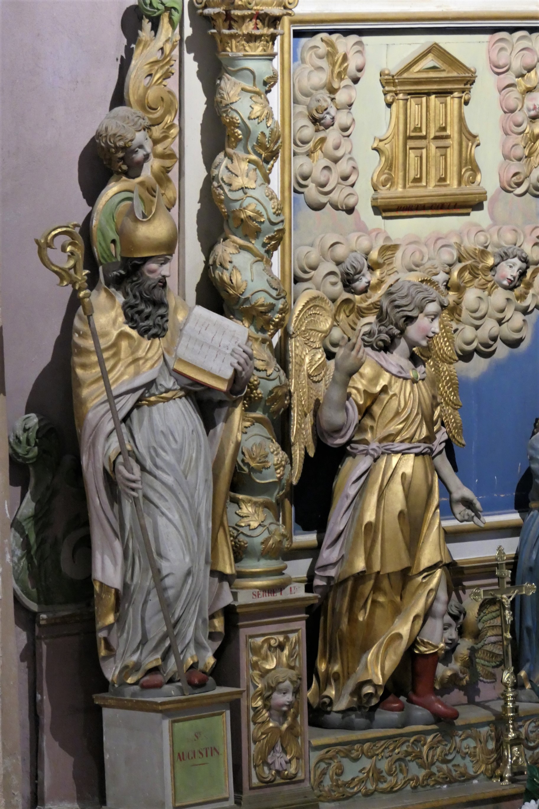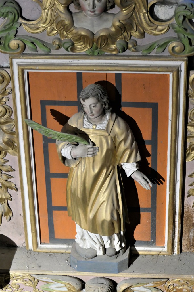 docteur de l’église, mort en 430 à Hippone (actuelle Algérie) est avec St Ambroise de Milan, St Jérôme de Stridon et St Grégoire le Grand, l’un des quatre Pères de l’Église occidentale et le premier des docteurs de l’Église. Ces 4 docteurs sont presque systématiquement représentés dans les églises baroques, le plus souvent tous ensemble. Pourquoi St Augustin est-il seul sur ce retable ? Peut-être pour souligner la valeur du martyre de St Laurent puisqu’il a écrit :