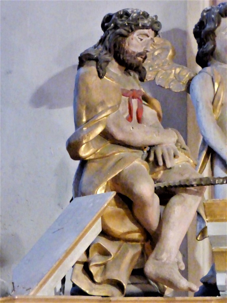 Un Ecce Homo sur le plan artistique est une représentation de Jésus ayant subit l’outrage d’être fouetté et moqué. Il est souvent debout mais le monde latin le représente plutôt accroché à une demi colonne, le dos rayée par les coups de fouets. Ici son trône est changé pour une barre sur laquelle il est presque impossible de se tenir assis. Son visage exprime la plus complète affliction.