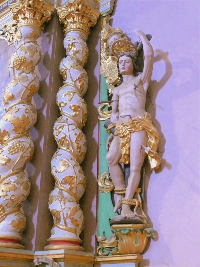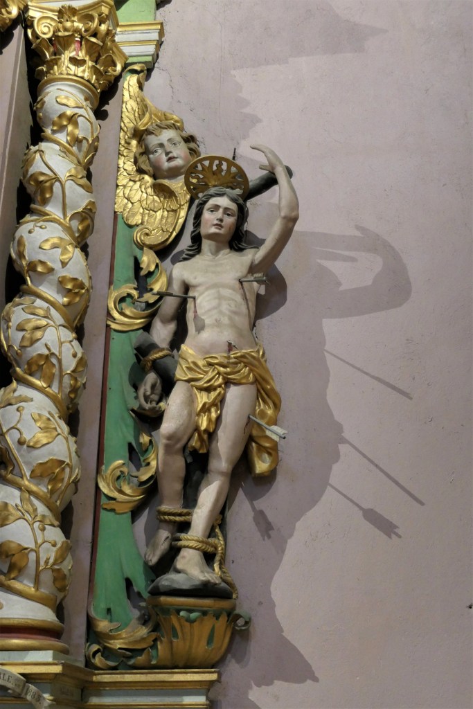 Sébastien est né à Narbonne en Gaule au 3ème siècle. Il a un parcours similaire à celui de St Maurice : brillant militaire de carrière, il n’échappe pas à la persécution. Pour avoir soutenu ses coreligionnaires dans leur foi et accompli plusieurs miracles, il subit le martyre. Attaché à un poteau et transpercé de flèches, il survit. On l’exécutera donc à coups de verges.