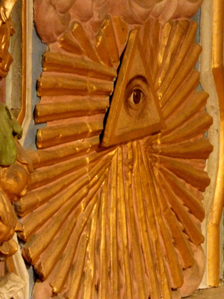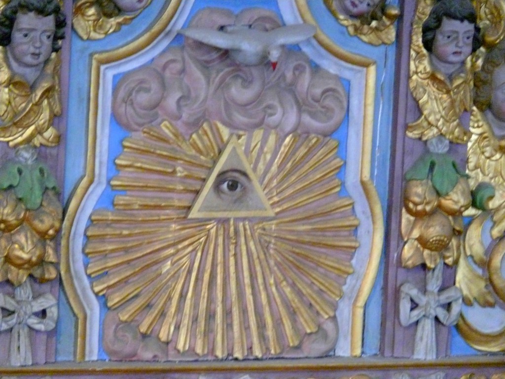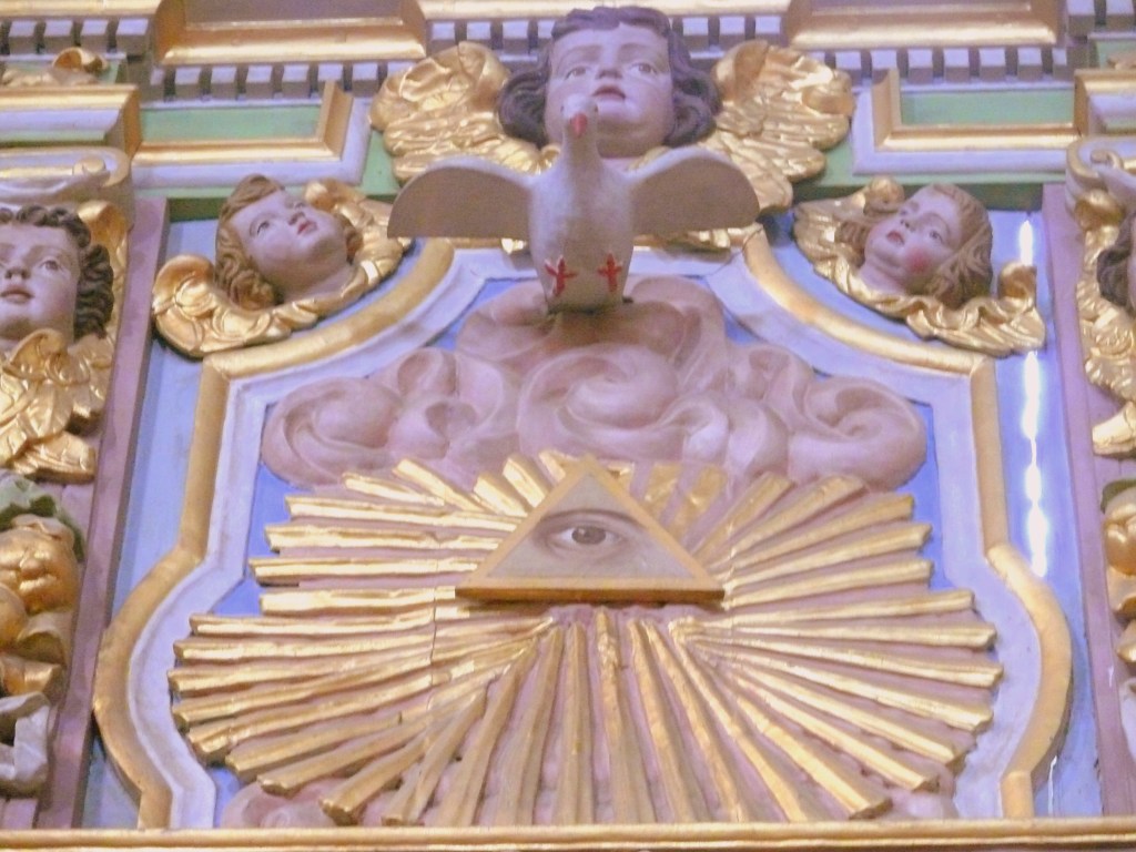 Ici nous avons, sous une colombe du Saint Esprit, un triangle au milieu d’une gloire (rayons d’or). Au centre du triangle, l’œil de Dieu. On appelle ce motif iconographique L’œil de la Providence ou l’« œil omniscient »