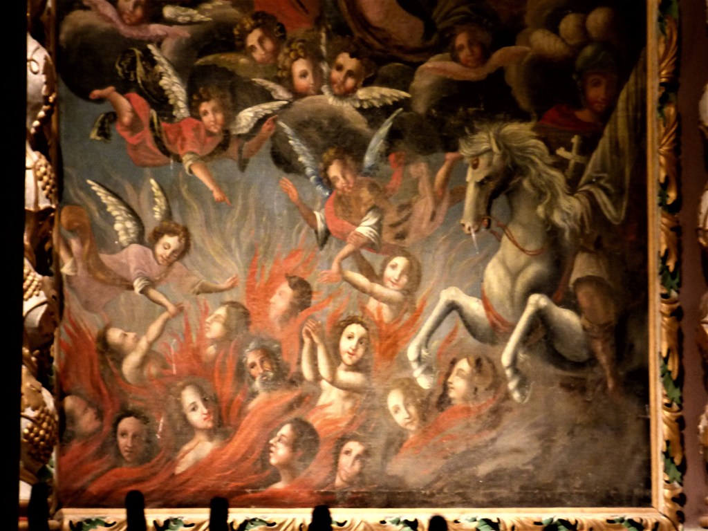 On y voit des paroissiens souriants dans le brasier et on devine un mouvement qui les aspire vers le ciel, peut-être pour bien signifier qu’il ne s’agit pas de l’enfer mais bien d’un lieu d’où l’on va s’échapper.