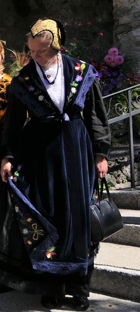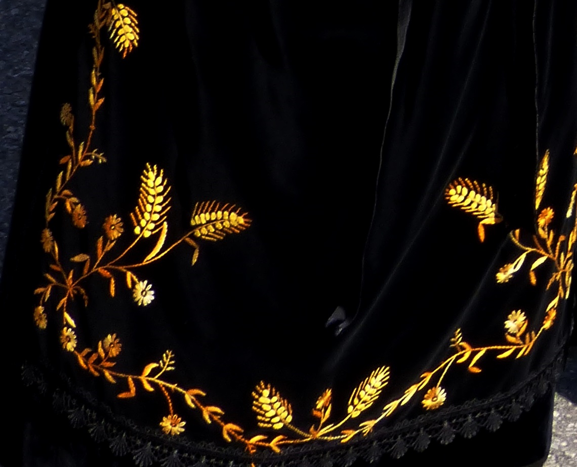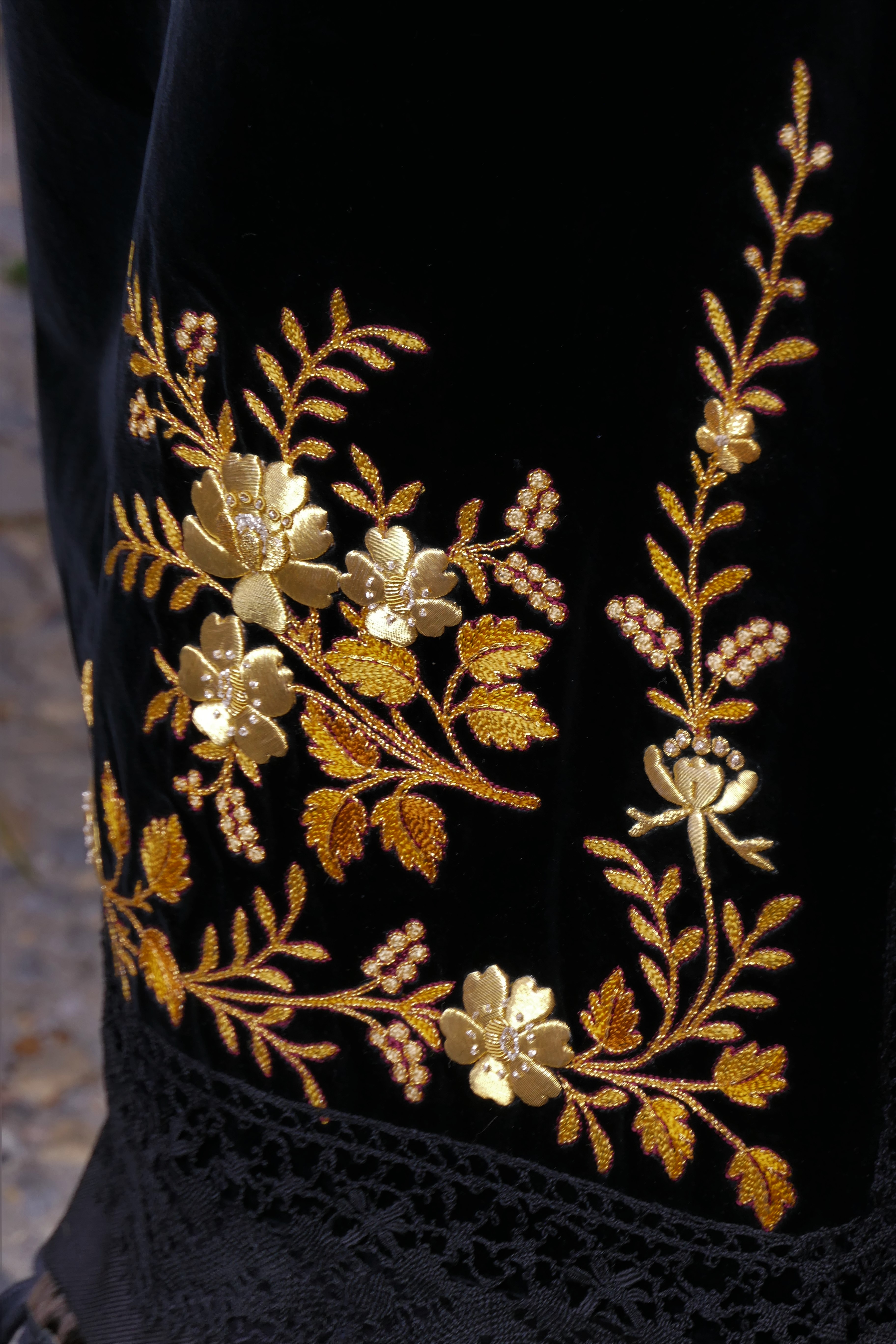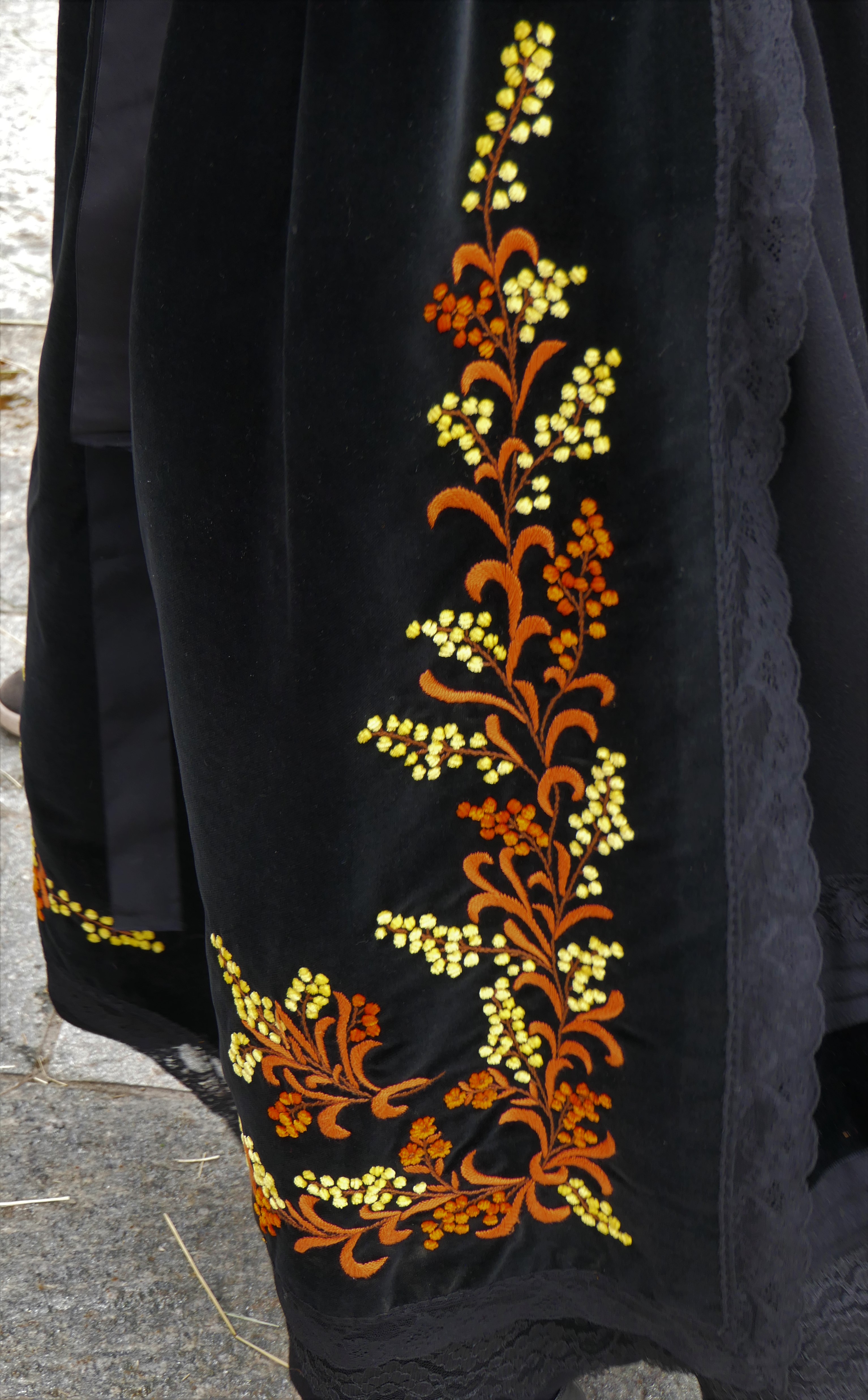 Le tablier est la plupart du temps assorti au châle, ou bien reste noir : multiple motifs tissés.