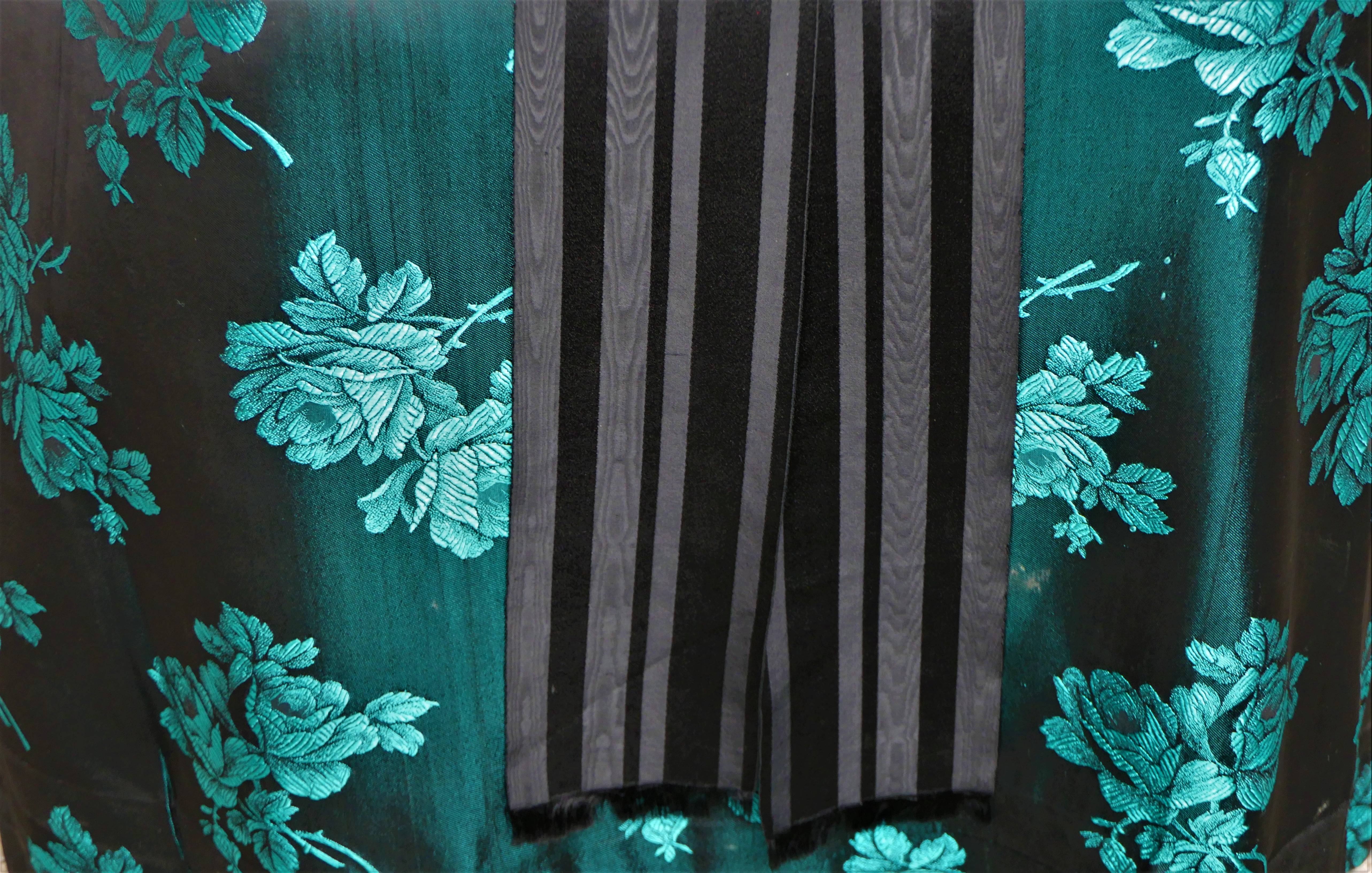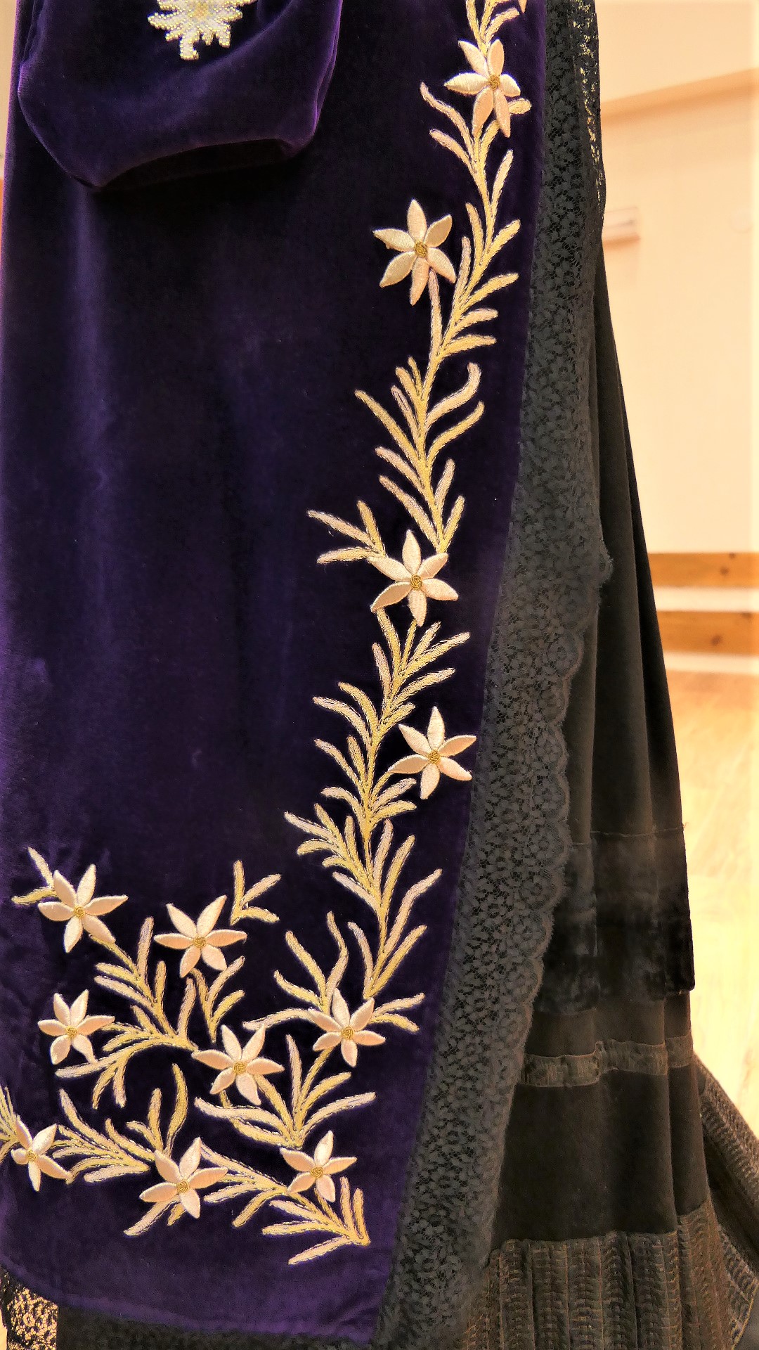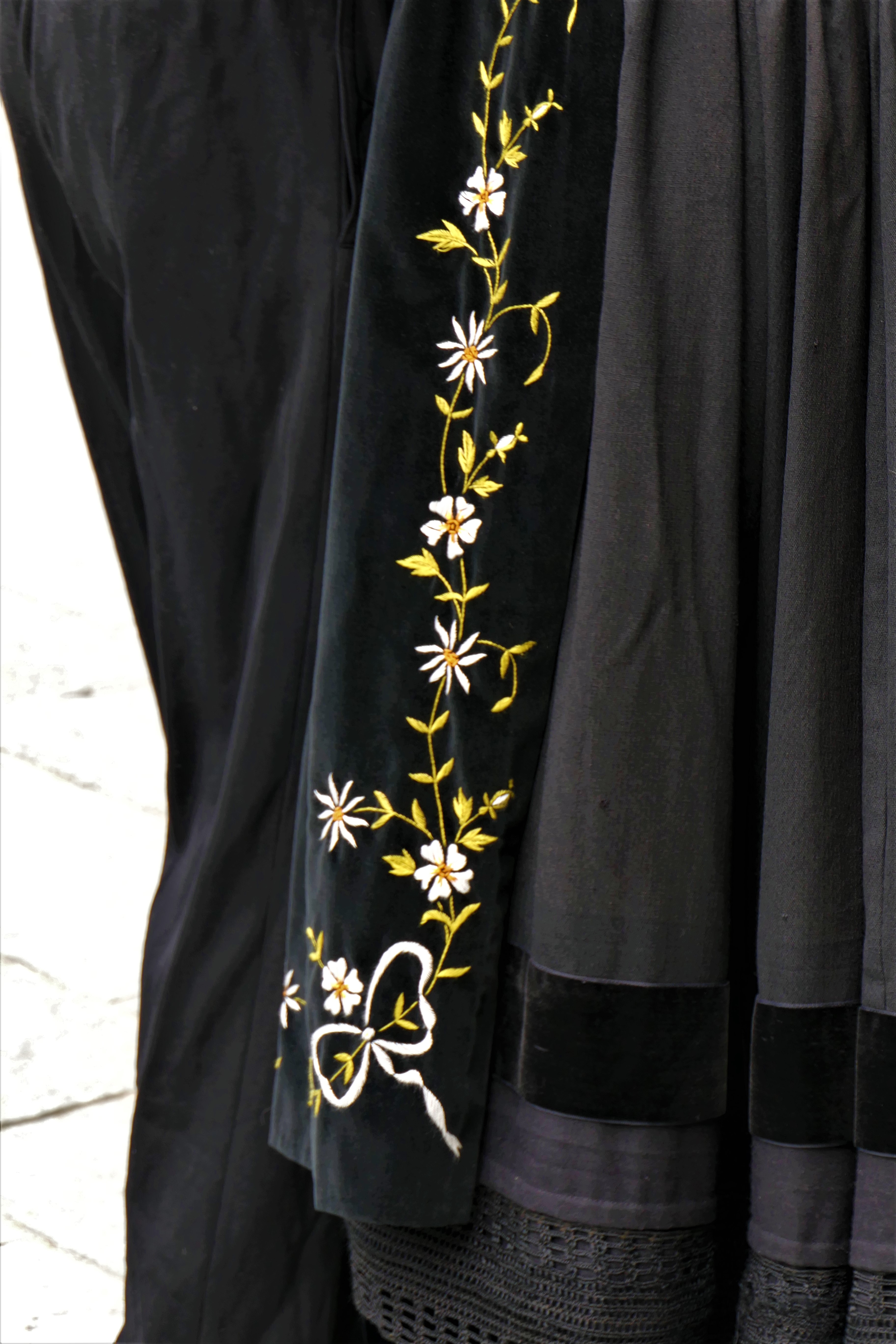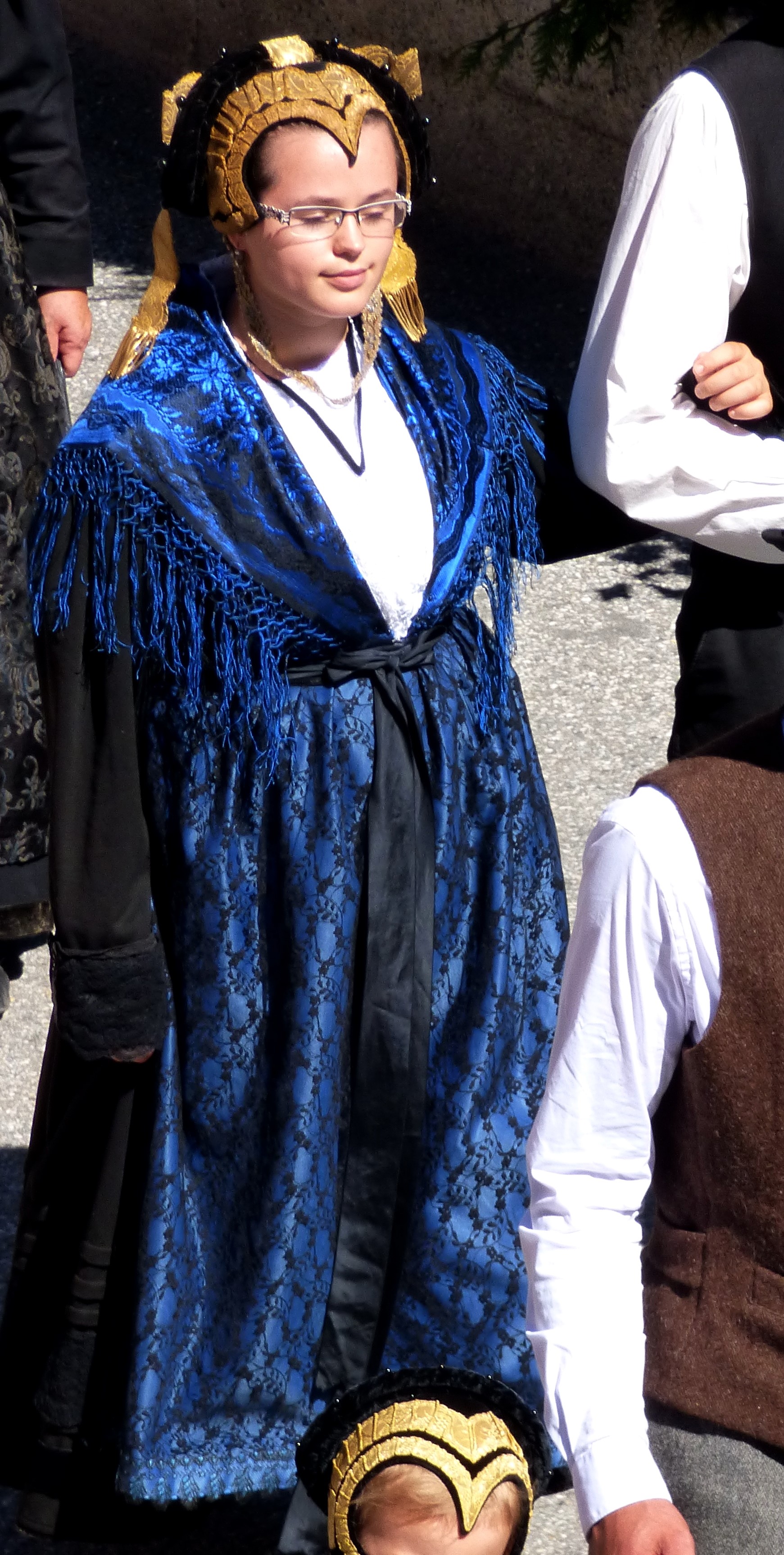 Le tablier est la plupart du temps assorti au châle, ou bien reste noir : multiple motifs tissés.
