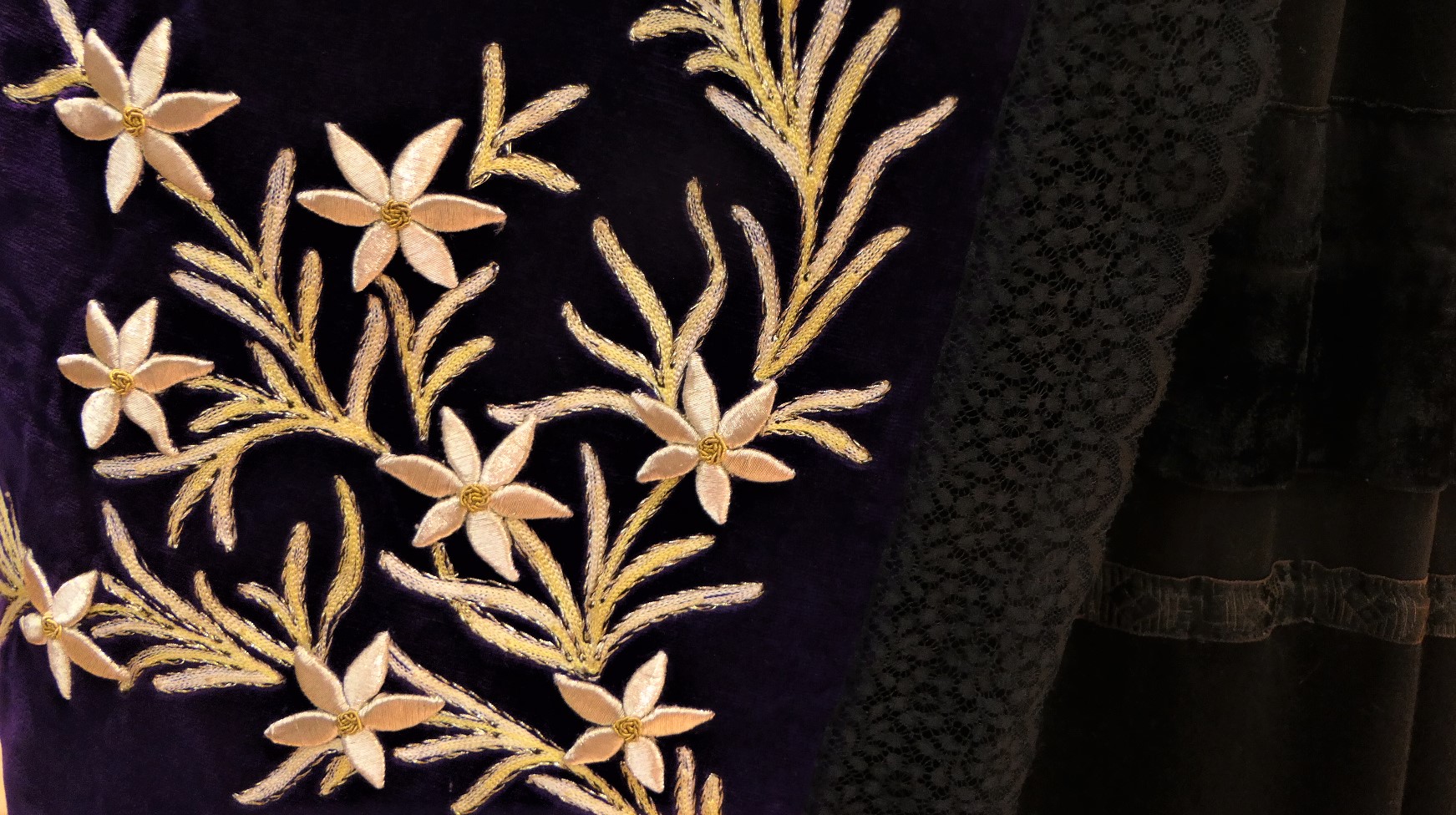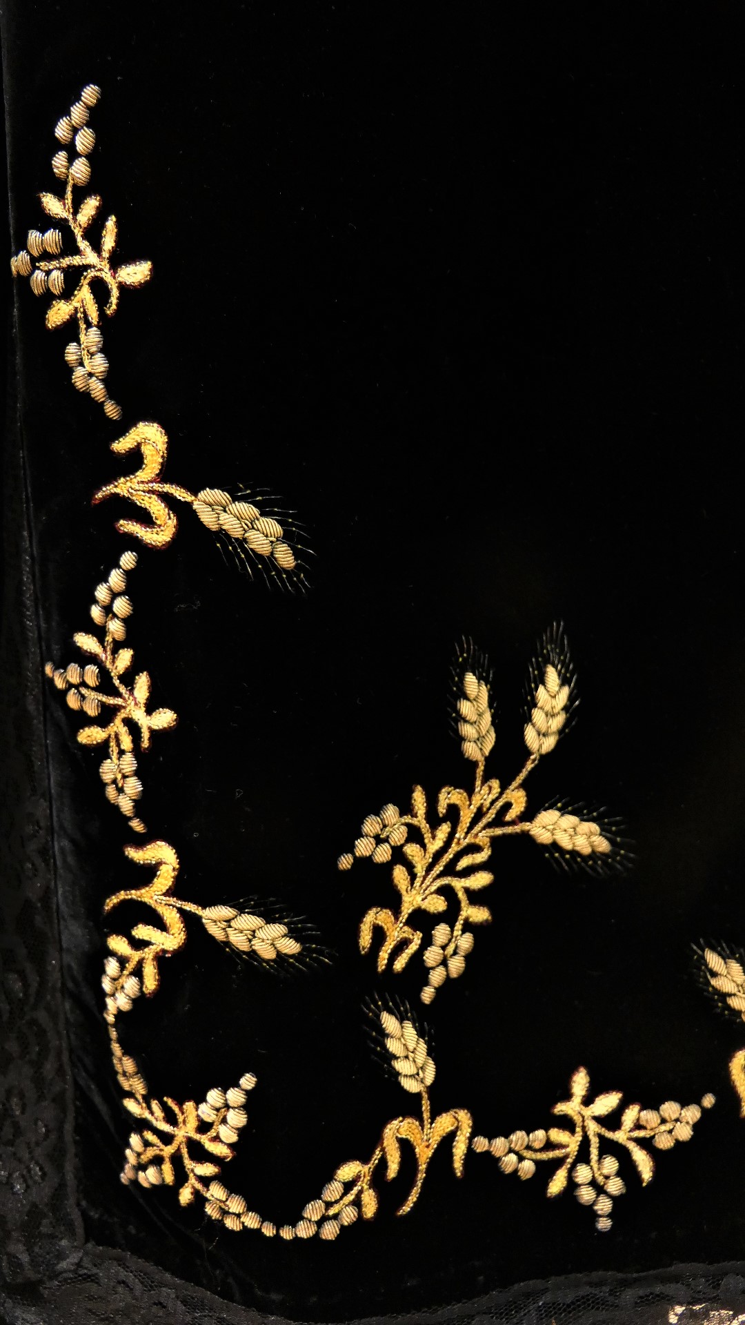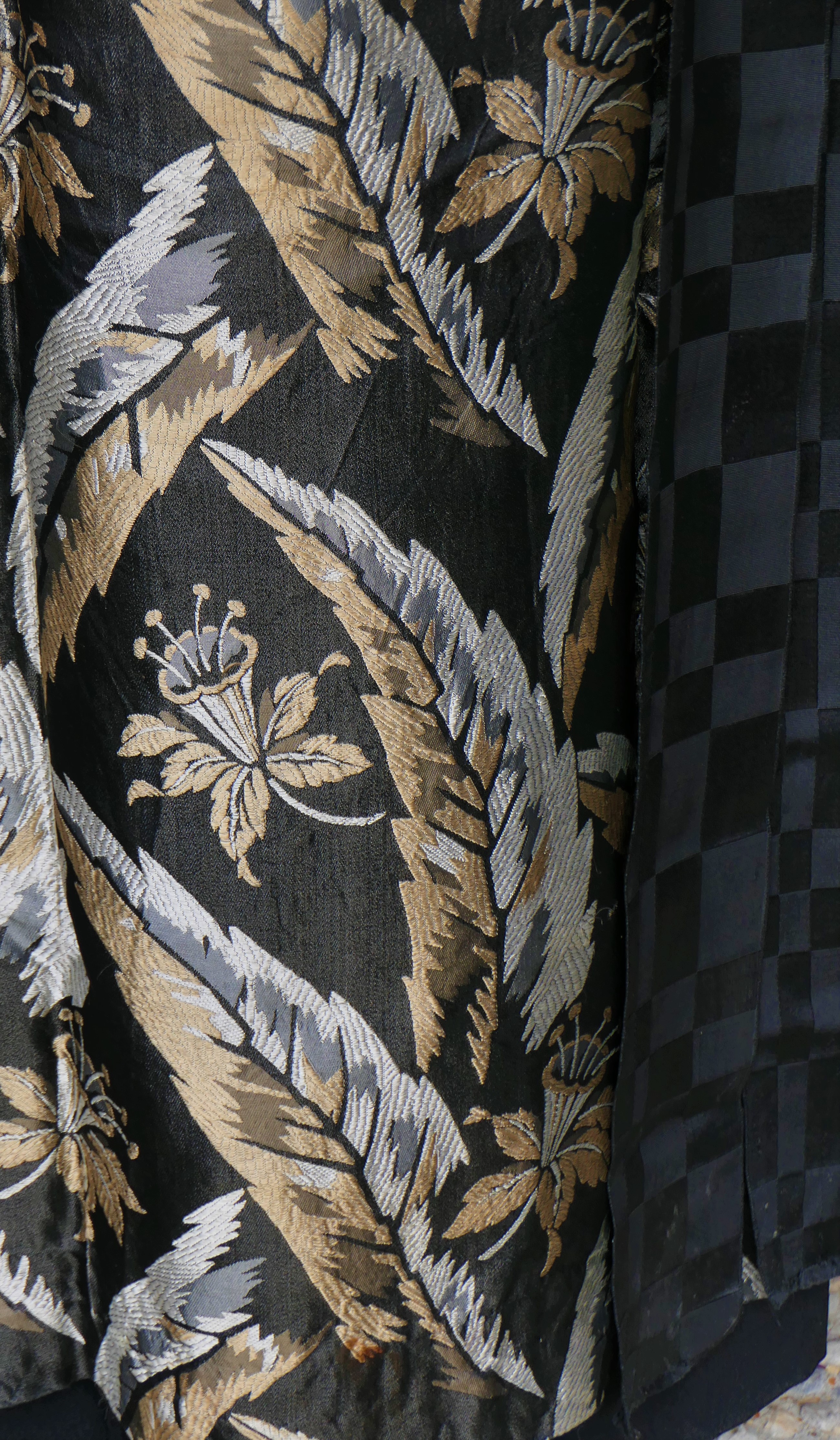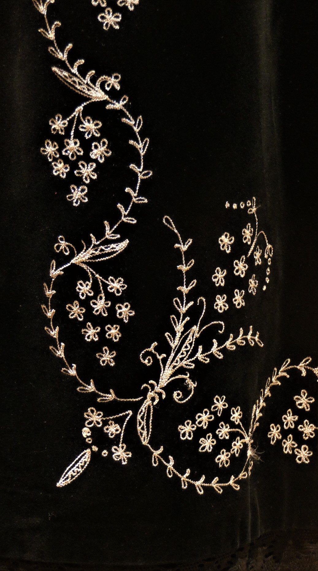 Le tablier est la plupart du temps assorti au châle, ou bien reste noir : multiple motifs tissés.