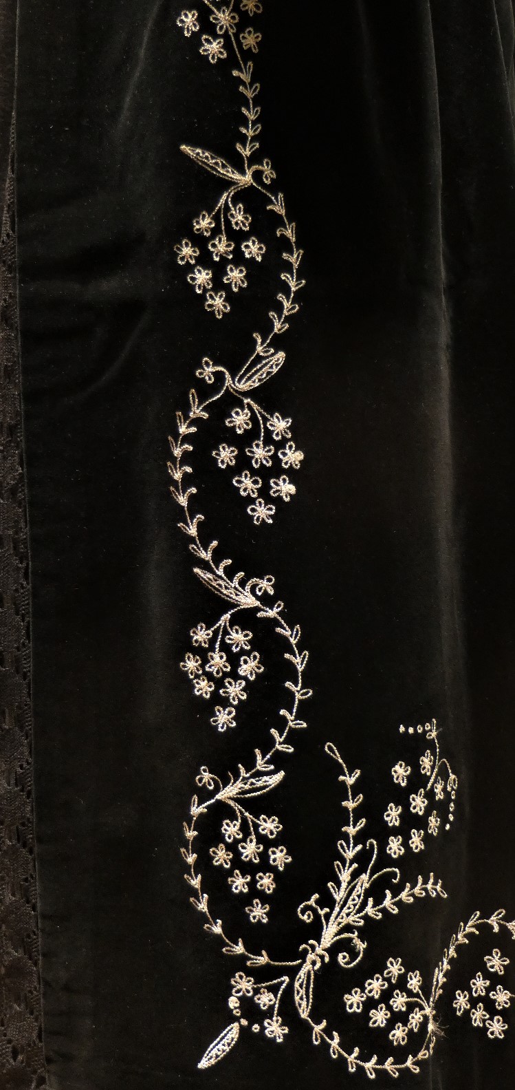 large et fronçé, il occupe tout le devant de la robe. Il est agrémenté d’un large noeud de moire ou de soie qui prend la taille.