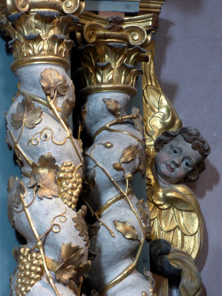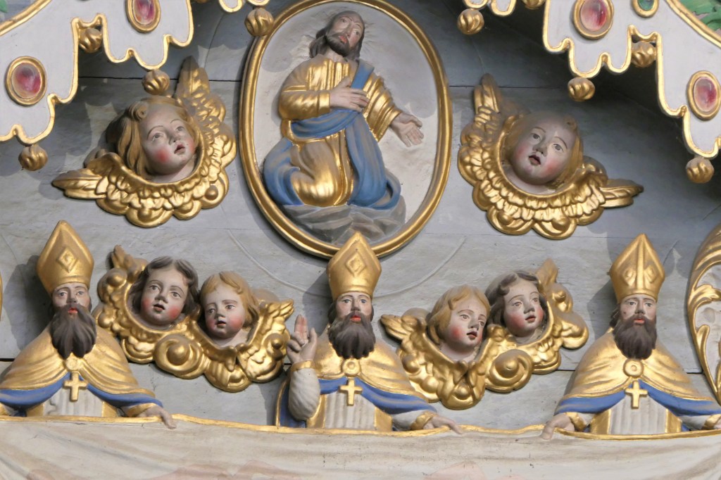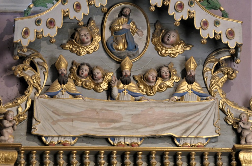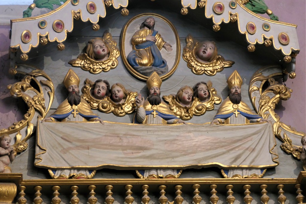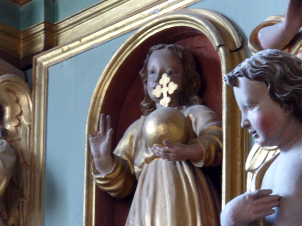 En attique, deux anges porte-colonne entourent le jeune Jésus qui tient le globe terrestre, un ange sur chaque aile du fronton brisé, Saint Maurice à droite, … à gauche