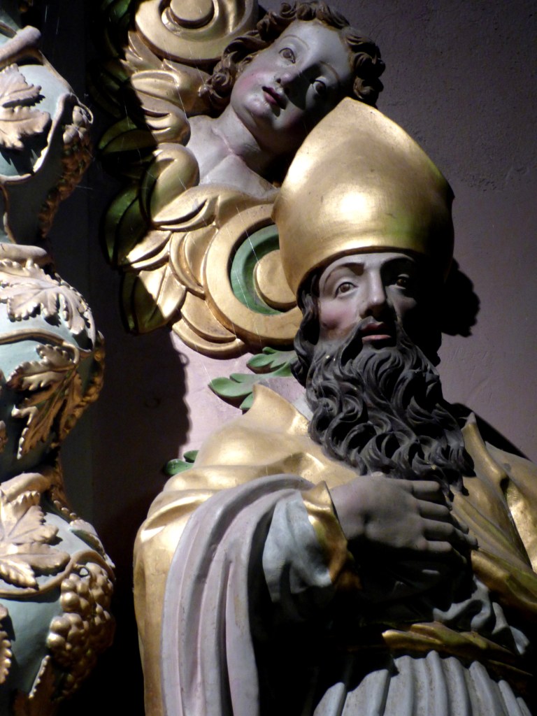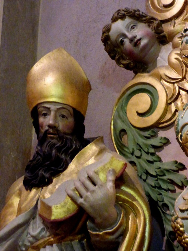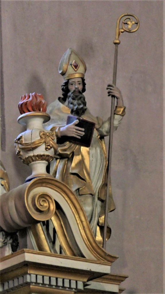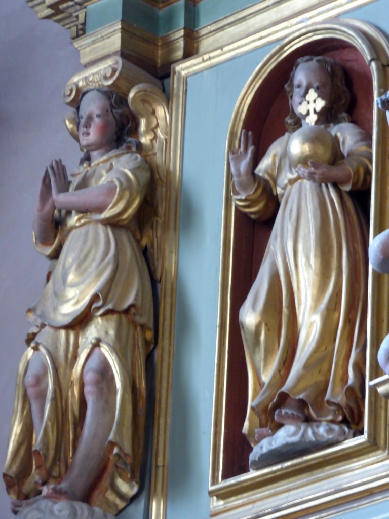 En attique, deux anges porte-colonne entourent le jeune Jésus qui tient le globe terrestre, un ange sur chaque aile du fronton brisé, Saint Maurice à droite, … à gauche
