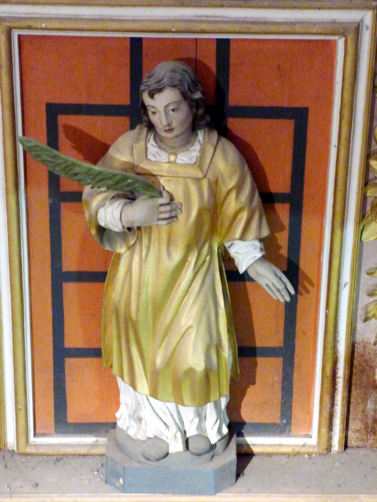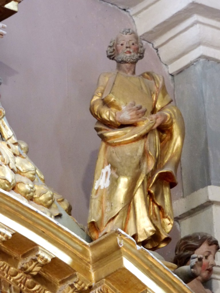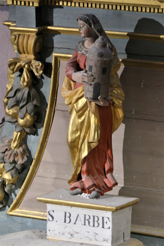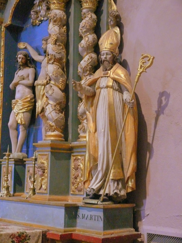 A droite Saint Martin, à gauche Saint Antoine de Padoue. En attique : Sainte Anne, Sainte Barbe et Saint Jean l’évangéliste.