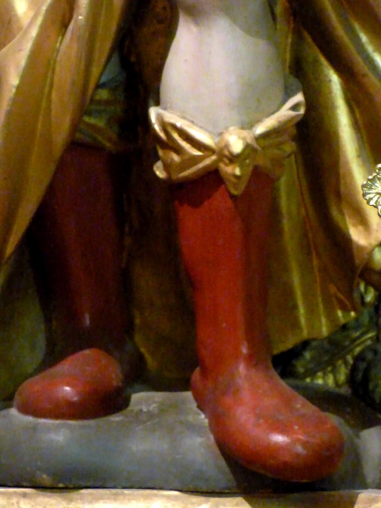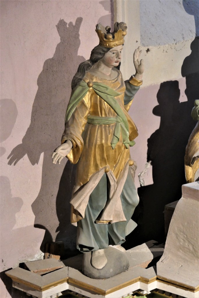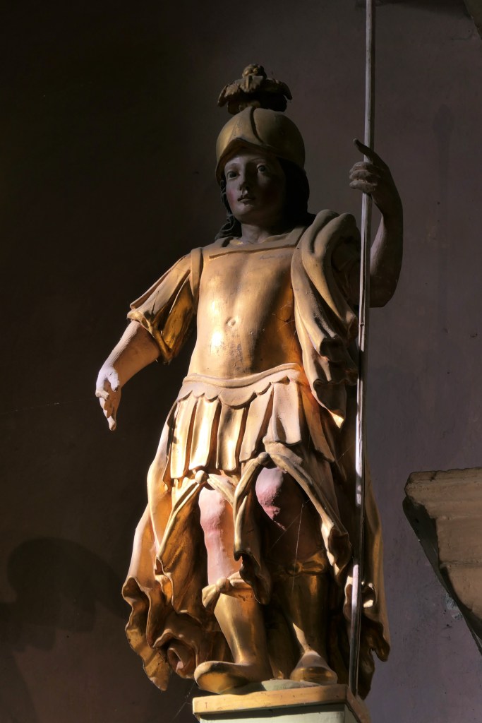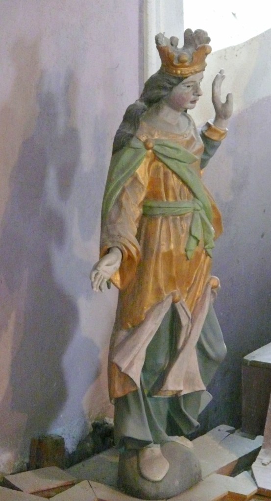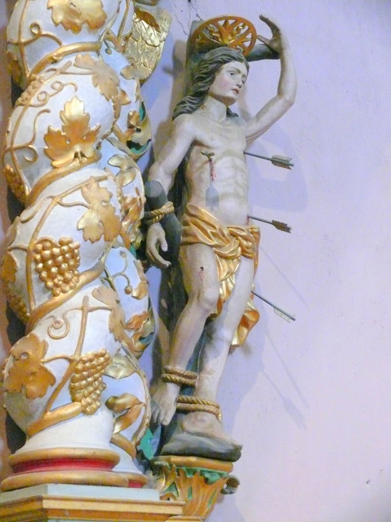 A droite Saint Martin, à gauche Saint Antoine de Padoue. En attique : Sainte Anne, Sainte Barbe et Saint Jean l’évangéliste.